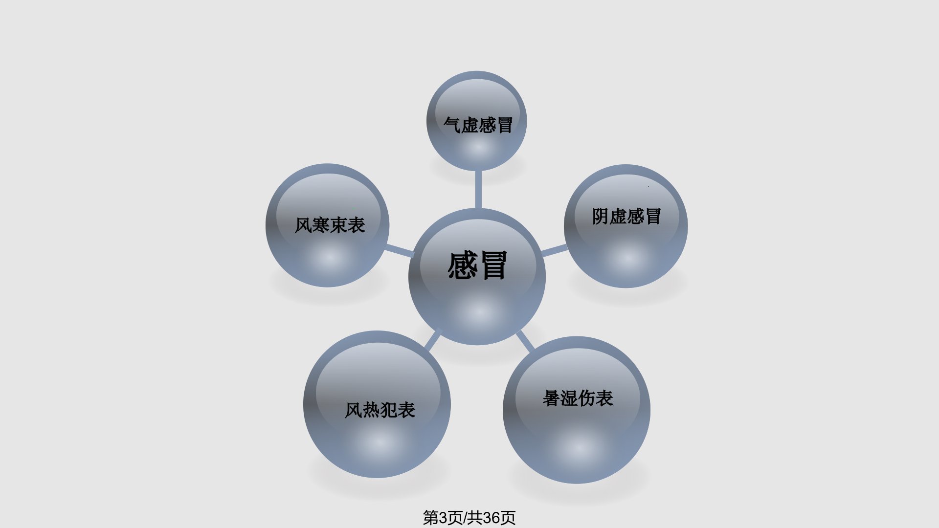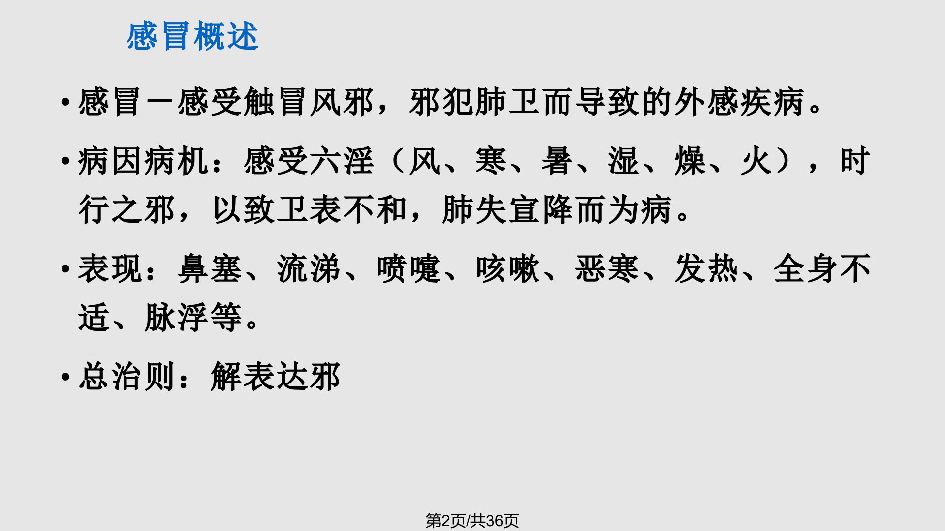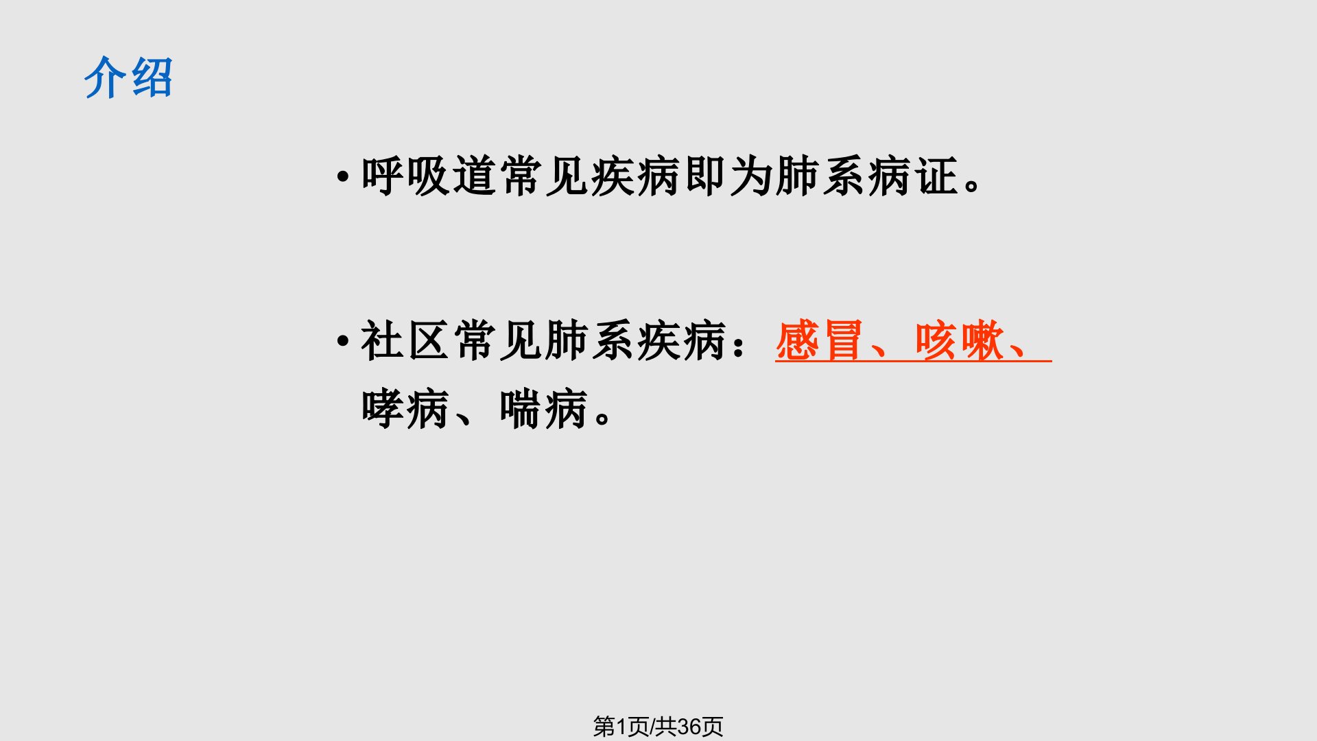 介绍呼吸道常见疾病即为肺系病证。社区常见肺系疾病:感冒、咳嗽、哮病、喘病。第1页/共36页感冒概述感冒-感受触冒风邪,邪犯肺卫而导致的外感疾病。病因病机:感受六淫(风、寒、暑、湿、燥、火),时行之邪,以致卫表不和,肺失宣降而为病。表现:鼻塞、流涕、喷嚏、咳嗽、恶寒、发热、全身不适、脉浮等。总治则:解表达邪第2页/共36页第3页/共36页鉴别第4页/共36页鉴别重轻轻重苔薄白苔黄舌边尖红浮紧浮数风寒感冒风热感冒恶寒发热舌象脉象第5页/共36页舌象第6页/共36页感冒证治分类1.风寒束表恶寒重,发热轻,无汗,头痛,肢体酸痛,鼻塞声重,或鼻痒喷嚏,时流清涕,咽痒咳嗽,痰吐稀薄色白,口不渴或渴喜热饮,...
