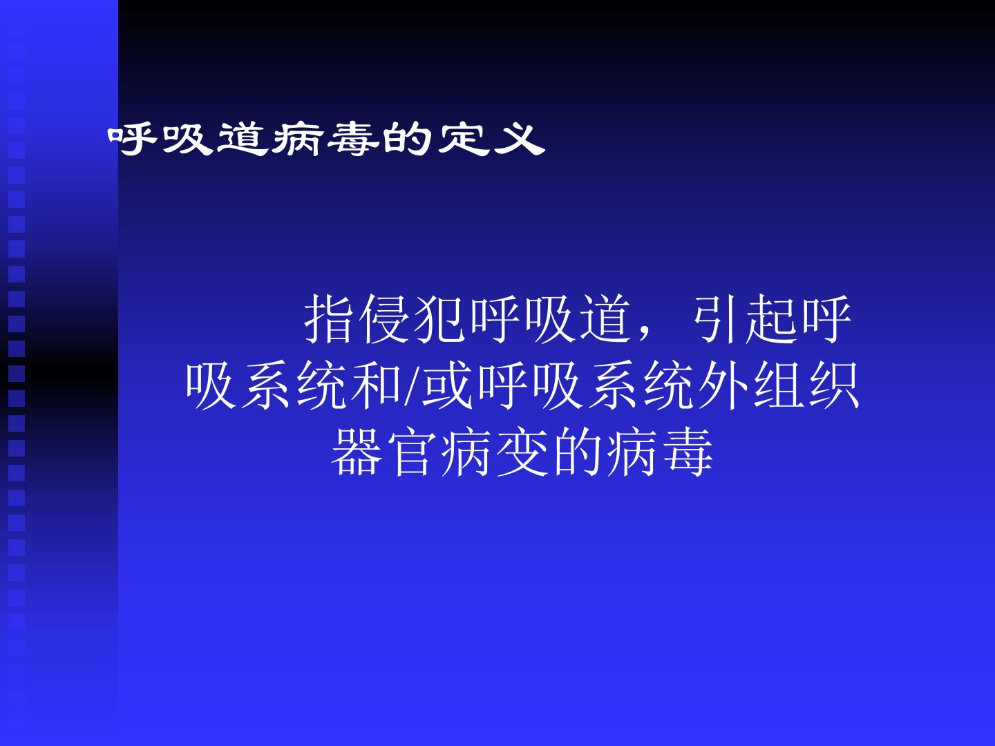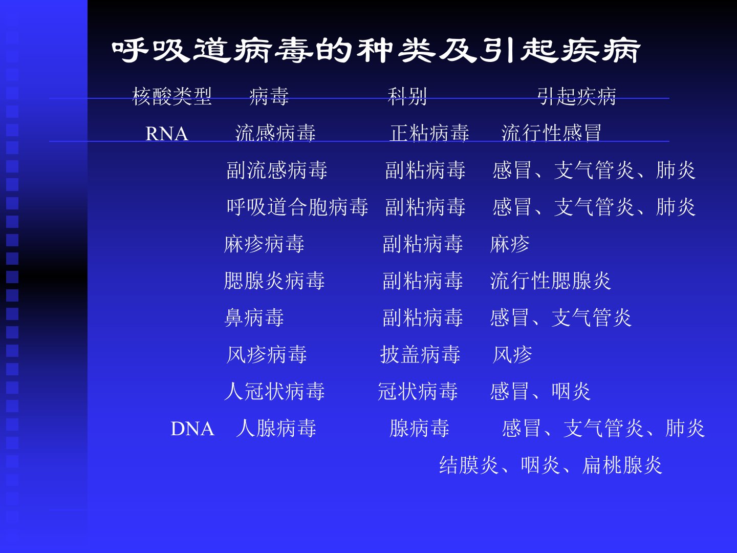呼吸道病毒指侵犯呼吸道引发呼吸系统或呼吸系统外组织器官病变的病毒主要类型及特点如下:1流感病毒:属正粘病毒科有包膜分节段RNA基因组分甲、乙、丙三型及若干亚型易变异。传播方式为飞沫传播可致流感、肺炎等冬春季多发体液免疫和细胞免疫共同作用。微生物学检查包括病毒分离、血清学诊断等可用疫苗预防抗病毒剂、中草药治疗。2麻疹病毒:引起麻疹出疹前期有发热等症状3天后出疹疹退后留色素沉着可并发细菌性感染等病后获终生免疫力。预防措施主要是隔离患者、接种减毒活疫苗。3冠状病毒:多形性单链RNA病毒主要经飞沫传播冬春两季流行引起普通感冒等。SARS冠状病毒耐冷不耐热传染源包括野生动物和患者诊断依靠临床和流行病学资料等对消毒剂敏感。4其他病毒:流行性腮腺炎病毒、风疹病毒均单链RNA、有包膜病后获牢固免疫力可用疫苗预防。肠道病毒归属于小RNA病毒科耐乙醚和酸粪口途径传播多为隐性感染。