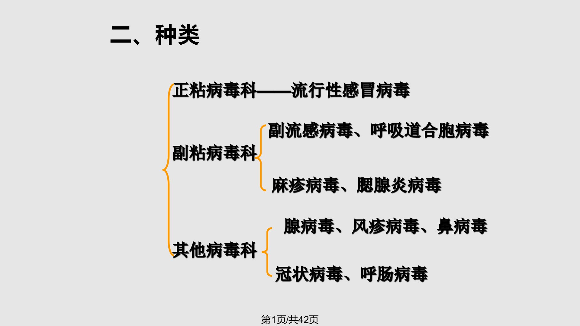 本文介绍了多种病毒重点阐述了几种典型病毒的生物学特性、致病性及防治方法。首先介绍了正粘病毒科的流行性感冒病毒其分为甲、乙、丙三型以甲型流感病毒流行最为频繁。流感病毒呈球形或丝状有包膜为单链分片段的RNA病毒表面有血凝素HA和神经氨酸酶NA两种结构内部有核衣壳和基质蛋白可在鸡胚和培养细胞中增殖不耐热对干燥等敏感主要通过飞沫传播。对于同型病毒患者有12年的免疫力。微生物学检查包括病毒分离和血清学诊断防治手段包括药物治疗和接种疫苗。禽流感病毒属于甲型流感病毒宿主广泛但大多致病性较低。冠状病毒因包膜突起似“王冠”而得名SARS冠状病毒是引起严重急性呼吸综合征的病原体。副粘病毒与正粘病毒类似但也有自己的特点。麻疹病毒是儿童上呼吸道急性传染病的病原体只有一个血清型可获得牢固免疫力但也可能引起严重并发症。腮腺炎病毒是流行性腮腺炎的病原体人也为唯一宿主和传染源只有一个血清型感染后可获得牢固免疫力。风疹病毒是儿童风疹的病原体也可感染成人只有一个血清型感染后免疫力牢固。腺病毒主要通过粪口等途径传播可引起多种疾病。