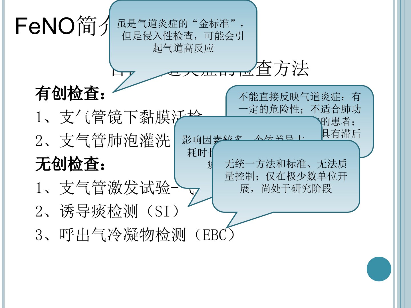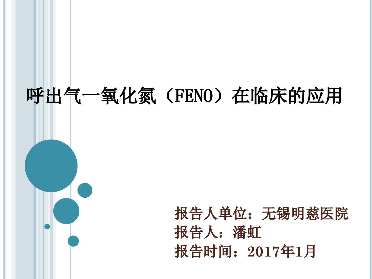2017年1月无锡明慈医院潘虹医生做了关于呼出气一氧化氮(FeNO)在临床应用报告。目前气道炎症检查方法分为有创和无创两类有创检查有一定危险性无创检查则存在滞后性、个体差异大等问题。FeNO作为国际上首个且目前唯一用于临床常规的直接检测气道炎症生物学标志物的无创检查技术符合ATS、ERS指南标准与支气管激发试验、支气管黏膜活检有良好的相关性且测定较诱导痰更易操作、重复性好、患者接受程度更高。NO可由气道细胞产生少量可舒张气道大量则加重病情。FeNO在哮喘诊治中可辅助诊断和鉴别诊断、评估炎症水平、判断ICS治疗反应性及依从性、评估哮喘控制水平和预测急性发作等。多个研究表明FeNO水平与哮喘病情相关且ICS治疗后FeNO水平可降低。此外FeNO还可作为评估AECOPD患者对糖皮质激素治疗反应的指标。不过实验中FeNO临界值缺乏大样本数据支持还需更多研究证实。