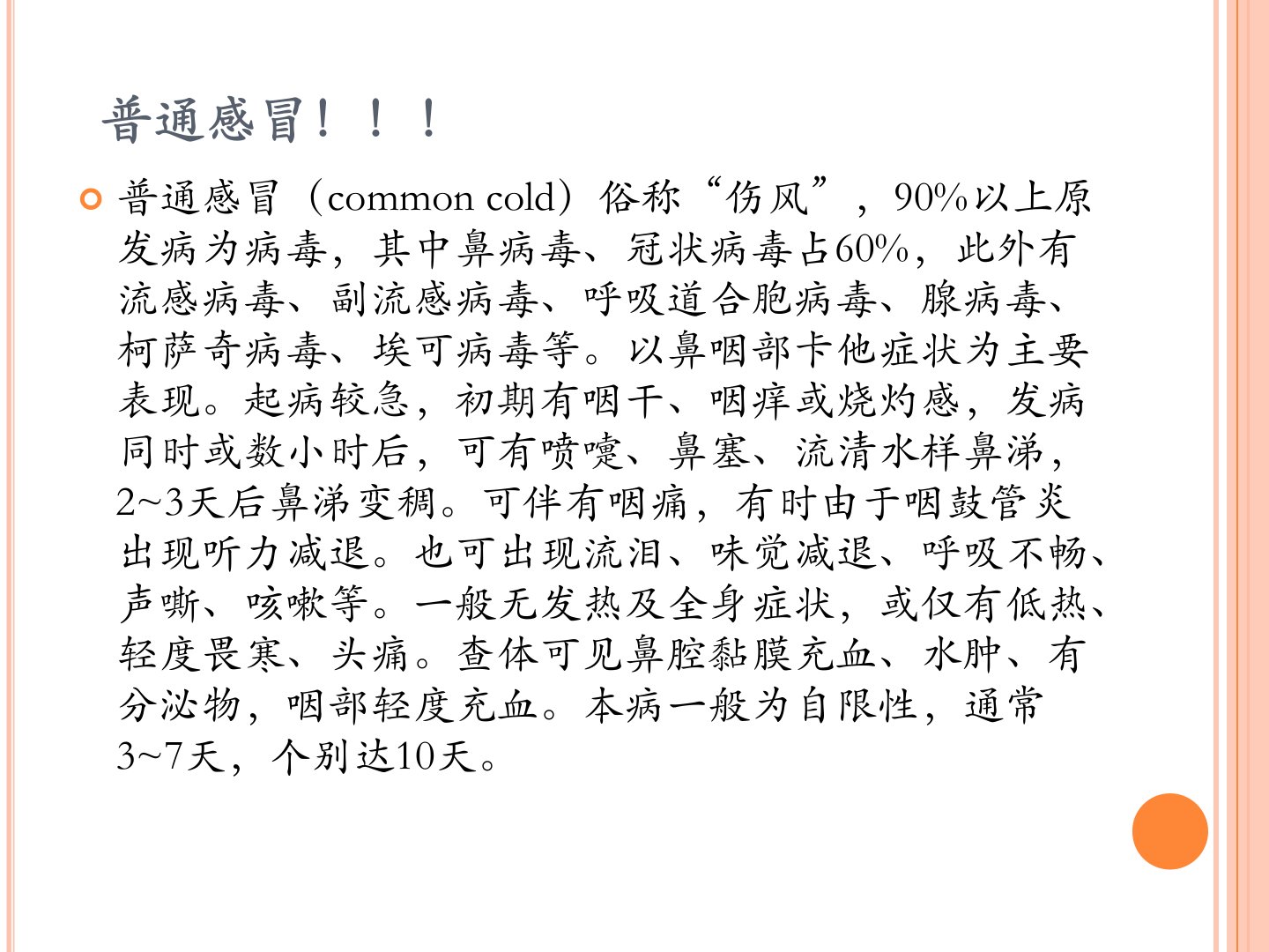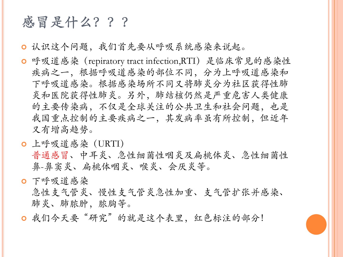 合理使用抗感冒药感冒是什么???认识这个问题,我们首先要从呼吸系统感染来说起。呼吸道感染(repiratorytractinfection,RTI)是临床常见的感染性疾病之一,根据呼吸道感染的部位不同,分为上呼吸道感染和下呼吸道感染。根据感染场所不同又将肺炎分为社区获得性肺炎和医院获得性肺炎。另外,肺结核仍然是严重危害人类健康的主要传染病,不仅是全球关注的公共卫生和社会问题,也是我国重点控制的主要疾病之一,其发病率虽有所控制,但近年又有增高趋势。上呼吸道感染(URTI)普通感冒、中耳炎、急性细菌性咽炎及扁桃体炎、急性细菌性鼻-鼻窦炎、扁桃体咽炎、喉炎、会厌炎等。下呼吸道感染 急性支气管炎、慢性...