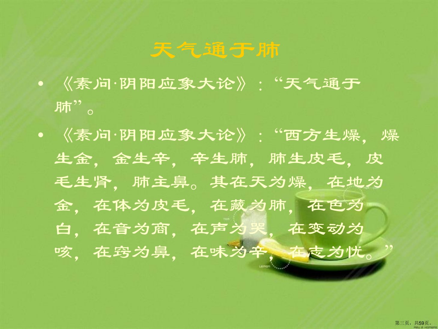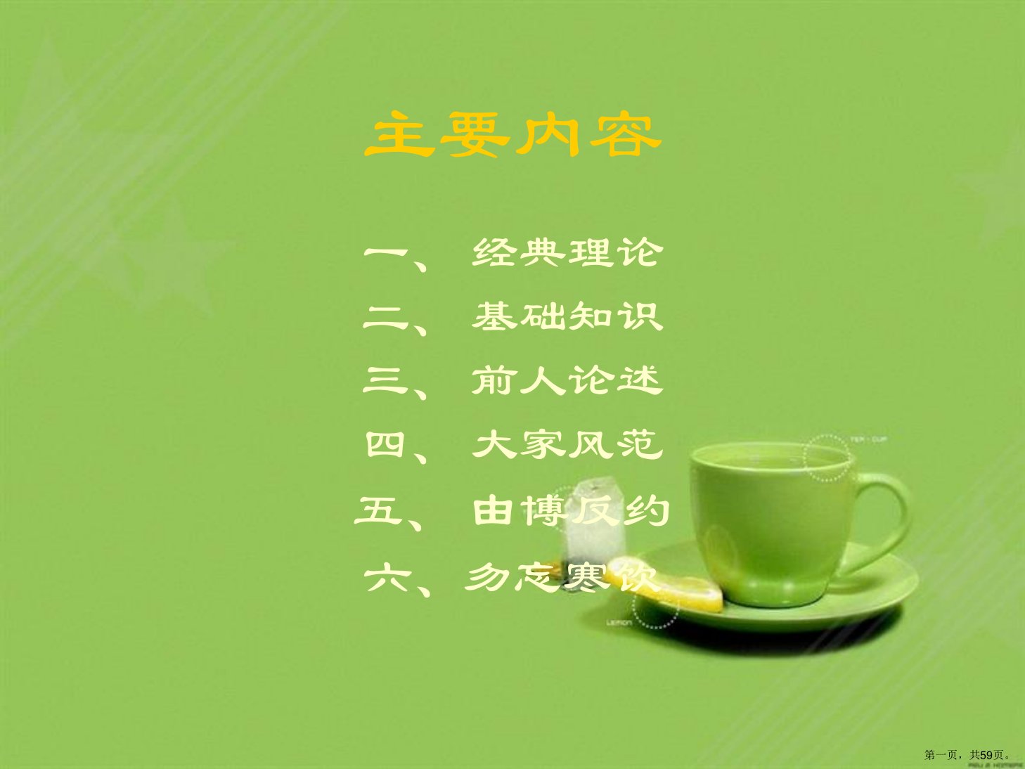 主要内容一、经典理论二、基础知识三、前人论述四、大家风范五、由博反约六、勿忘寒饮第一页,共59页。一、经典理论第二页,共59页。天气通于肺《素问·阴阳应象大论》:“天气通于肺”。《素问·阴阳应象大论》:“西方生燥,燥生金,金生辛,辛生肺,肺生皮毛,皮毛生肾,肺主鼻。其在天为燥,在地为金,在体为皮毛,在藏为肺,在色为白,在音为商,在声为哭,在变动为咳,在窍为鼻,在味为辛,在志为忧。”第三页,共59页。冬生咳嗽《素问·阴阳应象大论》:“秋伤于湿,冬生咳嗽。”《素问·生气通天论》:“秋伤于湿,上逆而咳,发为痿厥。”第四页,共59页。五藏六府皆令人咳《素问·咳论》:“五藏六府皆令人咳,非独肺也。皮毛者...