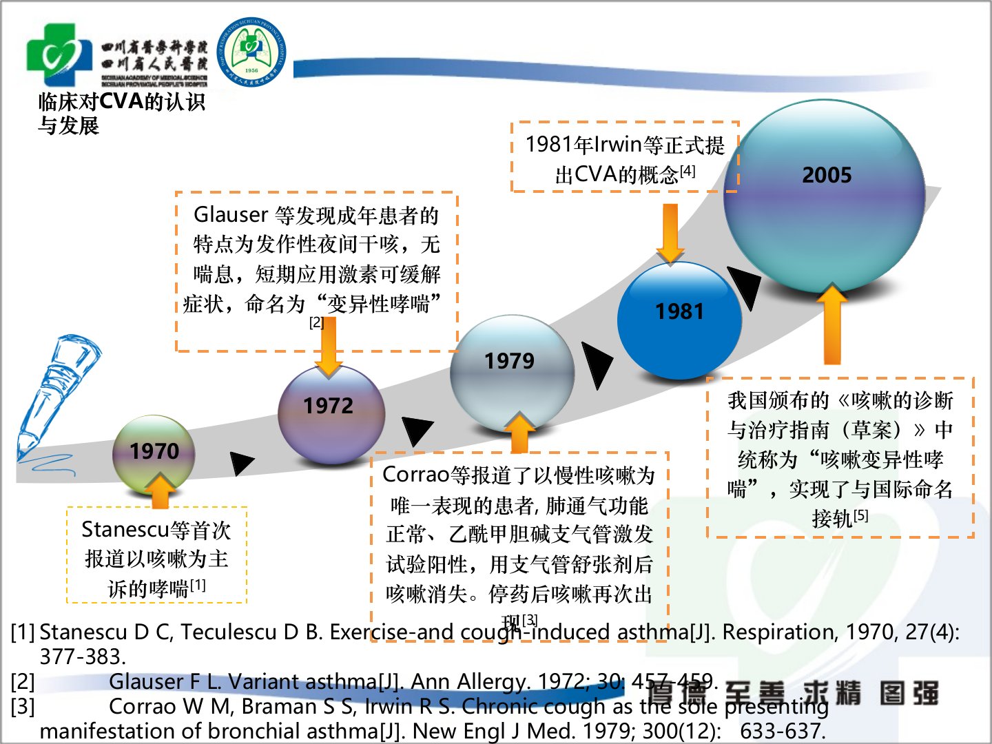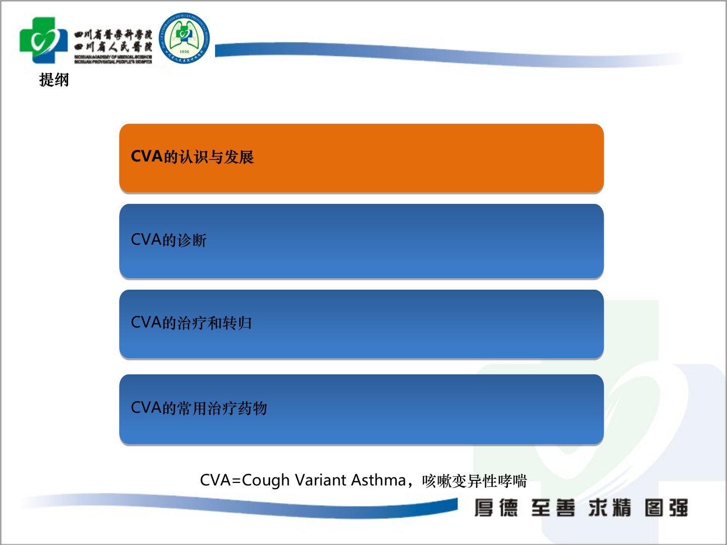 咳嗽变异性哮喘(0822市七院)CVA的认识与发展CVA的诊断CVA的治疗和转归CVA的常用治疗药物提纲CVA=Cough VariantAsthma,咳嗽变异性哮喘1970197219792005Stanescu等首次报道以咳嗽为主诉的哮喘[1]Glauser等发现成年患者的特点为发作性夜间干咳,无喘息,短期应用激素可缓解症状,命名为“变异性哮喘”[2]Corrao等报道了以慢性咳嗽为唯一表现的患者,肺通气功能正常、乙酰甲胆碱支气管激发试验阳性,用支气管舒张剂后咳嗽消失。停药后咳嗽再次出现[3]1981我国颁布的《咳嗽的诊断与治疗指南(草案)》中统称为“咳嗽变异性哮喘”,实现了与国际命名接轨...