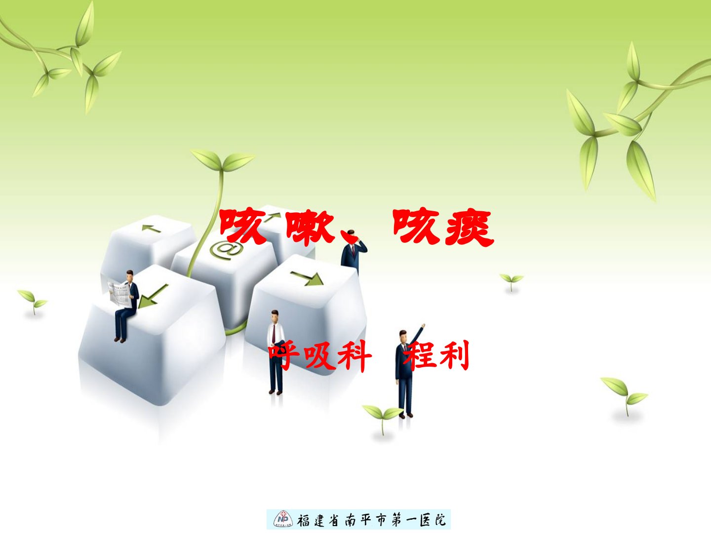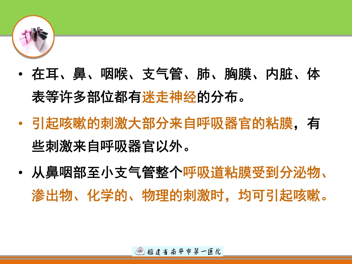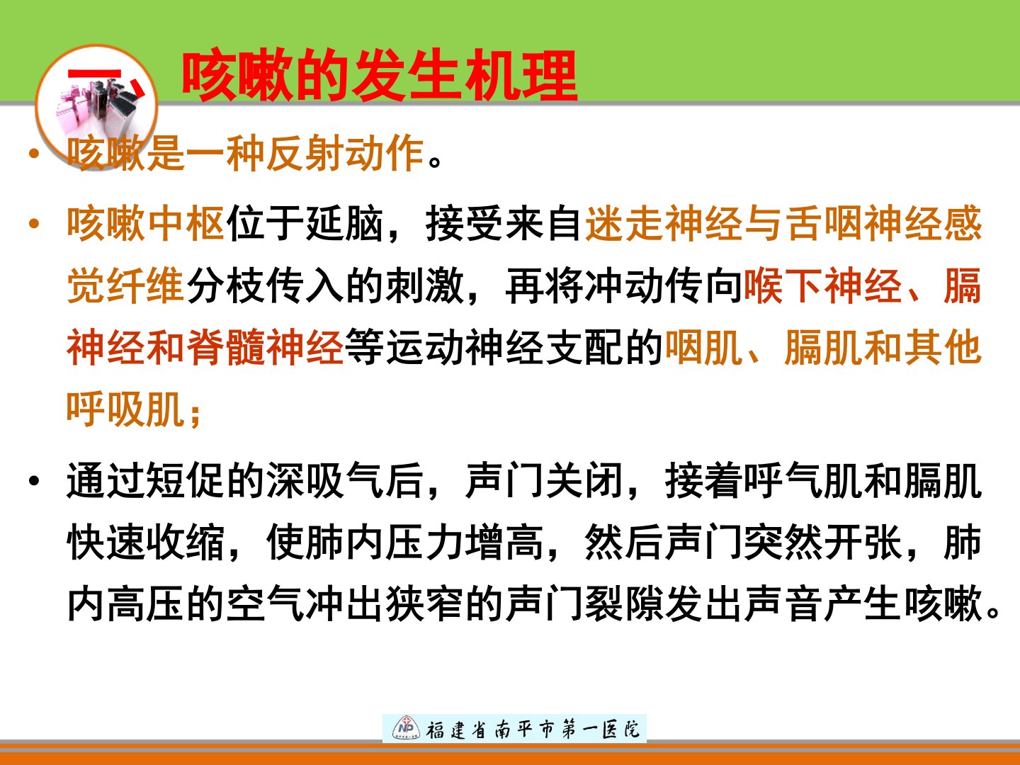 咳嗽、咳痰呼吸科程利一、咳嗽的发生机理咳嗽是一种反射动作。咳嗽中枢位于延脑,接受来自迷走神经与舌咽神经感觉纤维分枝传入的刺激,再将冲动传向喉下神经、膈神经和脊髓神经等运动神经支配的咽肌、膈肌和其他呼吸肌;通过短促的深吸气后,声门关闭,接着呼气肌和膈肌快速收缩,使肺内压力增高,然后声门突然开张,肺内高压的空气冲出狭窄的声门裂隙发出声音产生咳嗽。在耳、鼻、咽喉、支气管、肺、胸膜、内脏、体表等许多部位都有迷走神经的分布。引起咳嗽的刺激大部分来自呼吸器官的粘膜,有些刺激来自呼吸器官以外。从鼻咽部至小支气管整个呼吸道粘膜受到分泌物、渗出物、化学的、物理的刺激时,均可引起咳嗽。二、咳嗽的利和弊适度咳嗽是一...