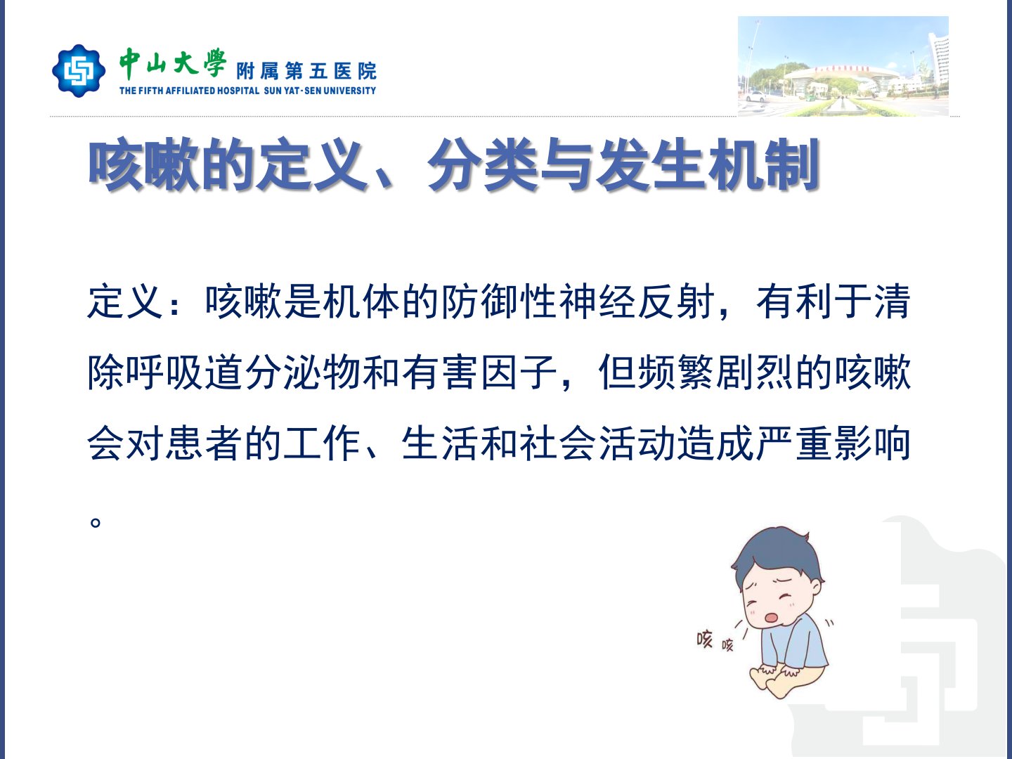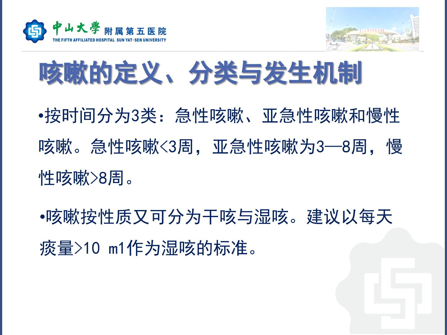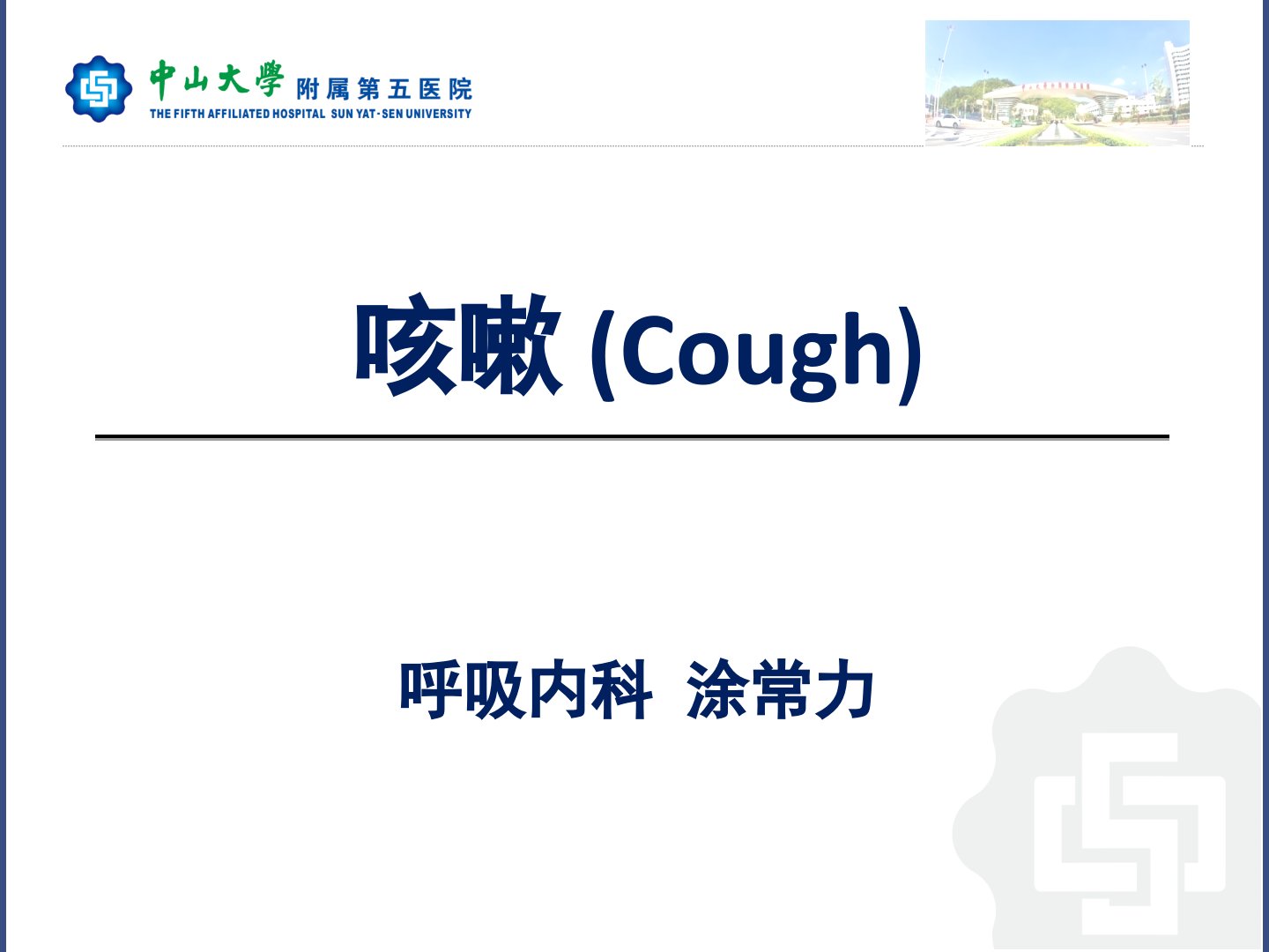 咳嗽诊疗概要涂常力医生阐述了咳嗽的定义、分类及发生机制。咳嗽作为防御性神经反射按时间分为急性、亚急性、慢性三类按性质分干咳与湿咳。慢性咳嗽病因多分胸片有明确病变和无明显异常两类。诊断咳嗽需详细询问病史如咳嗽的持续时间、时相、痰液性状等并进行体格检查和相关辅助检查包括影像学、诱导痰细胞学、肺功能等。咳嗽评估可用视觉模拟评分、咳嗽症状积分等方法。急性咳嗽需区分是否伴重症疾病普通感冒以对症治疗为主不推荐常规用抗菌药可用减充血剂、抗组胺药等;急性气管支气管炎大部分自限对症治疗咳黄脓痰可用抗生素。亚急性咳嗽先明确是否继发呼吸道感染PIC常自限部分需短期用药。慢性咳嗽病因诊断结合病史等常见病因有UACS、CVA、EB、GERC等治疗依病因进行。轻度咳嗽无需镇咳严重或影响生活质量可适当镇咳痰多宜祛痰。社区转诊指征包括紧急转诊和普通转诊如出现气胸等危急情况或治疗无效、疑似传染病等需及时转诊。