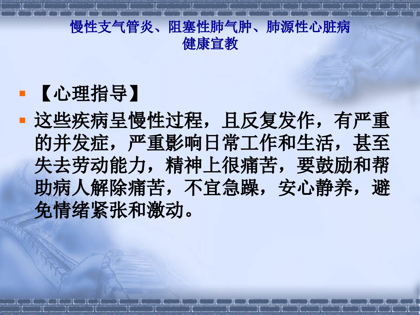 关于呼吸内科常见疾病的健康教育内容慢性支气管炎、阻塞性肺气肿、肺源性心脏病健康宣教支气管哮喘健康宣教支气管扩张健康宣教肺炎健康宣教慢性支气管炎、阻塞性肺气肿、肺源性心脏病健康宣教【心理指导】这些疾病呈慢性过程,且反复发作,有严重的并发症,严重影响日常工作和生活,甚至失去劳动能力,精神上很痛苦,要鼓励和帮助病人解除痛苦,不宜急躁,安心静养,避免情绪紧张和激动。慢性支气管炎、阻塞性肺气肿、肺源性心脏病健康宣教【饮食指导】选择高蛋白(鱼类、瘦肉、禽蛋类、豆制品等)、高维生素(蔬菜水果)、清淡、易消化的饮食。有尿少、水肿者,应限制水、盐的摄入。慢性支气管炎、阻塞性肺气肿、肺源性心脏病健康宣教【用药指导...