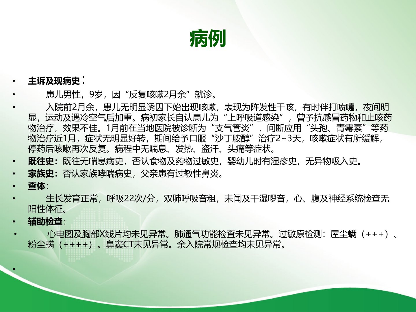 9岁男性患儿因“反复咳嗽2月余”就诊表现为阵发性干咳夜间、运动及遇冷空气后加重。病初被误认为“上呼吸道感染”抗感冒和止咳药物治疗无效后被诊断为“支气管炎”用“头孢、青霉素”等治疗近1月症状无明显好转。患儿无喘息、发热等症状既往无喘息病史有婴幼儿湿疹史父亲患过敏性鼻炎。查体及心电图、胸部X线片、肺通气功能、鼻窦CT等检查均未见异常过敏原检测显示屋尘螨、粉尘螨阳性。诊断考虑为咳嗽变异性哮喘(CVA)其特点是持续咳嗽4周以上夜间和(或)清晨发作运动、遇冷空气后加重无感染征象或经长时间抗生素治疗无效支气管舒张剂诊断性治疗可使咳嗽症状明显缓解。CVA与哮喘本质相同都是气道慢性非特异性炎症但CVA仅咳不喘。治疗上大多数患者吸入小剂量糖皮质激素和支气管舒张剂即可治疗不少于8周。该患儿经布地奈德雾化吸入联合支气管扩张剂治疗2周后症状明显缓解继续小剂量糖皮质激素吸入治疗满8周咳嗽未再反复。