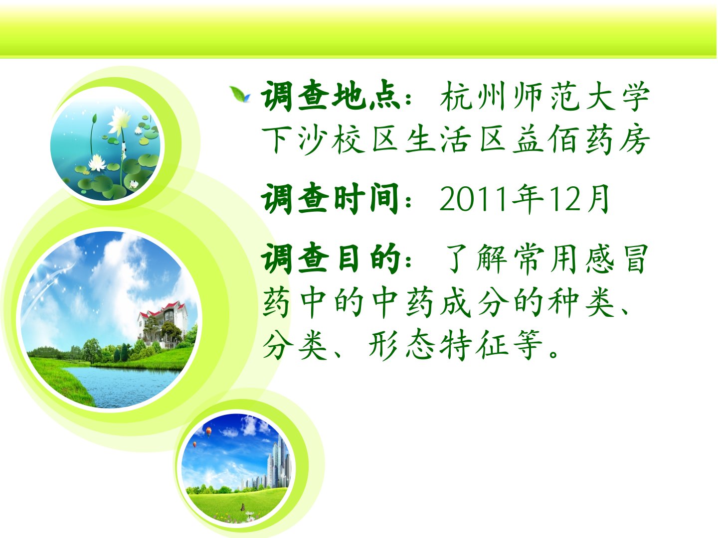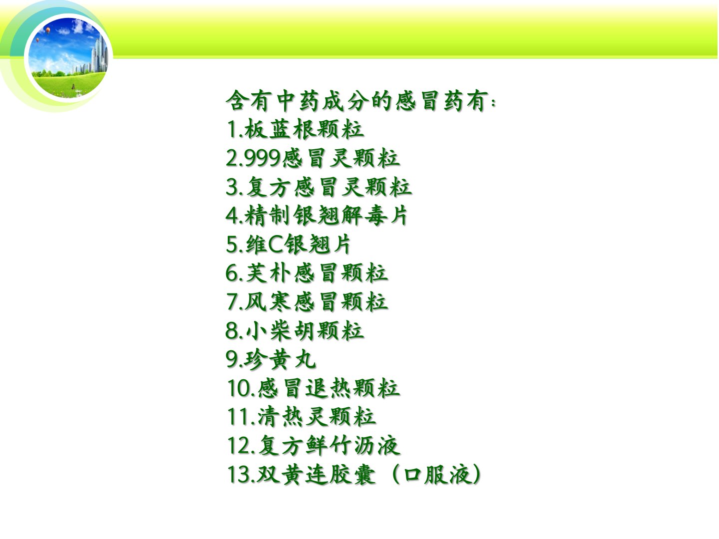 2011年12月在杭州师范大学下沙校区益佰药房展开了一项关于感冒药中中成药的调查旨在了解常用感冒药中的中药成分种类、分类、形态特征等。调查发现含有中药成分的感冒药包括板蓝根颗粒、999感冒灵颗粒、复方感冒灵颗粒、精制银翘解毒片、维C银翘片等十余种。其中板蓝根颗粒具有清热解毒、凉血利咽功效用于咽喉肿痛等症状板蓝根分北板蓝根和南板蓝根均具有清热解毒等功效。999感冒灵颗粒解热镇痛用于感冒引起的头痛发热等症状。复方感冒灵颗粒则辛凉解表、清热解毒用于风热感冒。此外调查还详细介绍了芙朴感冒颗粒、风寒感冒颗粒、小柴胡颗粒、珍黄丸、感冒退热颗粒、清热灵颗粒、复方鲜竹沥液、双黄连胶囊(口服液)等的主要成分、功效、用法用量以及相关中药的植物形态和化学成分。