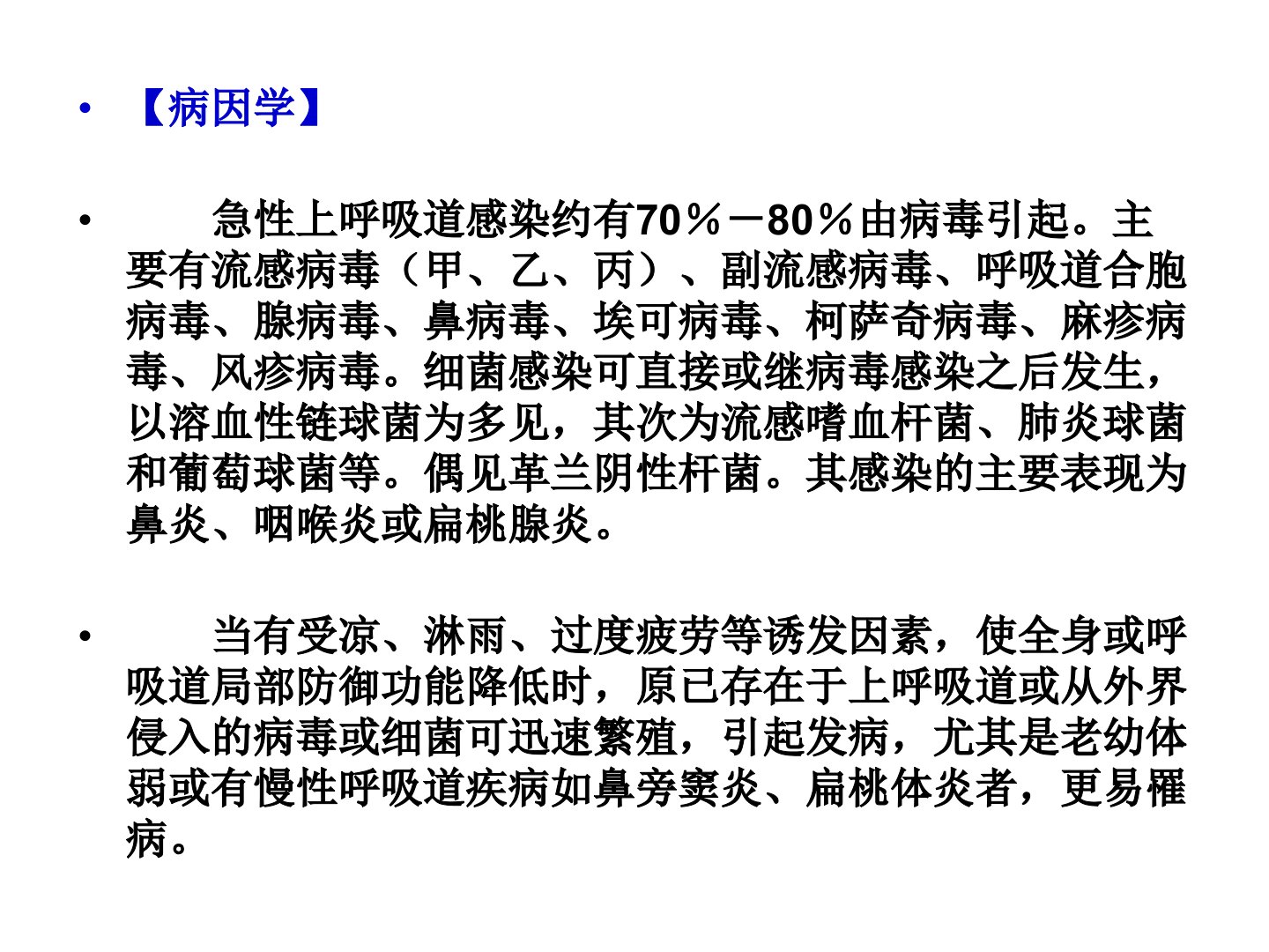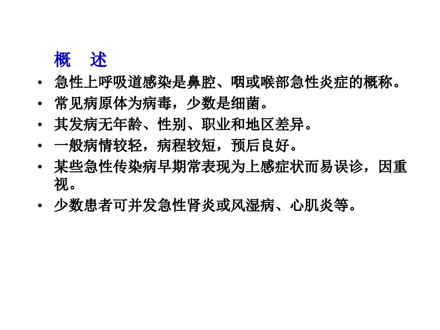 急性上呼吸道感染是鼻腔、咽或喉部的急性炎症常见病原体为病毒少数为细菌无年龄、性别、职业和地区差异。一般病情较轻病程短预后良好但某些急性传染病早期可能表现为上感症状需注意误诊。少数患者可能并发急性肾炎、风湿病或心肌炎等。其发病原因多样约7080由病毒引起细菌感染可直接或继发于病毒感染后发生。病理改变主要表现为鼻腔及咽粘膜充血、水肿等。本病全年可发冬春季节多发可通过飞沫或污染用具传播。临床表现根据病因不同可分为多种类型如普通感冒、病毒性咽炎等。治疗方面包括对症治疗、抗菌药物治疗、中医治疗等。预防则主要是增强机体抗病能力做好防寒工作避免诱因隔离呼吸道病人等。