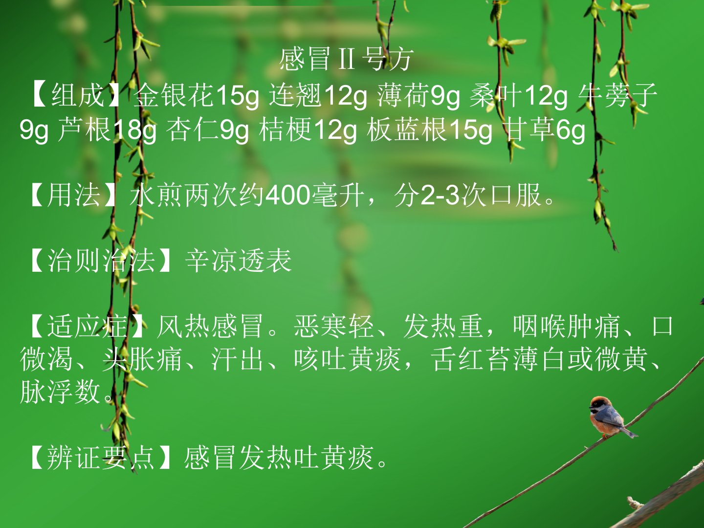 临清市中医院王家昌提出感冒首选中药诊疗方案其中针对风热感冒给出了感冒号方其组成为金银花、连翘、薄荷、桑叶等用法为水煎分服治则为辛凉透表适应症包括恶寒轻、发热重、咽喉肿痛等风热感冒症状辨证要点为感冒发热吐黄痰。此外还介绍了柴胡疏肝散该方录自《证治准绳》功用为疏肝行气活血止痛主治肝气郁滞证如胁肋疼痛、胸闷喜太息等。方中柴胡为君药香附、川芎为臣药陈皮、枳壳、芍药、甘草为佐使药共奏疏肝解郁行气止痛之功。本方为治肝气郁结病证的常用方临床应用以胁肋胀痛脉弦为辨证要点现代常用于慢性肝炎、慢性胃炎等属肝郁气滞者。文中还提及了附方木香顺气散以及柴胡疏肝散的方论选录和医案举例。