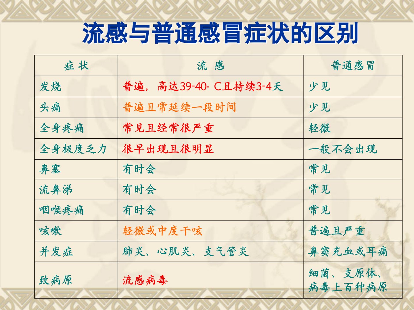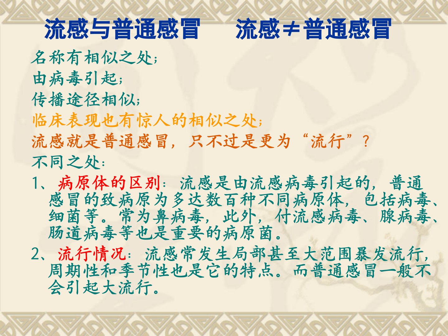 流感与普通感冒名称相似均由病毒引起传播途径和临床表现也相似但二者存在诸多不同。病原体上流感由流感病毒引起普通感冒则由多达数百种不同病原体导致。流行情况上流感常发生局部甚至大范围暴发流行具周期性和季节性普通感冒一般不会大流行。治疗上西医将感冒分为普通和流行性两类用药分抗病毒、对症治疗、抗生素三类目前市售药多为几种成分组合。药物大体分为抗过敏类、解热镇痛药类、抗病毒类和中成药四类。中医将感冒分为风寒、风热、暑湿型、时行感冒四大类用药各不相同。使用感冒药时症状消失可停药切忌同时服用含相同成分的西药和中成药避免多种感冒药同服、感冒滥用抗生素等误区。此外文章还介绍了预防流感方、秋冬季养生、发热与体温测量等相关知识。