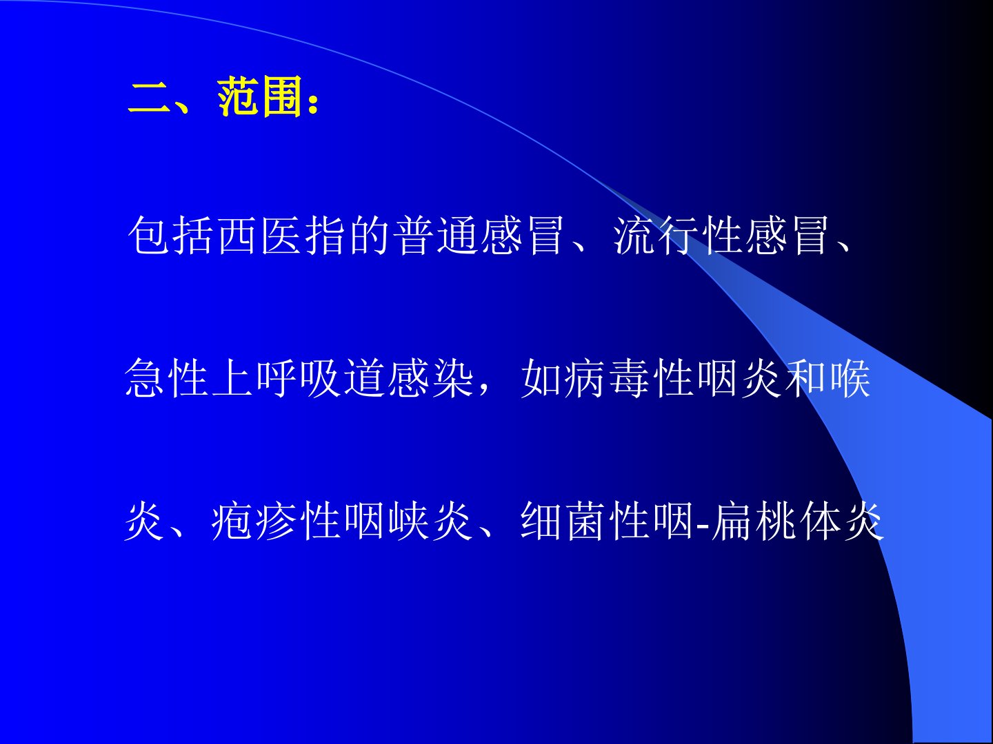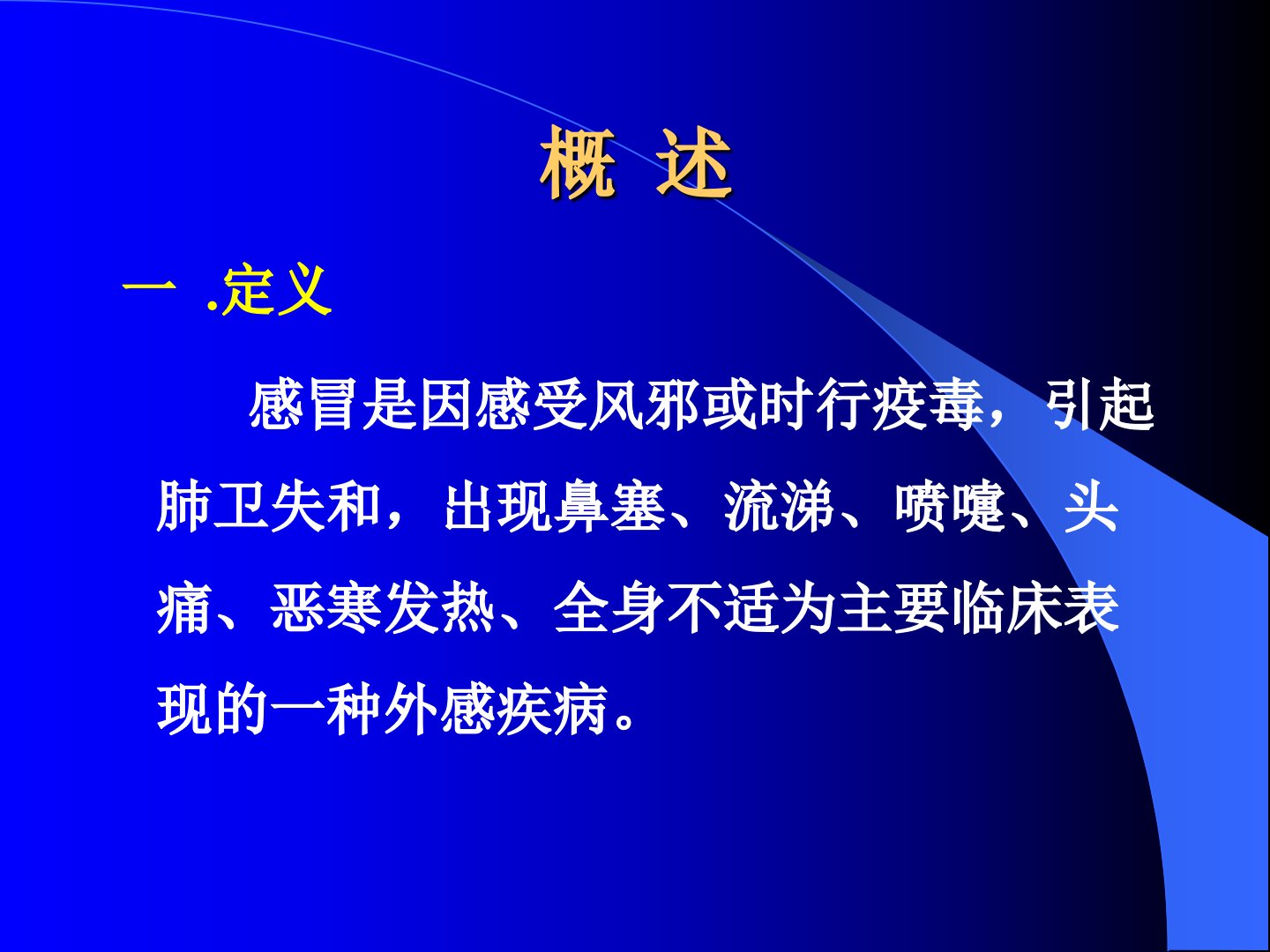 感冒概述一.定义感冒是因感受风邪或时行疫毒,引起肺卫失和,出现鼻塞、流涕、喷嚏、头痛、恶寒发热、全身不适为主要临床表现的一种外感疾病。二、范围:包括西医指的普通感冒、流行性感冒、急性上呼吸道感染,如病毒性咽炎和喉炎、疱疹性咽峡炎、细菌性咽-扁桃体炎病因病机(一)风邪:外感六淫之邪,以风邪为主,邪从口鼻皮毛而入,致使肺卫失调而发感冒。(二)时行疫毒:多由四时不正之气,天时疫疠之气从口鼻而入,肺失宣发以发病。(三)正气不足:体虚、疲劳,抗病能力差,加之外感六淫之邪或时行疫毒入侵,肺卫调节功能失常则病发感冒。感冒的主要病因是风邪。病机特点:肺卫失调,邪正相争。感邪特点与体质相关:阳虚者,易感风寒;阴...