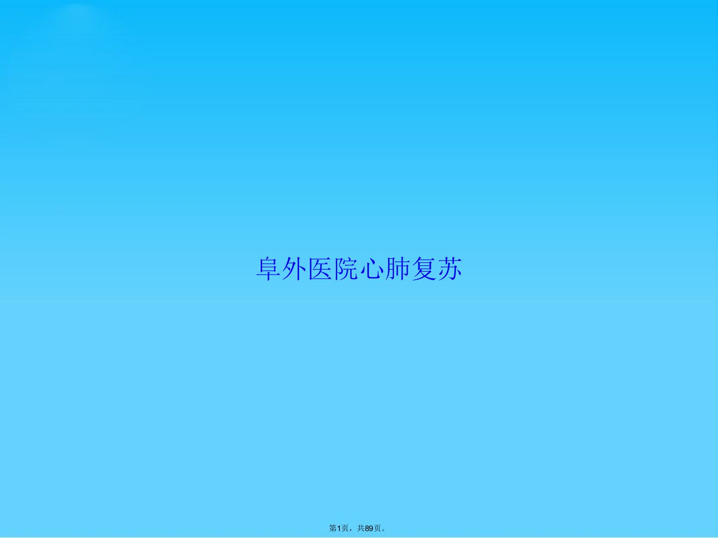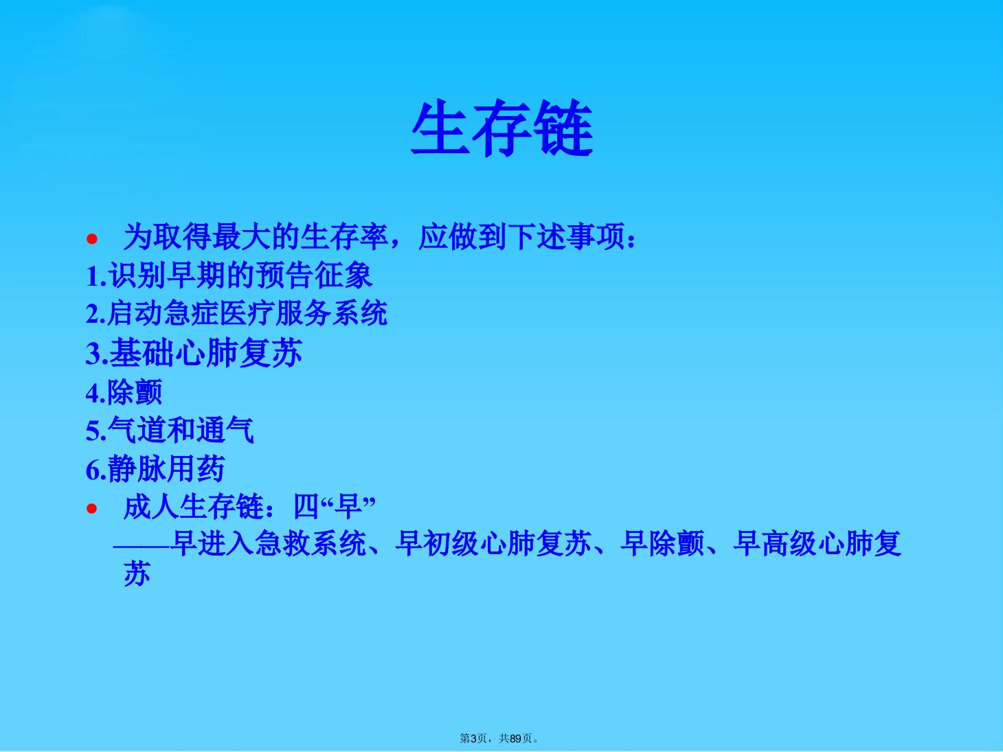 阜外医院心肺复苏第1页,共89页。参与心肺复苏的人员非专业医务人员:——包括警察、消防队员、机关工作人员、社区人员、高危病人的家庭成员等——往往是现场第一抢救者——可以进行初级心肺复苏操作——应当进行适当的心肺复苏培训医学助理人员:——经过正规培训的抢救人员——可以进行部分高级心肺复苏操作医生:——直接进行高级心肺复苏——指导现场进行抢救第2页,共89页。生存链为取得最大的生存率,应做到下述事项:1.识别早期的预告征象2.启动急症医疗服务系统3.基础心肺复苏4.除颤5.气道和通气6.静脉用药成人生存链:四“早”——早进入急救系统、早初级心肺复苏、早除颤、早高级心肺复苏第3页,共89页。成功的关...