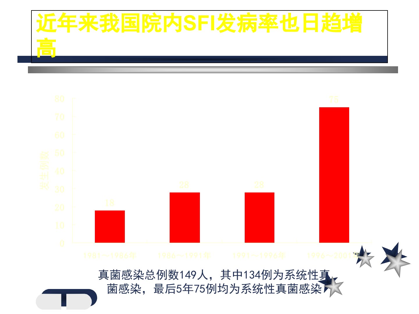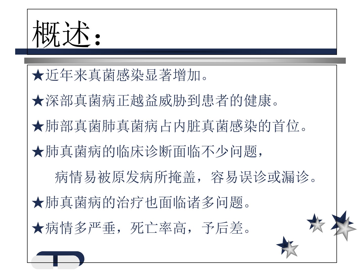 肺真菌病诊断和治疗概述:★近年来真菌感染显著增加。★深部真菌病正越益威胁到患者的健康。★肺部真菌肺真菌病占内脏真菌感染的首位。★肺真菌病的临床诊断面临不少问题,病情易被原发病所掩盖,容易误诊或漏诊。★肺真菌病的治疗也面临诸多问题。★病情多严垂,死亡率高,予后差。近年来我国院内SFI发病率也日趋增高真菌感染总例数149人,其中134例为系统性真菌感染,最后5年75例均为系统性真菌感染2019年各类病原菌的总体构成比(2702株)真菌6.9%革兰阳性菌19.1%革兰阴性菌74.0%各种念珠菌感染所占的比例深部真菌感染早期诊断难点:真菌感染临床表现不明显,没有特异性,极易漏诊。尸检发现,50%播散性...