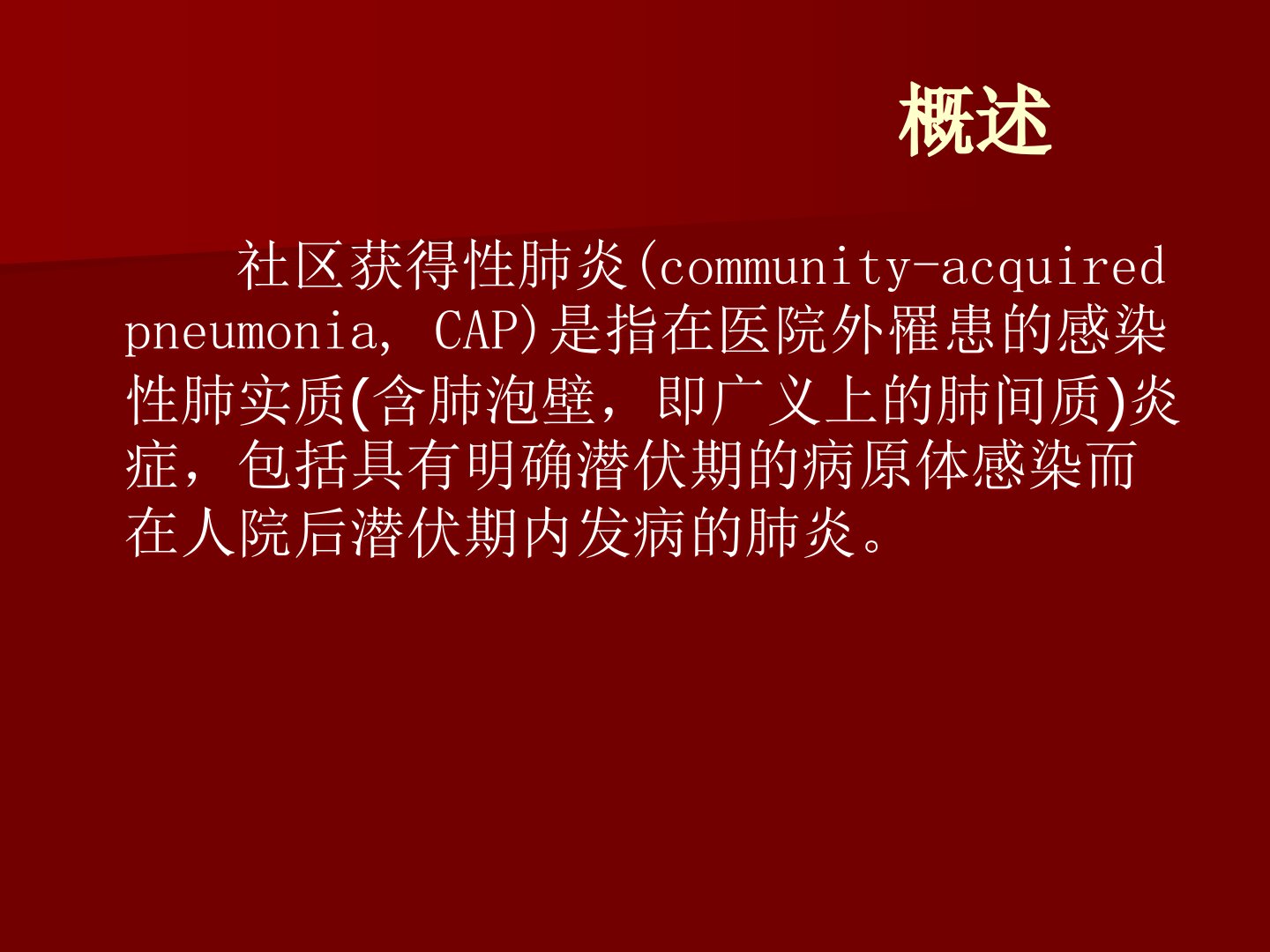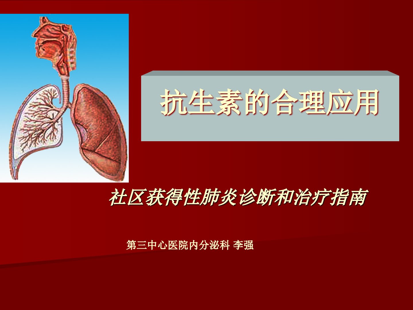 抗生素的合理应用社区获得性肺炎诊断和治疗指南第三中心医院内分泌科李强主要内容概述诊断和鉴别诊断病源学分析治疗概述社区获得性肺炎(community-acquiredpneumonia,CAP)是指在医院外罹患的感染性肺实质(含肺泡壁,即广义上的肺间质)炎症,包括具有明确潜伏期的病原体感染而在人院后潜伏期内发病的肺炎。CAP的临床诊断依据1.新近出现的咳嗽、咳痰或原有呼吸道疾病症状加重,并出现脓性痰,伴或不伴胸痛。2.发热3.肺实变体征和(或)闻及湿性罗音。4.WBC>10x109/L或CAP的病原学诊断病原体检测标本和方法痰细菌学检查标本的采集、送检和实验室处理痰是最方便且无创伤性的病原学诊断...