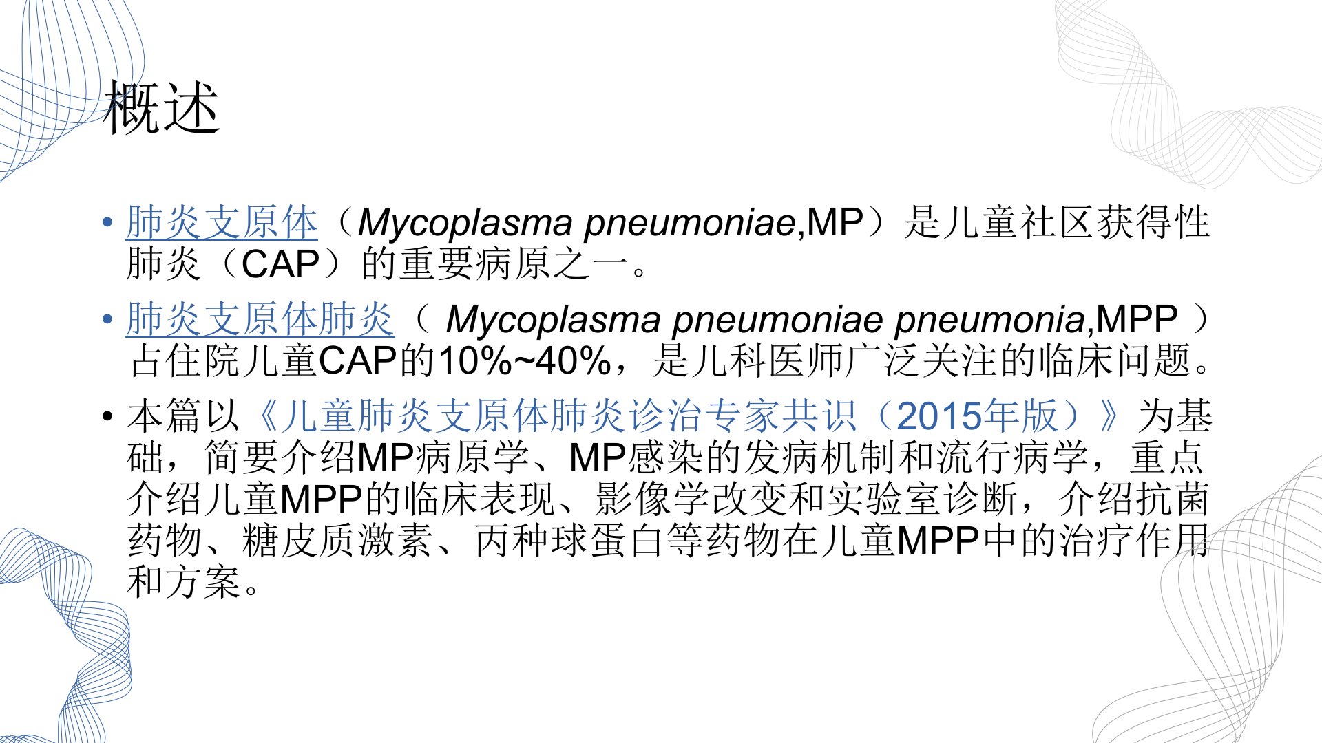 肺炎支原体肺炎(MPP)朱占魁目录CONTENTFORTHEBESTPPTGETMORE概述、病原学、发病机制临床表现、辅助检查、诊断及鉴别诊断治疗概述肺炎支原体(Mycoplasmapneumoniae,MP)是儿童社区获得性肺炎(CAP)的重要病原之一。肺炎支原体肺炎(Mycoplasmapneumoniaepneumonia,MPP)占住院儿童CAP的10%~40%,是儿科医师广泛关注的临床问题。本篇以《儿童肺炎支原体肺炎诊治专家共识(2015年版)》为基础,简要介绍MP病原学、MP感染的发病机制和流行病学,重点介绍儿童MPP的临床表现、影像学改变和实验室诊断,介绍抗菌药物、糖皮质激素、...