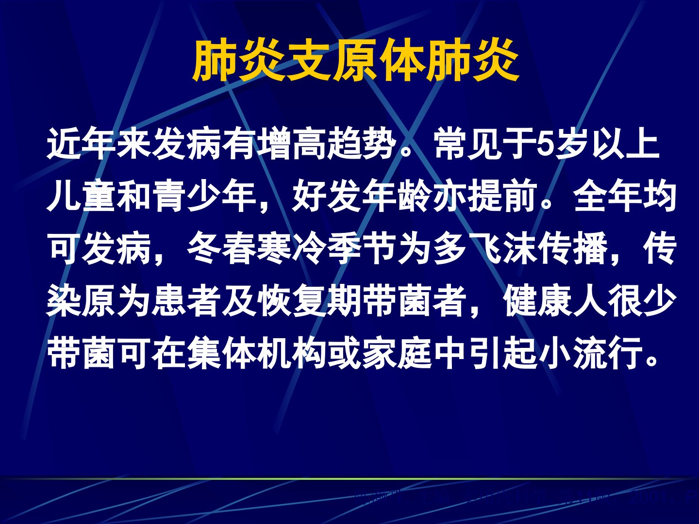 《实用内科学第11版》(陈灏珠主编2001P1581)指出肺炎支原体肺炎由肺炎支原体引起是急性呼吸道感染伴肺炎常伴咽炎、支气管炎近年来发病率增高常见于5岁以上儿童及青少年好发年龄提前全年可发病冬春多见飞沫传播传染原为患者及恢复期带菌者。肺炎支原体经口鼻分泌物传播健康人吸入后感染致病可能与过敏反应有关。被吸入后其吸附于呼吸道上皮细胞抑制纤毛活动破坏上皮细胞。病理上肺泡内有渗出液有细胞浸润细支气管管壁增厚有灶性肺不张等症状。大多起病缓慢症状多样。体征包括咽充血等血液检查白细胞正常或略增冷凝集试验阳性血清肺炎支原体抗体检测有变化。胸片显示多种形态浸润影。诊断依据临床表现、X线、血清学检查及培养结果。治疗用大环内酯类抗生素重症可加用激素。预后一般较好重症及时处理可痊愈。