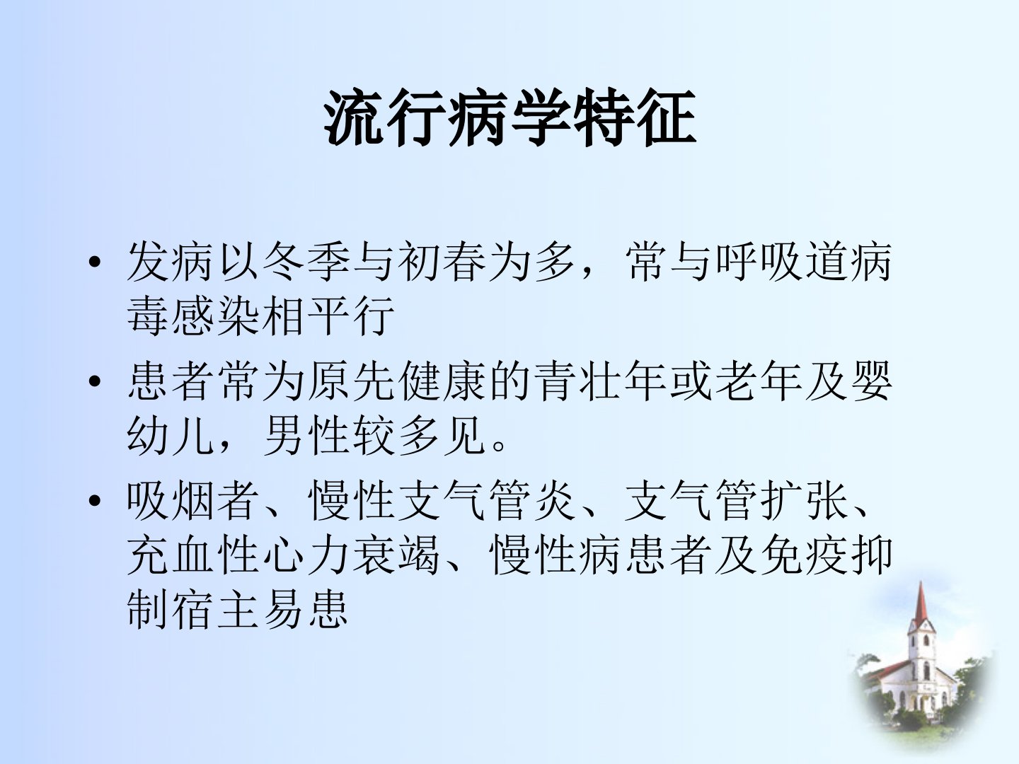 肺炎链球菌肺炎由肺炎链球菌引发约占社区获得性肺炎的半数通常急骤起病以高热、寒战、咳嗽、血痰及胸痛为特征。X线胸片可见肺段或肺叶急性炎性实变。该病冬季与初春多发多见于青壮年、老年及婴幼儿男性较多吸烟者及慢性病患者等更易患病。肺炎链球菌为革兰染色阳性球菌毒力与荚膜多糖有关是寄居在口腔及鼻咽部的正常菌群机体免疫功能受损时致病。其致病力源于多糖荚膜对组织的侵袭病变始于肺外周易累及胸膜。病理分期包括充血期、红色肝变期、灰色肝变期及消散期典型病理分期因抗生素治疗已少见。临床表现包括高热、寒战、肌肉酸痛、咳嗽、咳痰、胸痛等症状体征因病情阶段而异。本病自然病程约12周并发症少见严重感染中毒症患者易发生感染性休克其他并发症包括胸膜炎、脓胸等。实验室检查包括血液检查、痰液检查等X线检查可见肺纹理增粗、大片炎症浸润阴影等。诊断主要依据典型症状、体征及X线检查病原菌检测是确诊依据需与呼吸道感染、肺结核、肺癌等疾病相鉴别。治疗包括抗菌药物治疗、支持疗法及并发症处理首选青霉素G对青霉素过敏者可用其他抗生素。