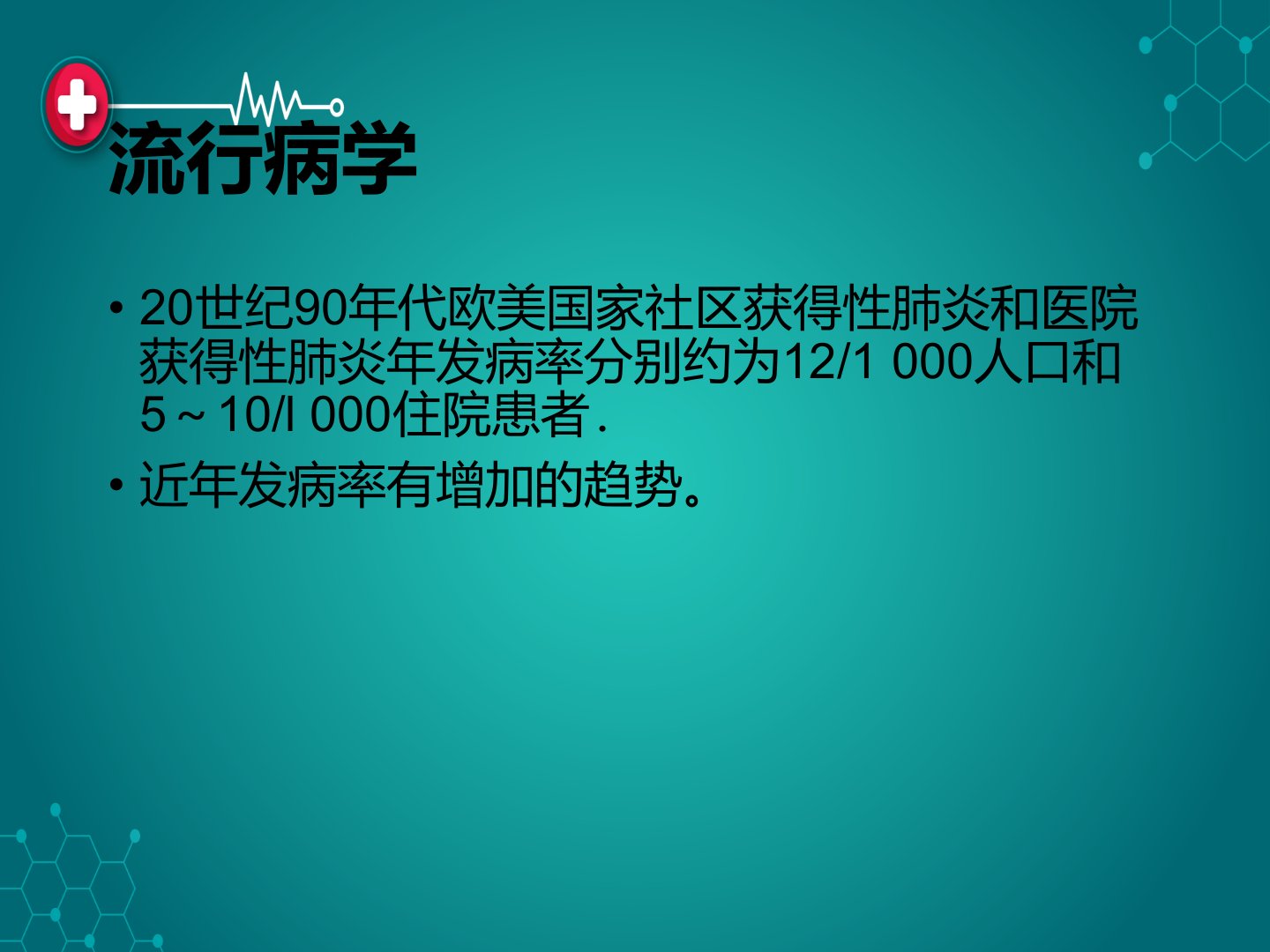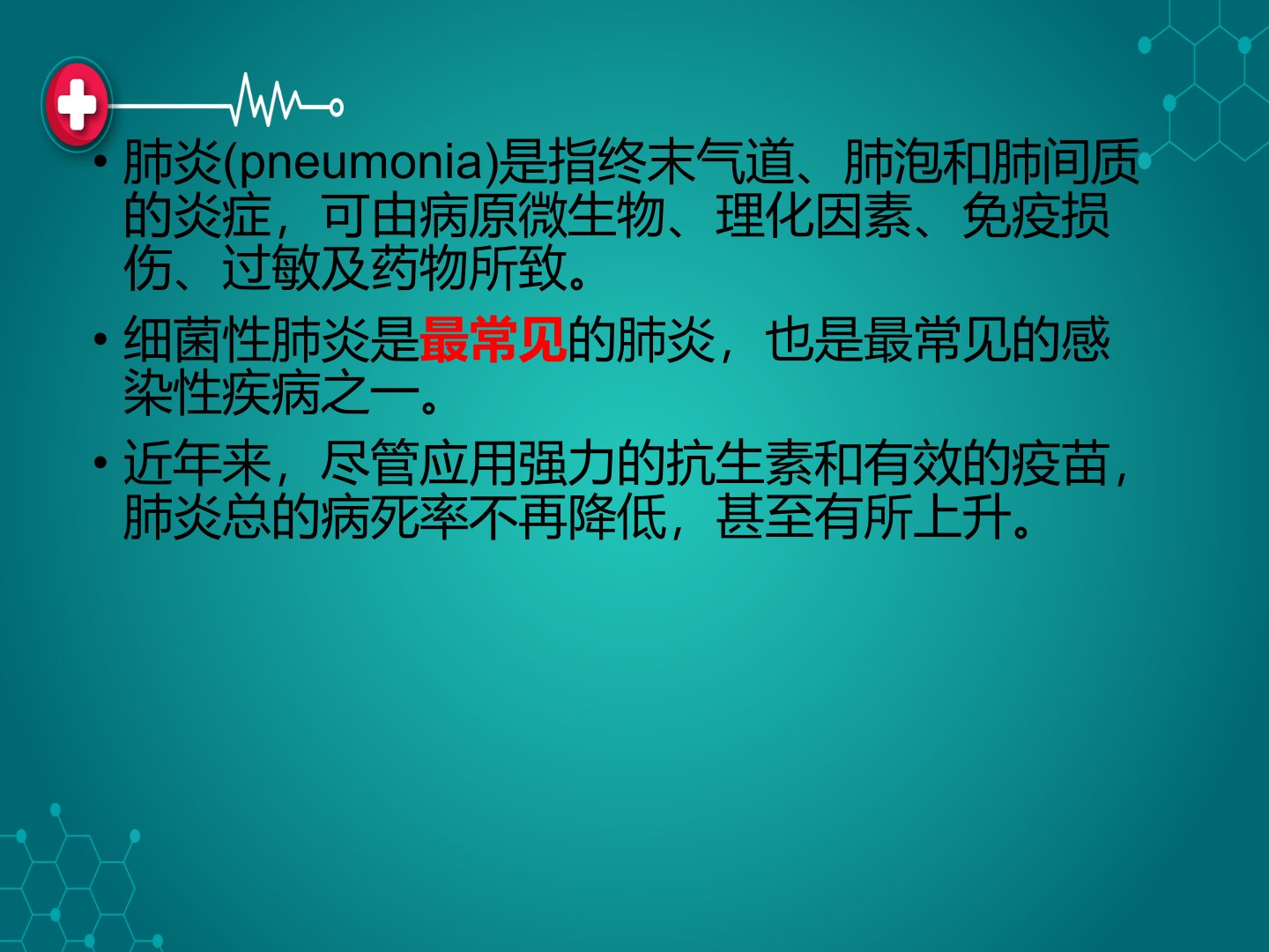 肺炎指终末气道、肺泡和肺间质的炎症可由多种因素引起其中细菌性肺炎最常见。近年来肺炎病死率未降反升。是否发生肺炎取决于病原体和宿主因素病原体可通过空气吸入、血流播散等多种途径引发社区获得性肺炎医院获得性肺炎还可通过误吸胃肠道定植菌等方式引起。肺炎可按解剖、病因或患病环境分类:解剖上分为大叶性、小叶性和间质性肺炎;病因上包括细菌性、非典型病原体、病毒性、真菌性及其他病原体所致肺炎还有理化因素所致肺炎;患病环境上分为社区获得性肺炎和医院获得性肺炎后者继发于危重病人具有革兰阴性杆菌比例高、混合感染率高、耐药菌株多、死亡率高的特点。诊断时需区别肺炎与上呼吸道感染等评估病情严重程度确定病原体。治疗以抗感染为主包括经验性和抗病原体治疗重症肺炎首选广谱强力抗菌药物。抗生素治疗后4872小时应评价病情。