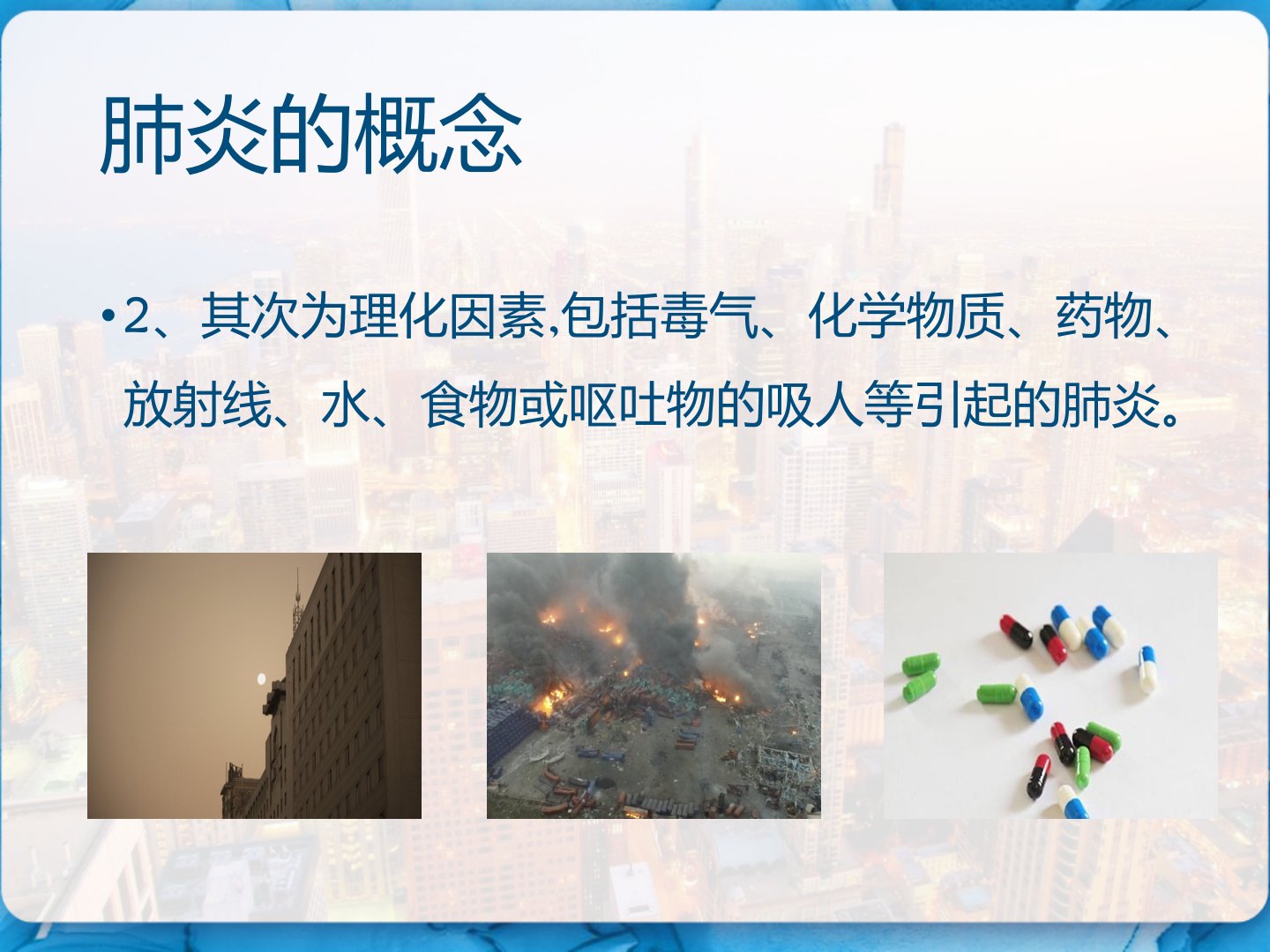 肺炎主要由感染引起包括细菌、病毒、真菌等多种病原体也可由理化因素(毒气、放射线等)、免疫与变态反应(过敏性、风湿性疾病等)导致。其发生发展与机体防御功能、病原菌侵袭力紧密相关且随宿主年龄、伴随疾病与免疫状态等差异而有所不同。肺炎特点包括:防疫功能受损易发病;病原菌多经上呼吸道侵入;全身感染中毒症状明显如寒战、胸痛、高热等;流行病学上冬春季多见男性、老人、婴幼儿更易感预后较差;并发症严重如休克性肺炎等。诊断需结合病史、症状、体征及实验室、X线检查。治疗原则为控制感染选用敏感抗生素对症支持治疗预防并发症。健康教育方面建议按医嘱及时用药急性期定期复诊;发热时卧床休息好转后适当活动;多饮开水吃易消化食物;保持室内空气流通戒烟避刺激气体;寒冷季节注意保暖避免诱发因素。
