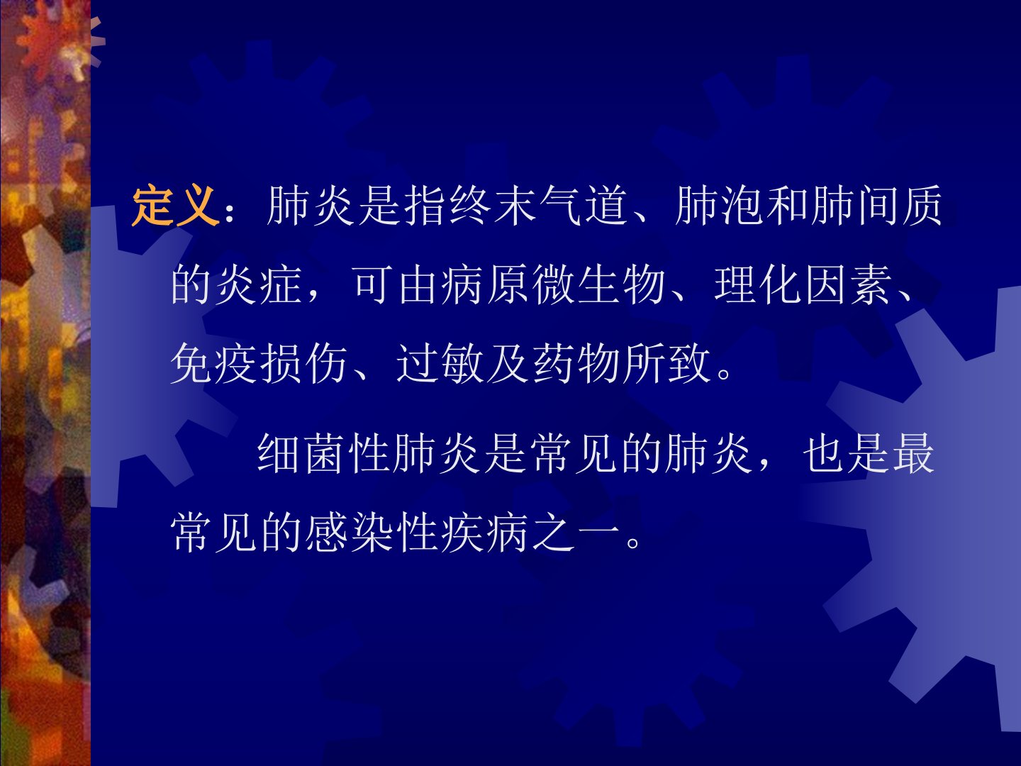 肺炎指终末气道、肺泡和肺间质的炎症可由多种因素引起细菌性肺炎为常见类型。『流行病学』方面社会人口老龄化、吸烟、伴有基础疾病和免疫功能低下导致肺炎发病和病死率高。『病因、发病机制和病理』上病原体和宿主因素决定肺炎发生病原体可通过多种途径引发感染。『分类』包括解剖分类(大叶性、小叶性、间质性肺炎)、病因分类(细菌性、非典型病原体、病毒性、真菌性、其他病原体、理化因素所致肺炎)、患病环境分类(社区获得性肺炎、医院获得性肺炎)。『临床表现』常见症状为咳嗽、咳痰等。『诊断与鉴别诊断』需区分肺炎与上呼吸道感染等评估严重程度确定病原体。治疗方面抗感染治疗是肺炎治疗的最主要环节常用药物包括大环内酯类、青霉素类等。肺炎链球菌肺炎、葡萄球菌肺炎、肺炎支原体肺炎、病毒性肺炎、传染性非典型肺炎、真菌性肺炎等各有特点需针对性治疗。