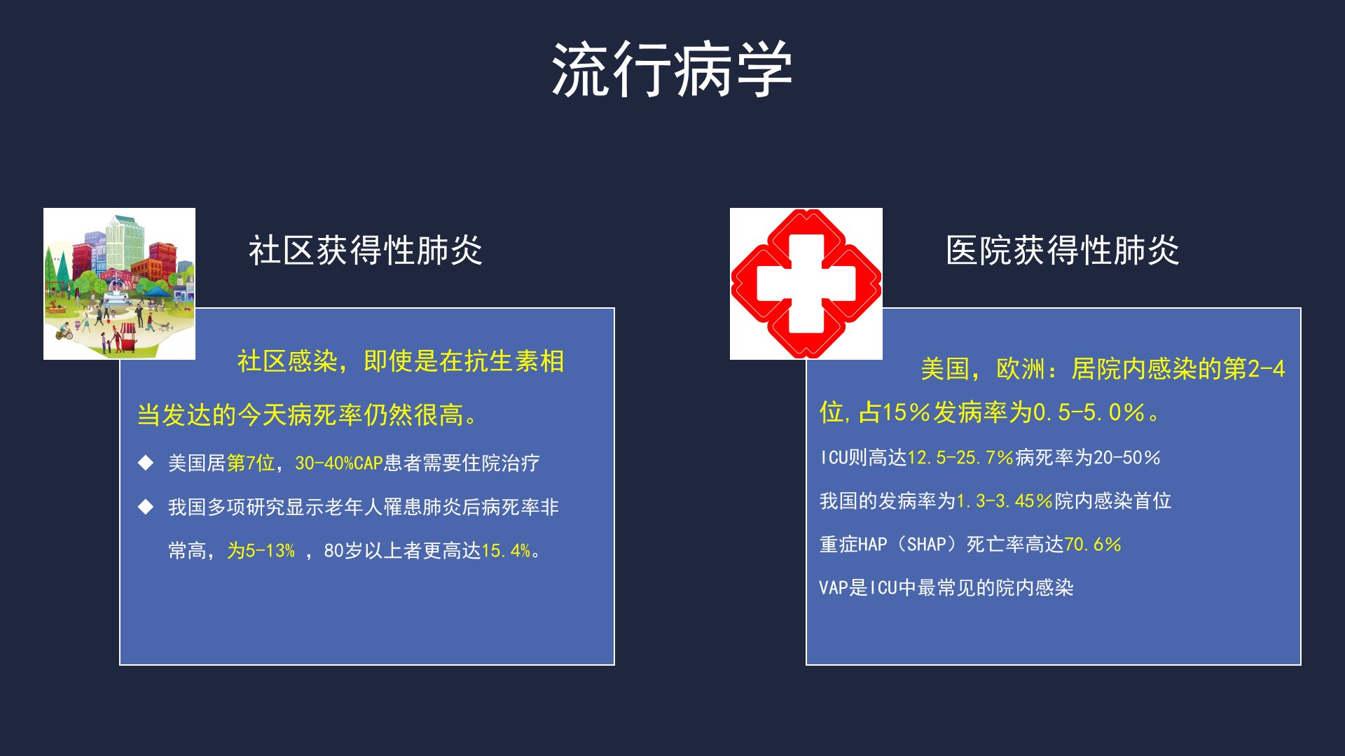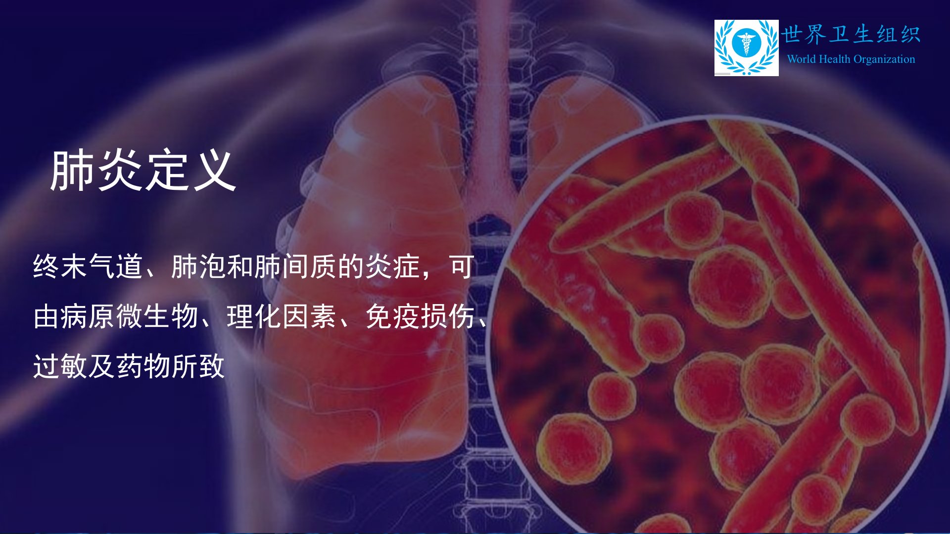肺炎指终末气道、肺泡和肺间质的炎症可由病原微生物、理化因素、免疫损伤、过敏及药物等多种因素所致包括社区获得性肺炎(CAP)和医院获得性肺炎(HAP)。即使在抗生素相当发达的今天肺炎病死率仍然很高美国居第7位我国多项研究显示老年人罹患肺炎后病死率非常高80岁以上者更高。肺炎也是院内感染主要疾病之一重症HAP(SHAP)死亡率高达706。肺炎可根据病原体和病理特征分类如细菌性、病毒性、真菌性等。CAP指在医院外罹患的感染性肺实质炎症HAP指患者入院时不存在、入院48h后发生的肺实质炎症。肺炎诊断依据包括临床表现、白细胞升高、胸X线大片炎症渗出等需排除肺结核、肺部肿瘤等疾病。肺炎需与肺栓塞鉴别后者胸片可无渗出需通过DVTCT检查、CTPA肺动脉造影确诊。肺炎治疗包括抗感染和预防。