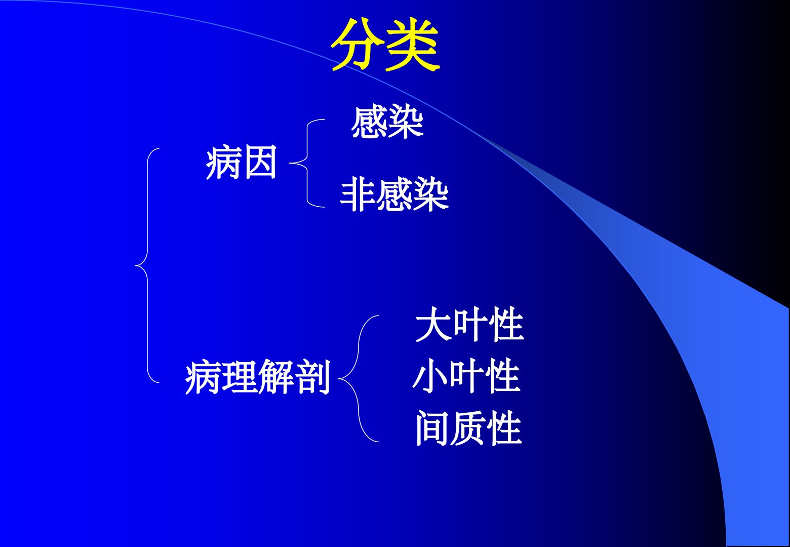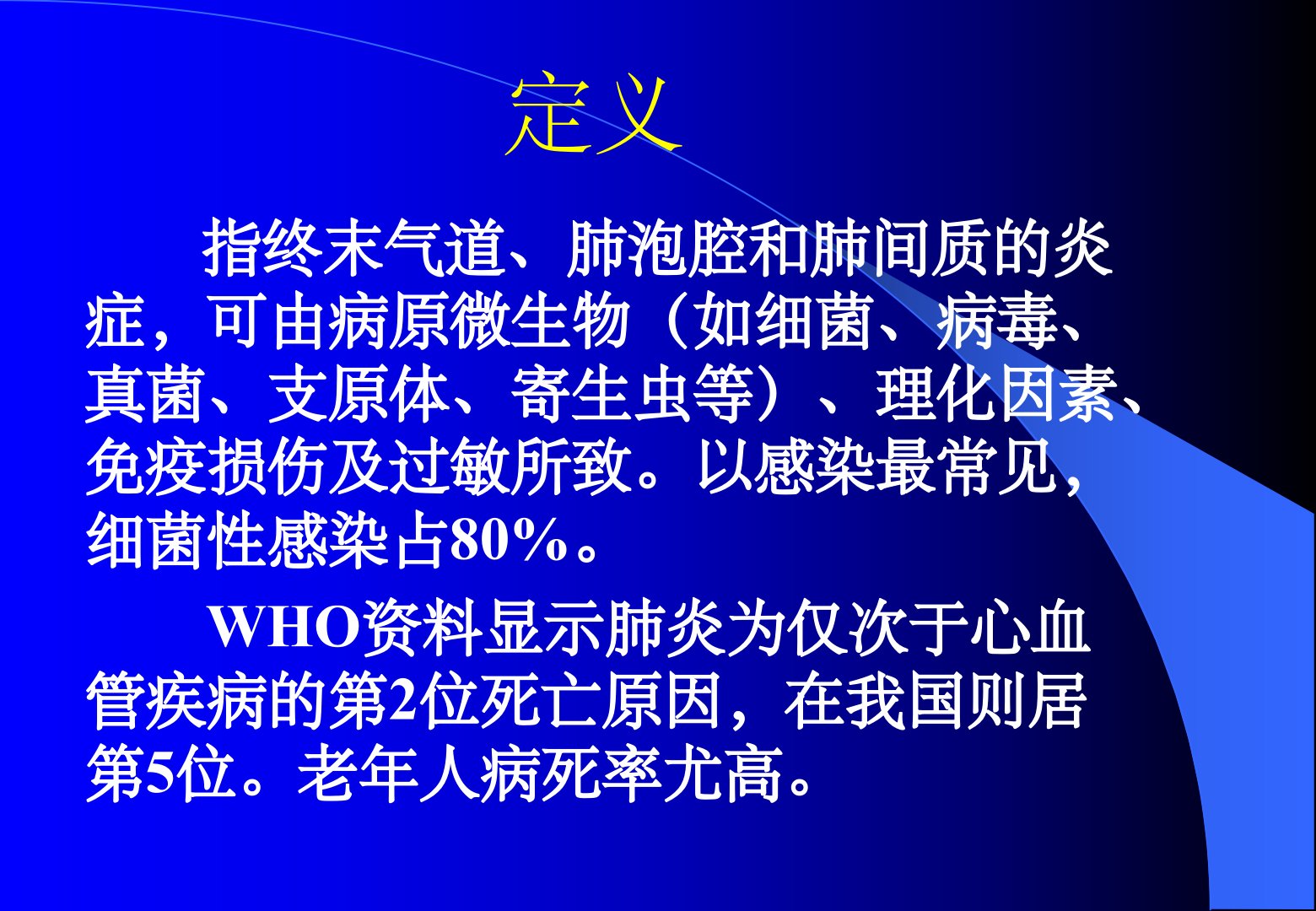 肺炎指终末气道、肺泡腔及肺间质的炎症可由病原微生物、理化因素、免疫损伤及过敏导致以感染最常见细菌性感染占80。WHO资料显示肺炎为仅次于心血管疾病的第2位死亡原因老年人病死率尤高。肺炎按病因可分为感染性肺炎(最常见)和非感染性肺炎后者包括放射性肺炎、化学性肺炎等;按病理解剖肺炎可分为大叶性肺泡性肺炎、小叶性支气管性肺炎和间质性肺炎。其中肺炎球菌肺炎由肺炎链球菌引起约占医院外感染肺炎的50分为充血期、红色肝变期、灰色肝变期、消散期四个时期患者常起病急骤有寒战、高热等症状。葡萄球菌肺炎由葡萄球菌所致常引起组织坏死死亡率较高症状包括寒战、高热、胸痛等X线阴影易变性是金葡菌肺炎的重要特征。克雷伯杆菌肺炎常有肺组织坏死多吸入致病常见于老年男性等群体病死率较高。肺炎支原体肺炎由肺炎支原体引起常同时伴有咽炎、支气管炎儿童、青年多见其致病性与患者对病原体及其代谢产物的过敏反应有关。病毒性肺炎常由上呼吸道病毒感染向下蔓延所致儿童常见症状通常较轻但小儿和老人症状较重。肺炎治疗包括一般性治疗、对症处理、抗生素应用及并发症处理。