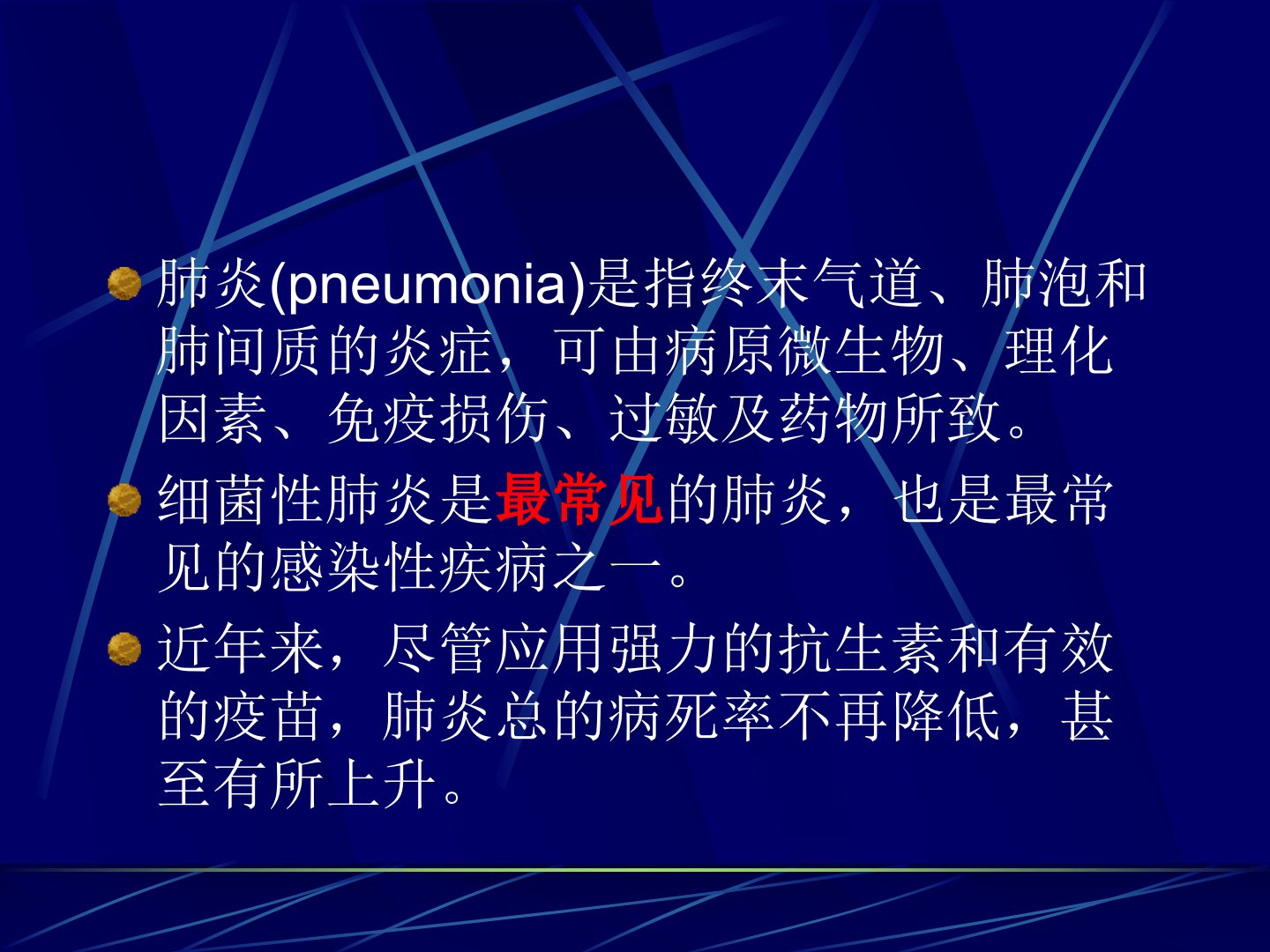 肺炎是终末气道、肺泡和肺间质的炎症可由病原微生物、理化因素等引起细菌性肺炎尤为常见。近年来尽管采用了强力的抗生素和有效的疫苗肺炎的病死率却未降低甚至上升。肺炎可按解剖、病因或患病环境分类病因包括细菌性、非典型病原体、病毒性、真菌性及其他病原体所致还有理化因素所致的肺炎。其临床诊断依据包括新近出现的呼吸道症状、发热、肺实变体征等。重症肺炎需要呼吸及循环支持并加强监护和治疗。确定病原体时需考虑多种因素采集标本时要避免污染。治疗以抗感染为主根据病原体类型、患者情况选择抗生素。预防措施包括加强锻炼、减少危险因素、接种疫苗。肺炎链球菌肺炎好发于青壮年临床特征为突发寒战、高热等近年来轻症和不典型者较多见。其病理过程包括充血期、红色肝样变期、灰色肝样变期和消散期。临床表现包括全身症状和呼吸系统症状部分病人有消化道症状老人及婴幼儿可能表现为支气管肺炎。并发症包括感染性休克、渗出性胸膜炎、中毒性心肌炎等。诊断要点包括诱因、症状、体征和X线检查等需与其他感染性肺炎、急性肺脓肿、肺结核、支气管肺病及其他疾病相鉴别。治疗包括一般治疗、抗菌素治疗、休克型肺炎的治疗及并发症的处理。本病通常预后好但年老体弱、有基础