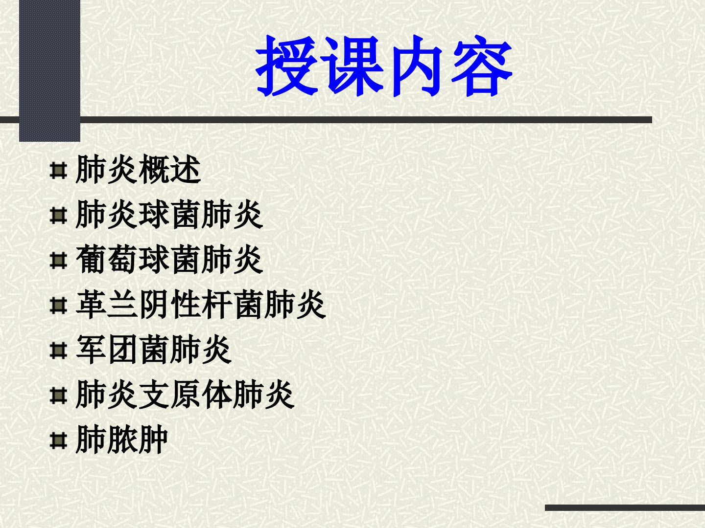 第五章肺炎和肺脓肿Respiratorysystemanatomicalchart授课内容肺炎概述肺炎球菌肺炎葡萄球菌肺炎革兰阴性杆菌肺炎军团菌肺炎肺炎支原体肺炎肺脓肿第一节肺炎概述概述1、肺炎(pneumonia)是指终末气道、肺泡和肺间质的炎症,可由病原微生物(感染最为常见)、理化因素、免疫损伤、过敏及药物所致。2、肺实质与肺间质3、肺炎是呼吸系统的常见病、多发病WHO资料显示肺炎为仅次于心血管疾病的第2位死亡原因,在我国则居第5位。肺炎死亡率占呼吸系统急性感染死亡率的75.5%近年来肺炎发病率与病死率有增加趋势原因:·社会人口老龄化·吸烟·伴有基础病和免疫功能低下·病原体变迁,诊断困难·...