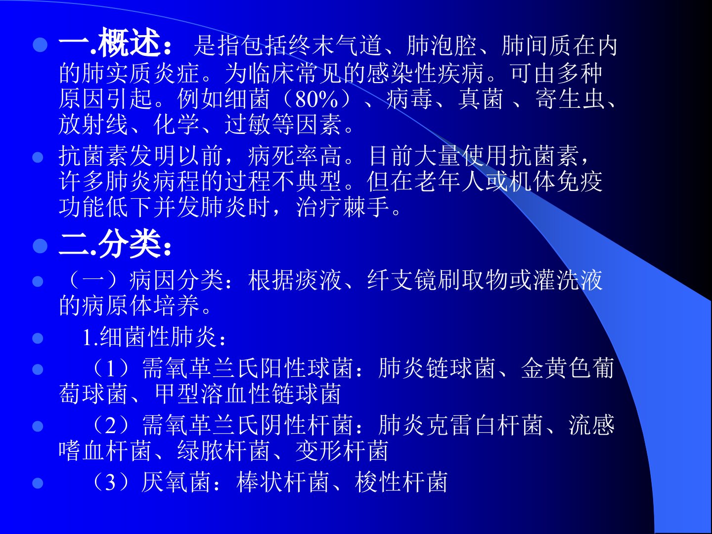 肺炎摘要一、概述肺炎是肺实质炎症为常见感染性疾病可由细菌、病毒、真菌、寄生虫等多种因素引起。抗菌素发明前病死率高大量使用后病程不典型但老年人或免疫功能低下者治疗仍棘手。二、分类(一)病因分类1细菌性肺炎:如肺炎链球菌、金黄色葡萄球菌等。2病毒性肺炎:如流感病毒、腺病毒。3支原体肺炎4真菌性肺炎:如白色念珠球菌、曲菌。5其他病原体所致肺炎(二)细菌性肺炎分类1社区获得性肺炎:主要病原菌为肺炎球菌、肺炎克雷白杆菌。2院内获得性肺炎:阴性菌多见如绿脓杆菌产生原因包括病情重、免疫功能低下等。(三)解剖分类1大叶性肺炎:多为肺炎球菌致病肺实质炎变不累及支气管。2小叶性肺炎:病原体经支气管入侵多继发于其他疾病。3间质性肺炎:以肺间质为主的炎症可由细菌或病毒引起。三、临床表现与诊断1症状:起病急骤寒战高热咳嗽咯痰胸痛呼吸困难。2体征:急性病容肺实变体征。3并发症:感染性休克、胸膜炎或脓胸、心肌炎、肺外并发症。4诊断:病原学检测是确诊本病的主要依据。四、治疗1抗菌药物治疗:首选青霉素等疗程57天。2支持疗法:卧床休息多饮水。3并发症处理:考虑肺炎球菌肺炎以外的肺部感染。4感染性休克治疗:包括吸氧、补充