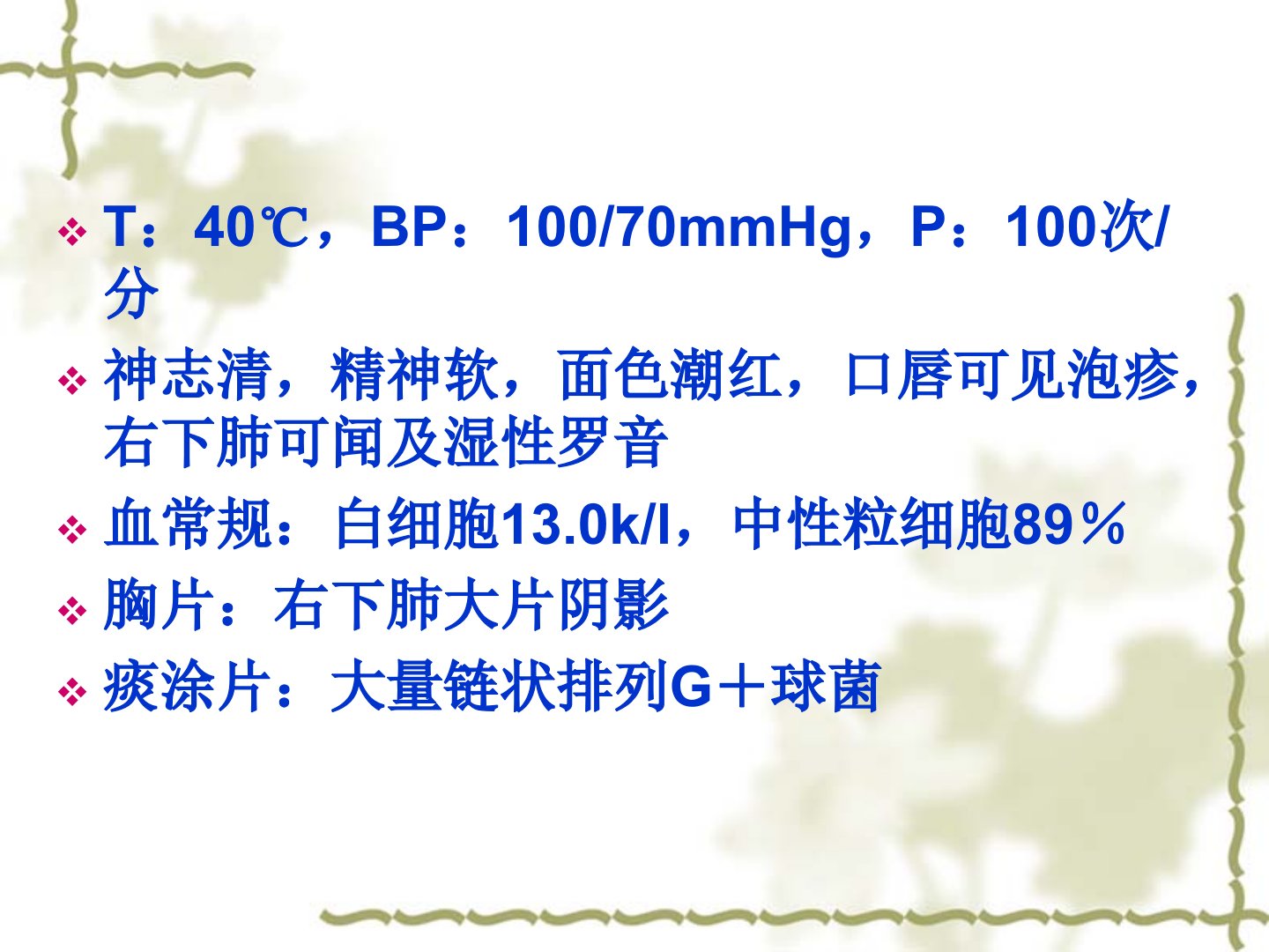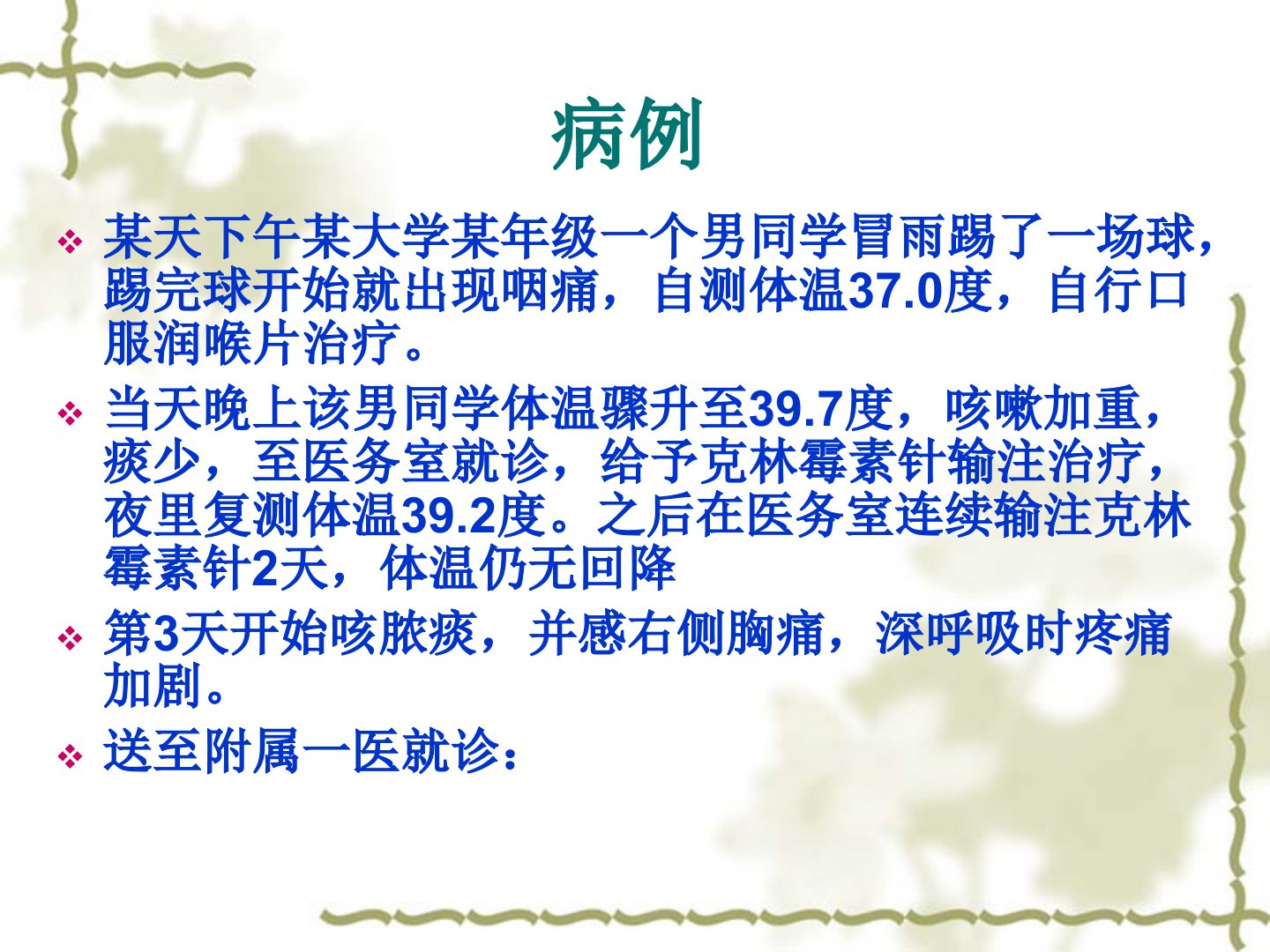 某大学男同学冒雨踢球后出现咽痛自测体温37度口服润喉片后当晚体温升至397度咳嗽加重医务室给予克林霉素针输注但体温未降。第3天咳脓痰右侧胸痛加剧送至医院就诊检查显示:T:40BP:10070mmHgP:100次分神志清精神软面色潮红口唇有泡疹右下肺可闻及湿性罗音白细胞和中性粒细胞升高胸片显示右下肺大片阴影痰涂片见大量链状排列G球菌诊断为肺炎。肺炎指包括终末气道、肺泡腔及肺间质等在内的肺实质炎症病因以感染最常见。该病例按感染场所分属社区获得性肺炎按病因分属感染性肺炎中的细菌性肺炎、肺炎球菌肺炎。其发病机制与带荚膜G球菌有关诱因包括受凉、淋雨等症状包括寒颤、高热、咳嗽等。实验室检查可见WBC升高等。治疗包括对症支持、抗菌药物治疗首选青霉素预防需避免诱因、加强锻炼。