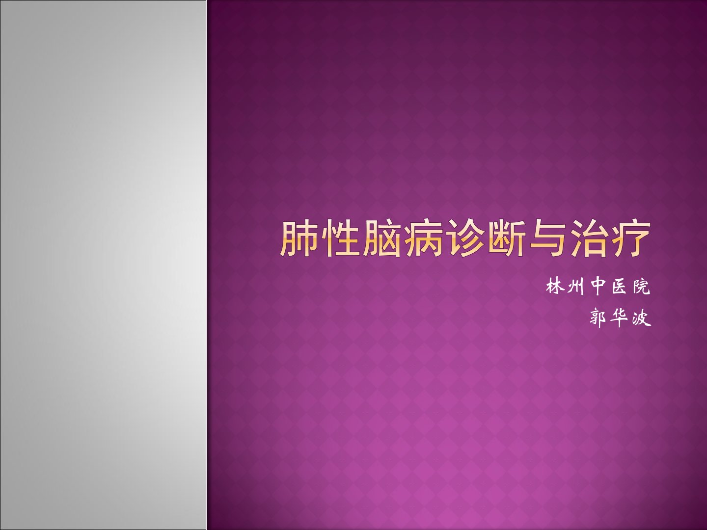 林州中医院郭华波医生介绍了肺性脑病的诊断与治疗。肺性脑病临床表现分为兴奋型、抑制型和不定型三类症状从烦躁不安、精神萎靡到深昏迷不等。诊断标准基于慢性肺、胸膜疾患伴呼吸功能衰竭出现缺氧二氧化碳潴留的临床表现及意识障碍、神经精神症状结合动脉血气分析结果。病情分轻型、中型、重型三型。鉴别诊断包括脑动脉硬化症、感染中毒性脑病和电解质紊乱。治疗原则包括合理氧疗立即给予持续低流量吸氧;积极控制呼吸道感染尽快做痰培养寻找对病原菌敏感的抗生素;呼吸兴奋剂的应用可兴奋呼吸中枢改善二氧化碳潴留状态;机械通气是治疗肺性脑病最有效的措施;以及心力衰竭处理包括血管扩张剂、钙离子拮抗剂等的应用和脑保护治疗及对症治疗。