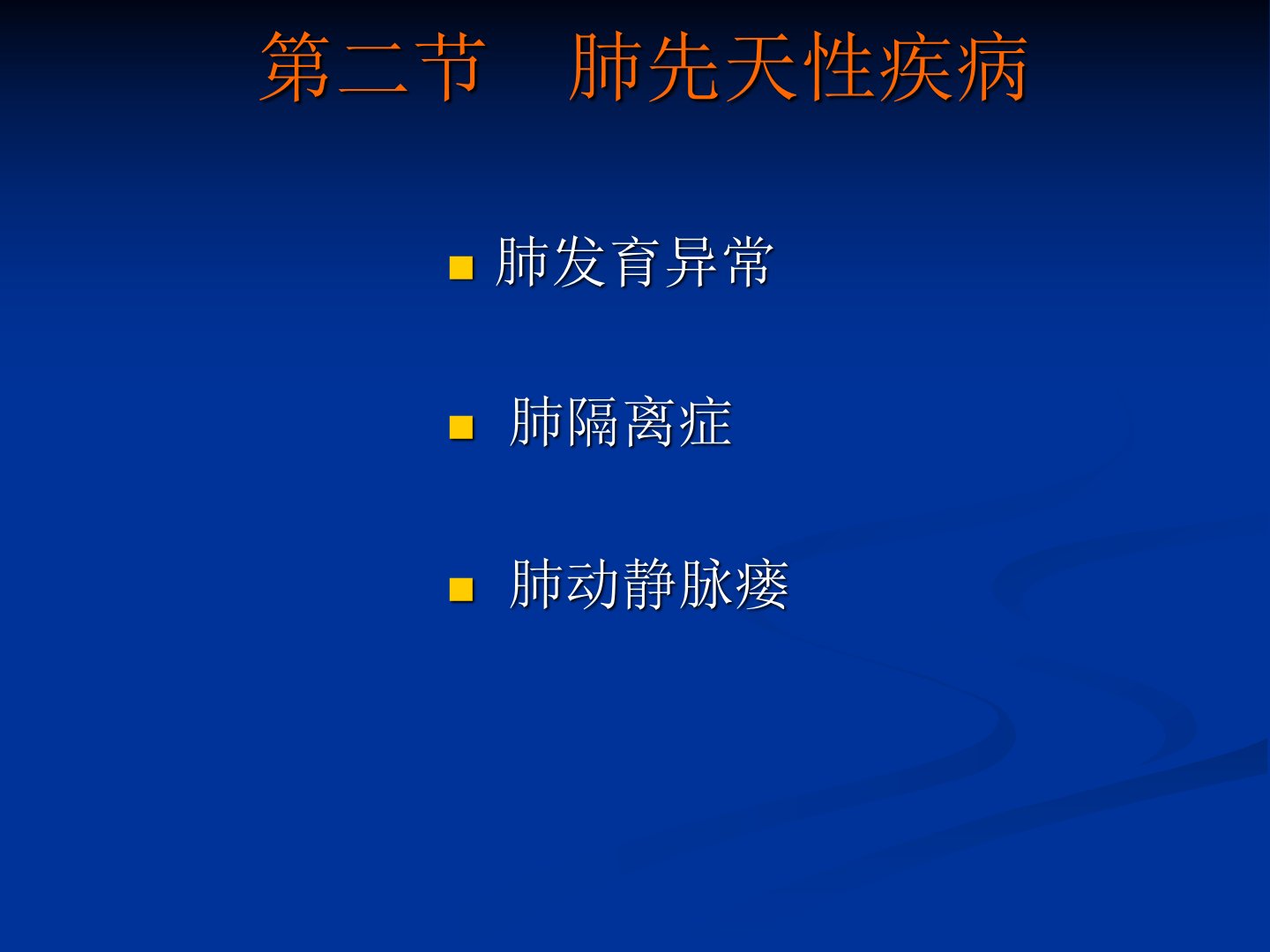 第四章呼吸系统第二节介绍了肺先天性疾病包括肺发育异常、肺隔离症和肺动静脉瘘。1肺发育异常:分肺不发育、肺发育不全和肺叶发育不全三种。临床无特征性症状部分病人有胸闷、气短继发感染可咳嗽患侧呼吸音减弱或消失。影像学上X线、CT和MRI可显示患侧肺部无含气肺组织及支气管影像心脏纵隔移向患侧健侧肺呈代偿性肺气肿。需与肺不张、肺隔离症鉴别。2肺隔离症:多见于青年分肺叶内型和肺叶外型。临床多数无症状部分有发热、咳嗽等症状。影像学上X线、CT和MRI可显示病变区边缘清楚的软组织密度影内部为囊样结构或实性肺组织块供血动脉多来自降主动脉或腹主动脉。3肺动静脉瘘:肺部的动脉和静脉直接相通分单纯型和复杂型。临床病人多无症状较大瘘可出现呼吸困难等症状。影像学上X线、CT和MRI可显示囊状或弥漫性肺小动静脉瘘表现为结节影或葡萄状高密度阴影。