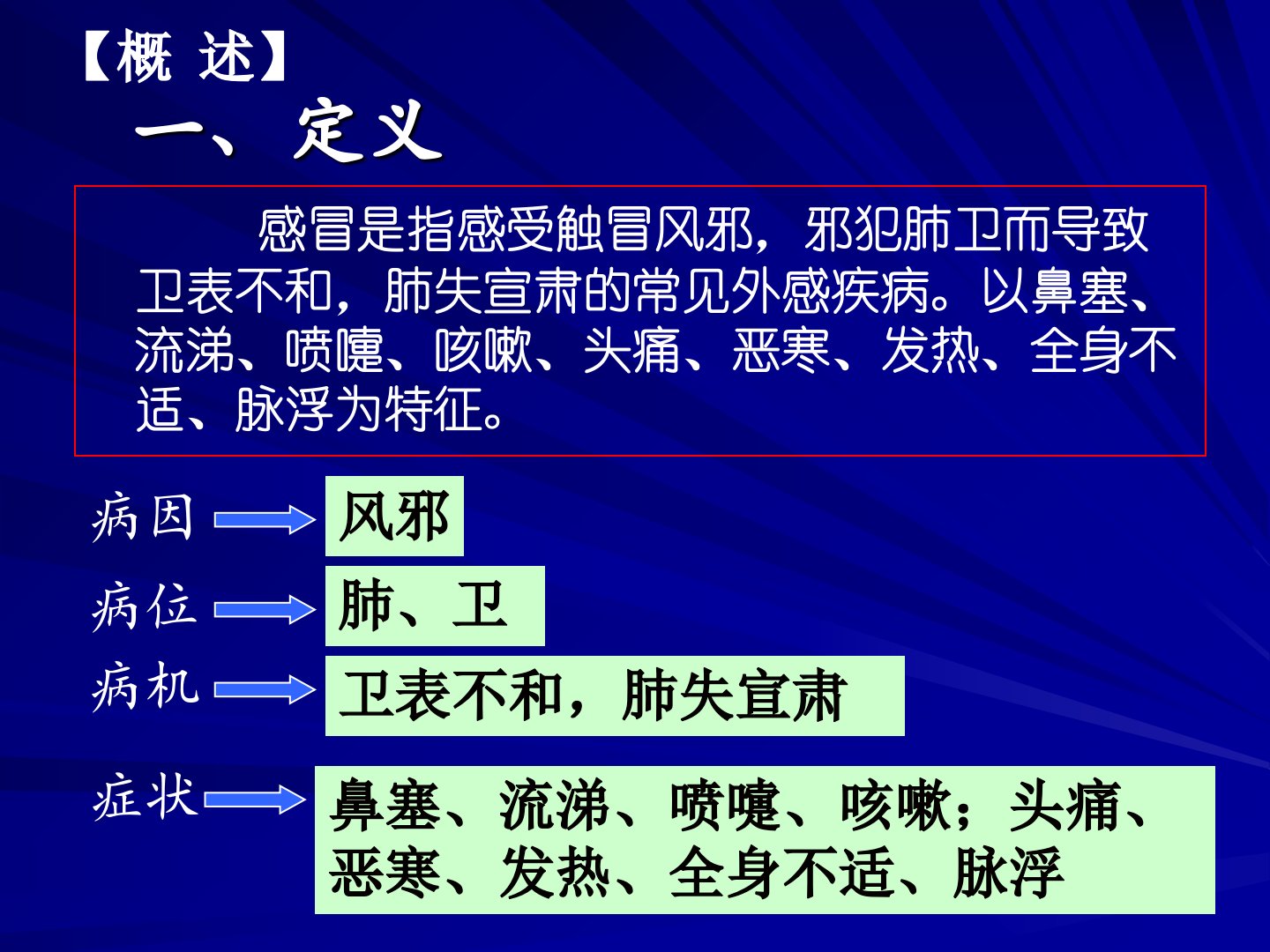 第一章肺系病证第一节感冒一、定义感冒是指感受触冒风邪,邪犯肺卫而导致卫表不和,肺失宣肃的常见外感疾病。以鼻塞、流涕、喷嚏、咳嗽、头痛、恶寒、发热、全身不适、脉浮为特征。【概述】病因病位病机症状风邪肺、卫卫表不和,肺失宣肃鼻塞、流涕、喷嚏、咳嗽;头痛、恶寒、发热、全身不适、脉浮广泛流行,证候相似。非时之气夹时行疫毒。四季均可发生,冬春为多。当令之气。伤风、冒风、冒寒。非时之气。重伤风。轻者:重者:时行感冒:发病季节:二、源流《内经》《素问·骨空论》“风者百病之始也,……风从外入,令人振寒,汗出头痛,身重恶寒。”《素问·风论》“风之伤人也,或为寒热。”《仁斋直指方》在论述参苏饮时,首提“感冒”一词...