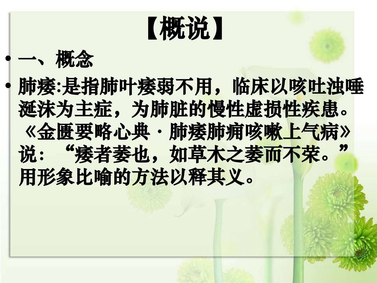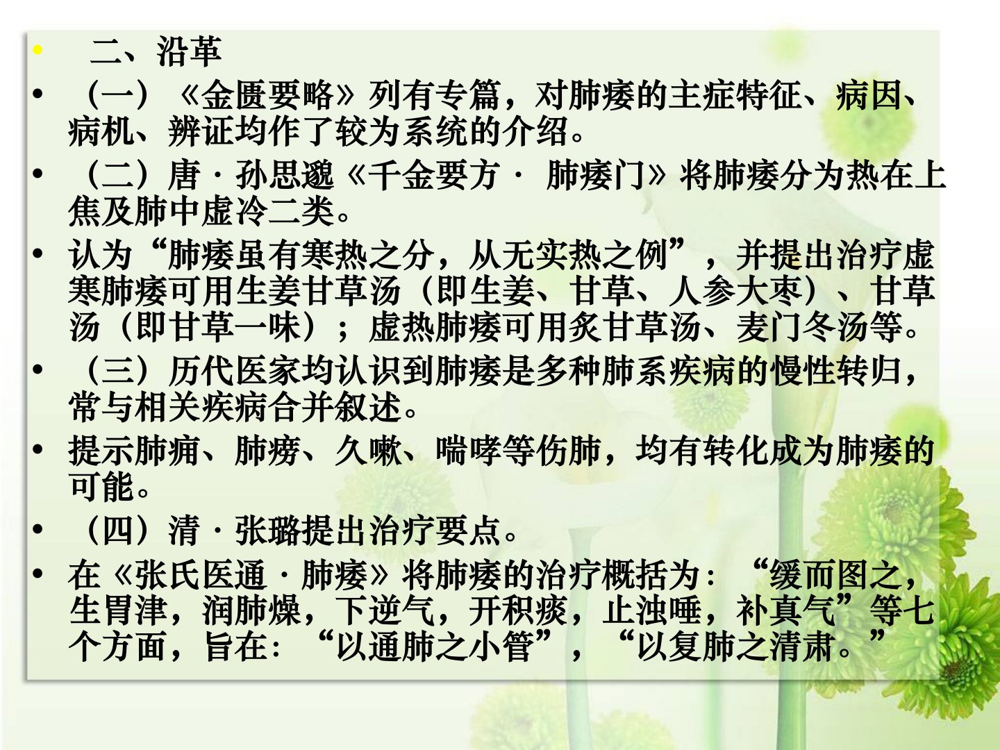 肺系病证肺痿【概说】一、概念肺痿:是指肺叶痿弱不用,临床以咳吐浊唾涎沫为主症,为肺脏的慢性虚损性疾患。《金匮要略心典·肺痿肺痈咳嗽上气病》说:“痿者萎也,如草木之萎而不荣。”用形象比喻的方法以释其义。二、沿革(一)《金匮要略》列有专篇,对肺痿的主症特征、病因、病机、辨证均作了较为系统的介绍。(二)唐·孙思邈《千金要方·肺痿门》将肺痿分为热在上焦及肺中虚冷二类。认为“肺痿虽有寒热之分,从无实热之例”,并提出治疗虚寒肺痿可用生姜甘草汤(即生姜、甘草、人参大枣)、甘草汤(即甘草一味);虚热肺痿可用炙甘草汤、麦门冬汤等。(三)历代医家均认识到肺痿是多种肺系疾病的慢性转归,常与相关疾病合并叙述。提示肺痈...