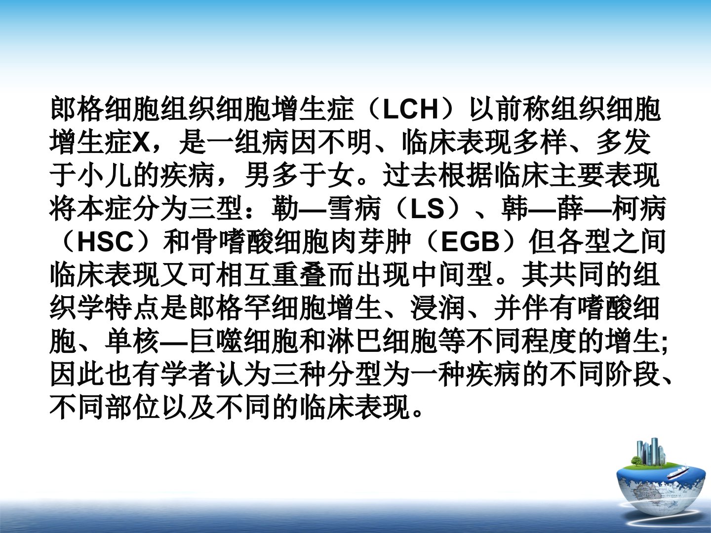 肺朗格汉斯细胞增生症(PLCH)属朗格汉斯细胞组织细胞增生症(LCH)是一组病因不明、临床表现多样的疾病多发于小儿且男性多于女性。过去该病分为勒—雪病(LS)、韩—薛—柯病(HSC)和骨嗜酸细胞肉芽肿(EGB)三型各型间表现可重叠。LS型起病急多侵犯全身多个系统器官但不累及骨骼系统;HSC型起病缓慢骨质缺损、尿崩、突眼为三大主症累及骨骼;EGB型主要累及骨骼系统多为单发病灶。此外还有混合型和单一器官型。辅助检查方面血液学检查可见贫血等异常病理检查是诊断的金标准影像学检查主要针对呼吸系统及骨骼肌肉系统其中胸部CT早期表现为双肺内广泛分布的细支气管周围渗出的斑片影、磨玻璃影和结节影中晚期可出现大囊泡状改变骨骼系统影像学表现随病情进展而变化。该病还需与LAM、肺结节病、过敏性肺炎等进行鉴别诊断。影像学检查对PLCH的诊断有深远意义可提供病变范围、累及部位等信息。