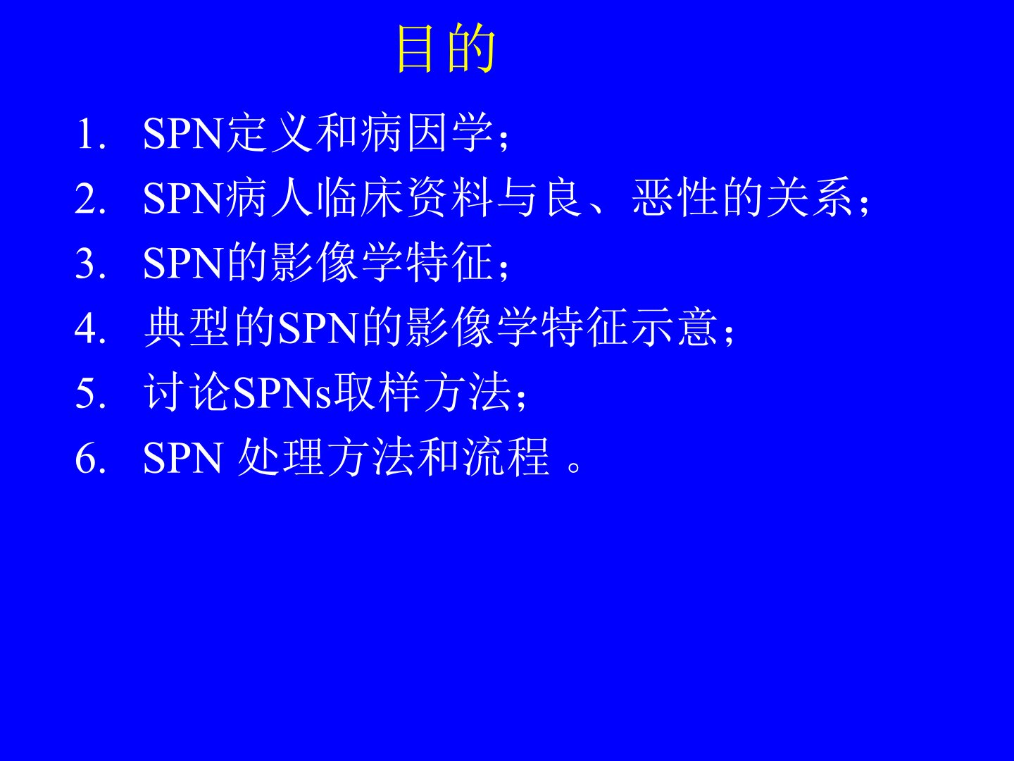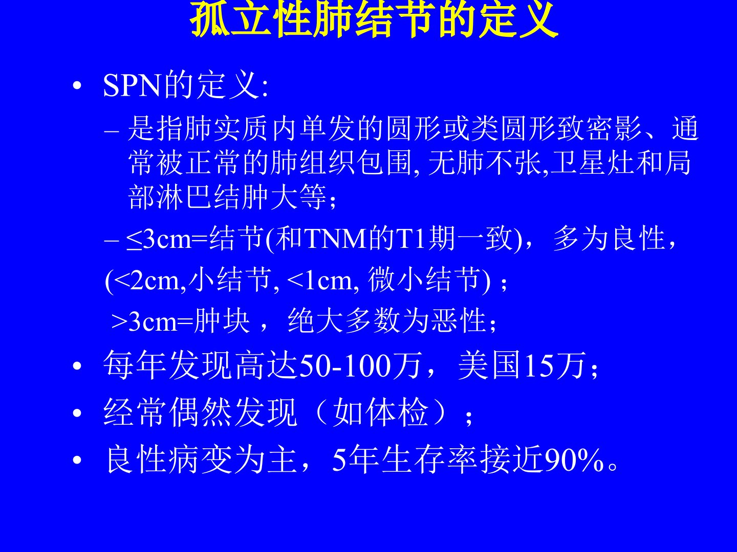 孤立性肺结节SolitaryPulmonaryNodules(SPN)安徽医科大学第一附属医院费广鹤教授目的SPN定义和病因学;SPN病人临床资料与良、恶性的关系;SPN的影像学特征;典型的SPN的影像学特征示意;讨论SPNs取样方法;SPN处理方法和流程。孤立性肺结节的定义SPN的定义:是指肺实质内单发的圆形或类圆形致密影、通常被正常的肺组织包围,无肺不张,卫星灶和局部淋巴结肿大等;≤3cm=结节(和TNM的T1期一致),多为良性,(孤立性肺结节的病因学肿瘤感染(包括真菌感染)炎症血管损害外伤后先天性肺囊肿肺栓塞淀粉样变类风湿结节肺内淋巴结浆细胞肉芽肿结节病粘液栓塞血肿乳房影良性肿瘤(70%...