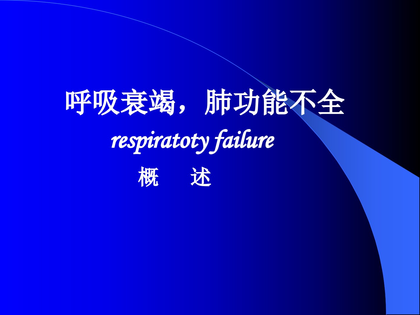 呼吸衰竭,肺功能不全respiratotyfailure概述InternalRespirationExternalRespirationGasTransport一、概念:外呼吸功能严重障碍→PaO2↓或伴有PaCO2↑的病理过程判断标准:PaO2<8kPa(60mmHg)PaCO2>6.6kPa(50mmHg)呼吸衰竭指数(RFI):RFI=PaO2/FiO2,≤300诊断为呼衰二、呼吸衰竭的分类根据血气变化特点:呼衰低氧血症型(Ⅰ型)Hypoxemicrespiratoryfailure低氧血症伴高碳酸血症型(Ⅱ型)Hypercapnicrespiratoryfailure又称通气障碍型第二...