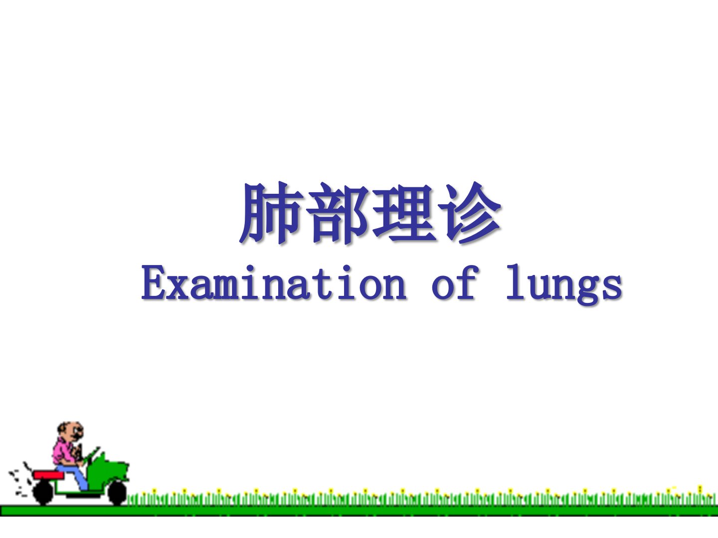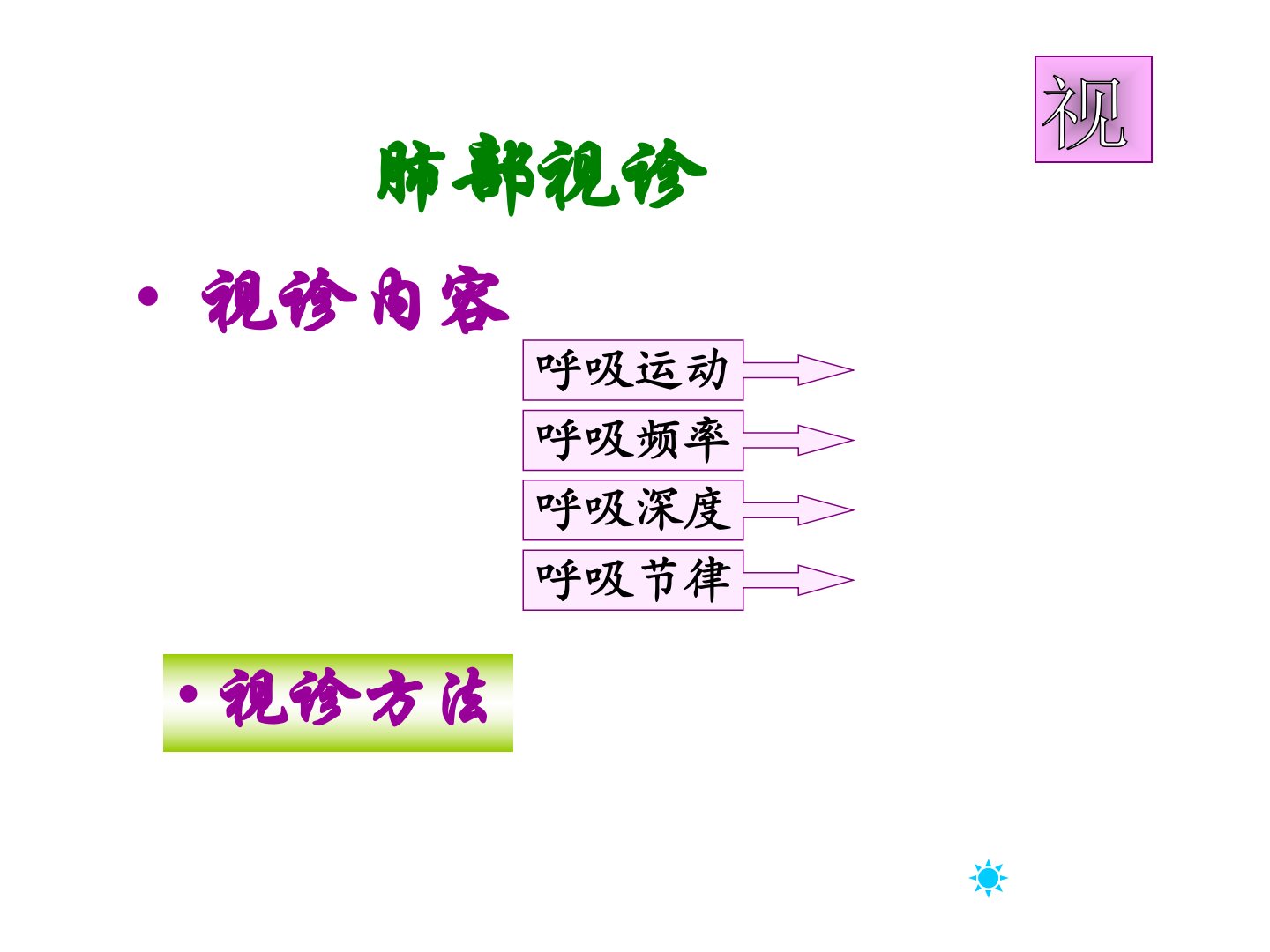 肺部理诊Examinationoflungs肺部视诊视诊方法视诊内容呼吸运动呼吸频率呼吸深度呼吸节律视视诊方法视呼吸运动腹式呼吸:男性、儿童胸式呼吸:女性(一)呼吸运动类型视呼吸运动类型:呼吸运动类型的改变胸式腹式——肺、胸膜以及胸壁疾病腹式胸式——腹水、肝脾肿大、妊娠后期呼吸减弱或消失局限性呼吸运动减弱或消失见于大叶肺炎、肺结核、肺脓肿、肺肿瘤、肺叶不张、少量胸积液及局限性胸膜增厚或粘连等。一侧呼吸运动减弱或消失见于一侧的大量胸积液、气胸、广泛胸膜增厚粘连、肺不张、呼吸肌麻痹等。双侧呼吸运动减弱或消失见于慢性阻塞性肺气肿、双侧的大量胸积液、气胸、呼吸肌麻痹、中枢神经病变等。胸式呼吸减弱,腹式...