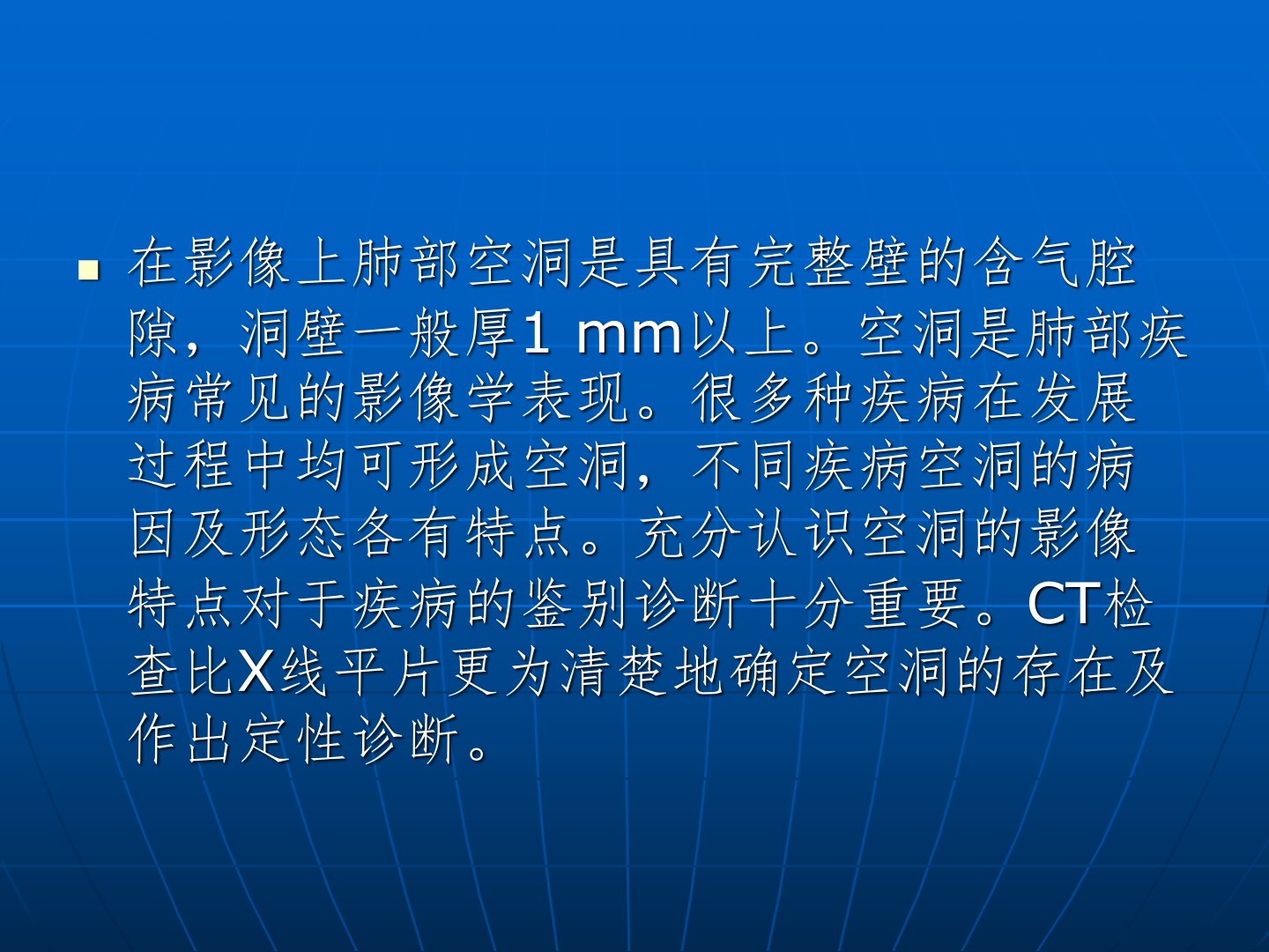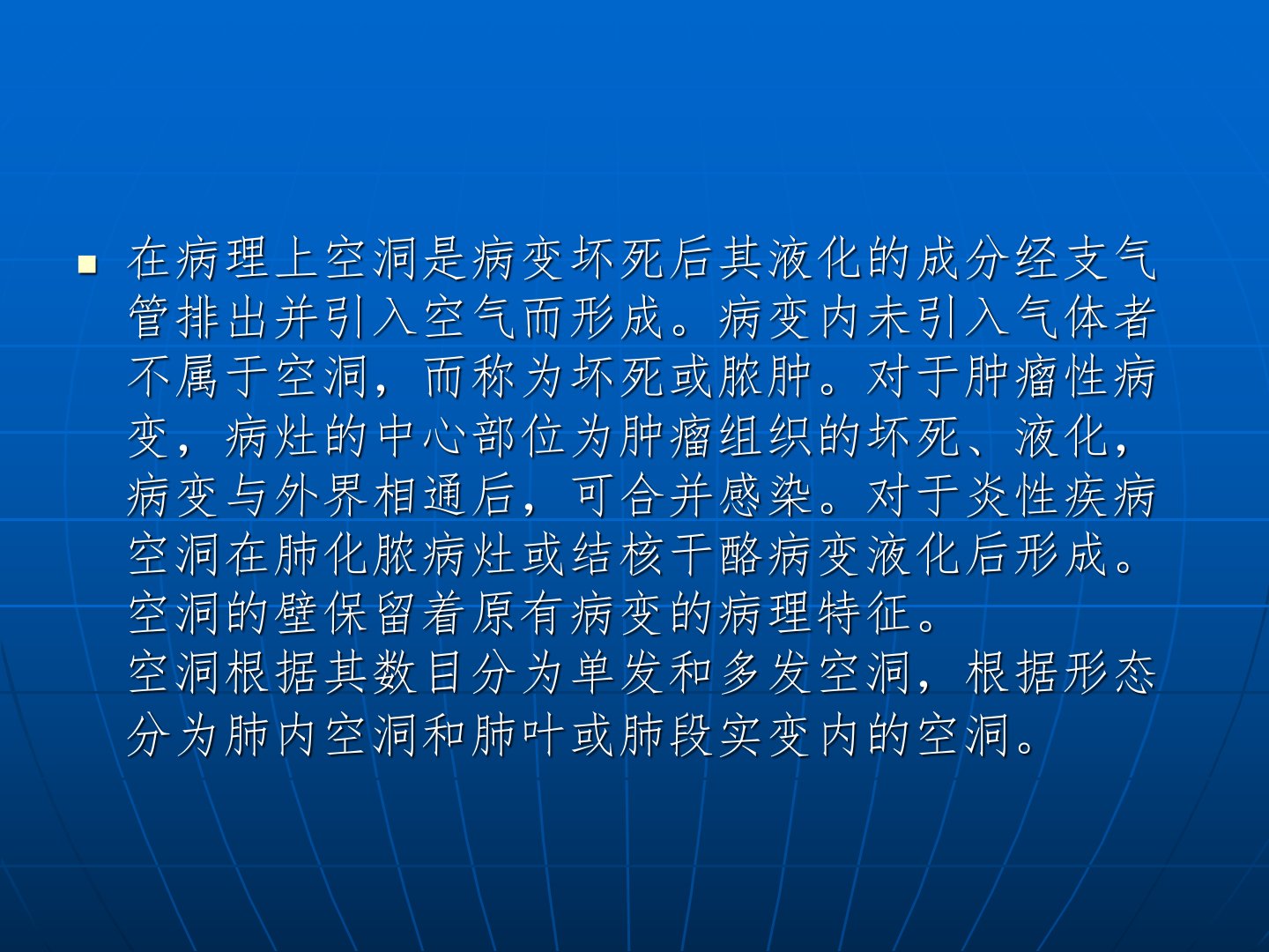 肺部空洞(样)病灶是肺部疾病常见的影像学表现CT比X线平片能更清楚地确定空洞及作出定性诊断。空洞是病变坏死后液化成分经支气管排出并引入空气而形成根据数目分为单发和多发空洞根据形态又分为肺内空洞和肺叶或肺段实变内的空洞。肺内单发空洞常见于周围型支气管肺癌、肺结核、肺脓肿、肺霉菌病、尘肺等不同疾病空洞的病因及形态各有特点。肺内多发空洞则多见于肺结核、肺转移瘤、霉菌病、淋巴瘤、类风湿性肺病等。此外肺叶、肺段病变也可能形成空洞如肺炎合并肺脓肿、肺结核的虫噬状空洞等。在诊断过程中还需注意与空腔病变相鉴别如肺大泡、囊状支气管扩张、肺囊肿等。