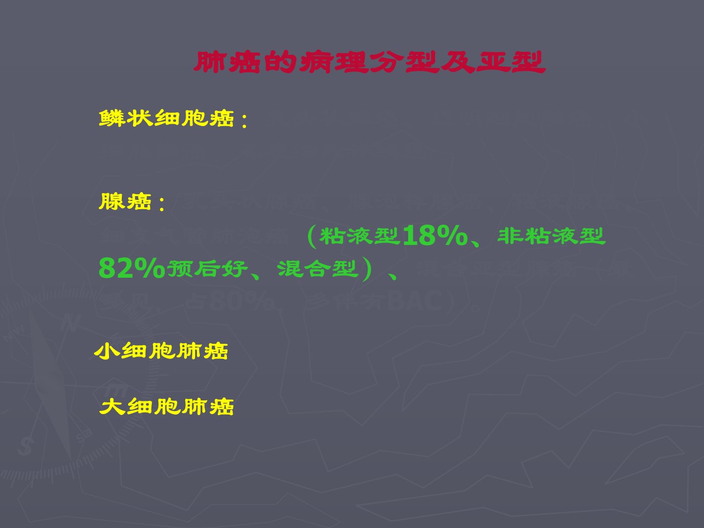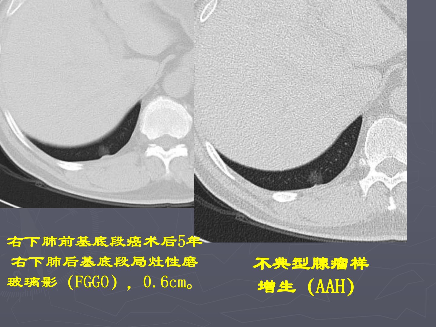 肺部结节的鉴别诊断肺癌的病理分型及亚型鳞状细胞癌:乳头状鳞癌、透明细胞鳞癌、小细胞鳞癌、基底细胞样鳞癌。腺癌:乳头状腺癌、腺泡样腺癌、粘液腺癌、细支气管肺泡癌(粘液型18%、非粘液型82%预后好、混合型)、混合亚型腺癌(最多见,占80%,多伴有BAC)。小细胞肺癌大细胞肺癌不典型腺瘤样增生(AAH)右下肺前基底段癌术后5年右下肺后基底段局灶性磨玻璃影(FGGO),0.6cm。BAC42/F体检发现右肺结节。另一个BAC细支气管肺泡癌(BAC)AAH54/F体检发现右肺结节。AAH68/M,食管癌术前CT发现左上肺边缘较光整、边界清晰的类圆形NGGO,3cm。中分化腺癌与BAC混合亚型54/M体...