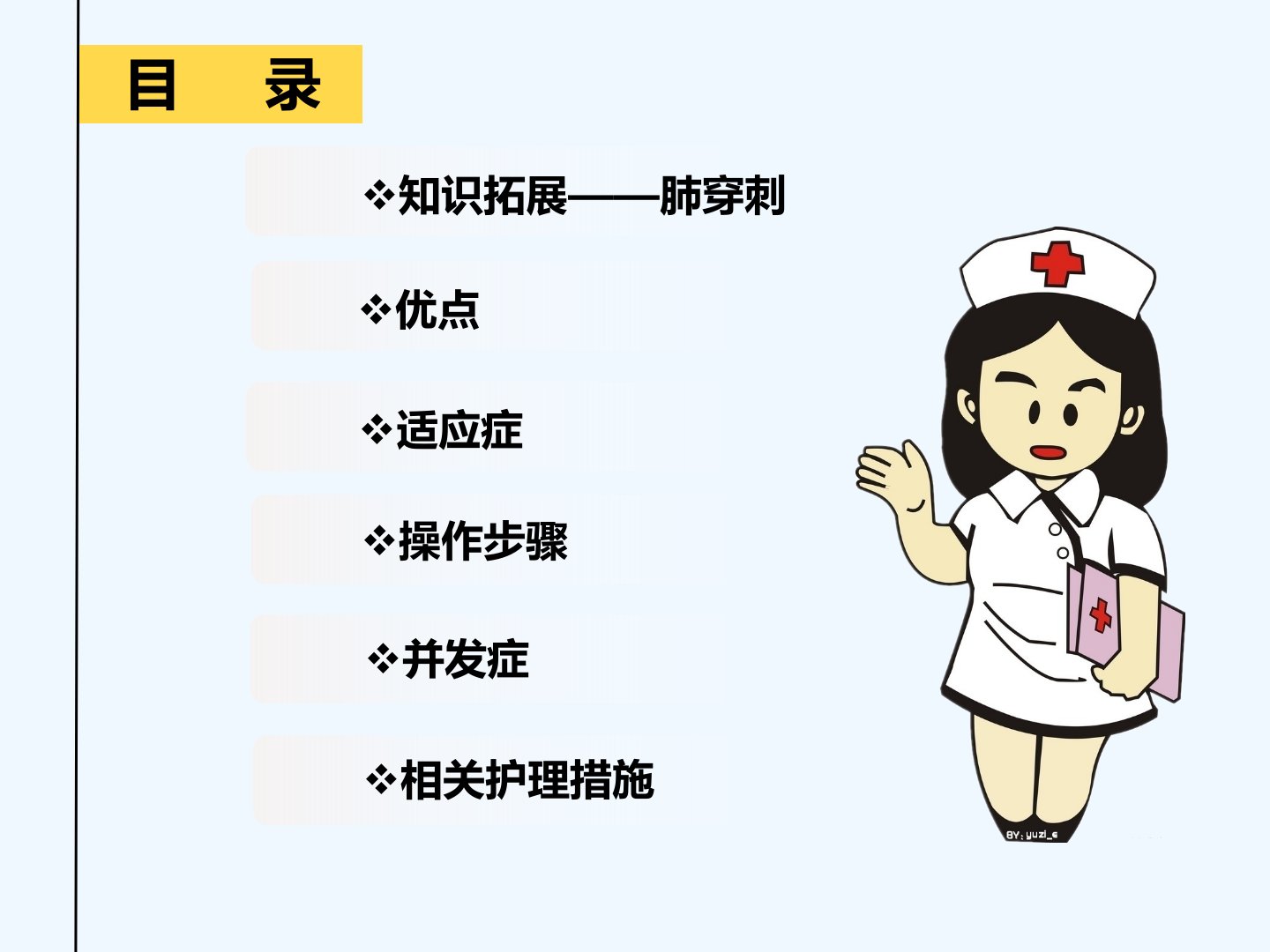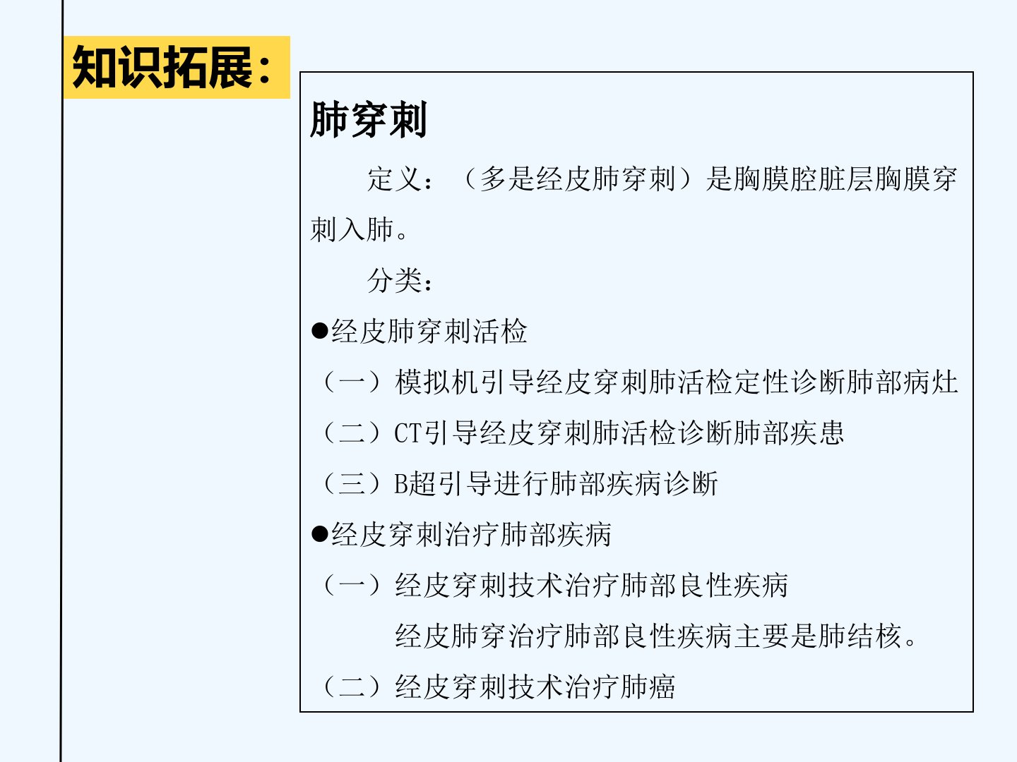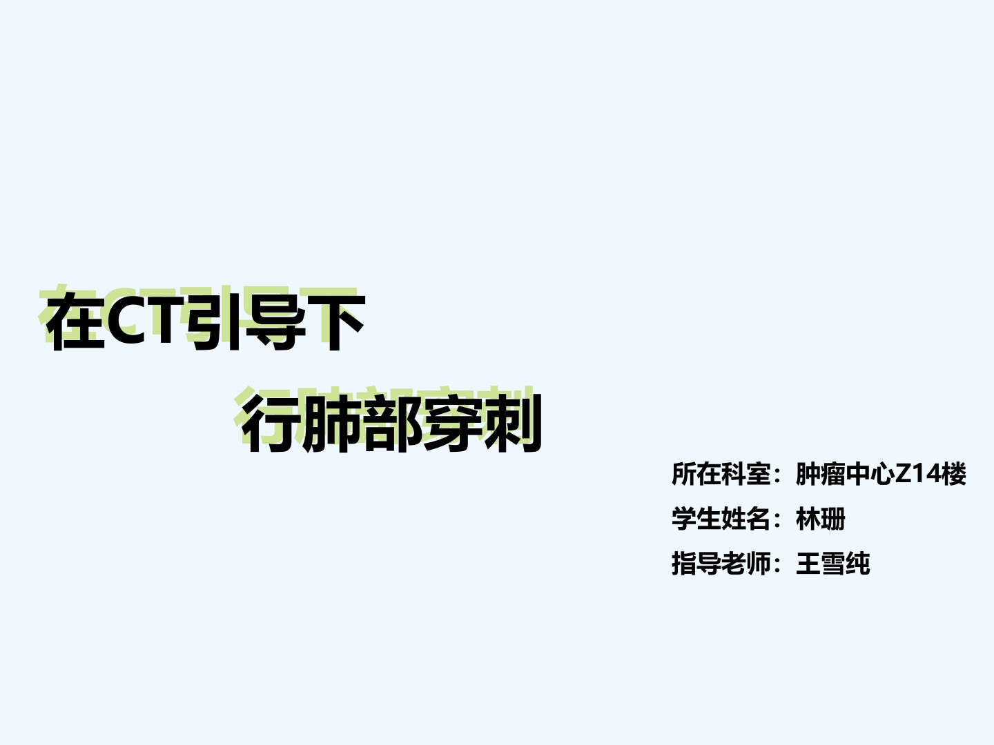 肿瘤中心Z14楼CT引导下肺部穿刺总结学生林珊在肿瘤中心Z14楼于指导老师王雪纯带领下了解CT引导下行肺部穿刺相关知识。肺穿刺多经皮进行用于胸膜腔脏层胸膜入肺分活检和治疗两类。CT引导下经皮肺穿刺活检是介入诊断领域新技术定位准确、损伤小、并发症少能清晰显示病变情况精确确定进针点、角度和深度安全性与准确性高适应症包括肺部结节等。操作时先CT扫描明确肿块情况并标记穿刺点再消毒麻醉用活检针穿刺并多次扫描调整最后激发活检枪取组织送检。其并发症主要有气胸和肺内出血多为少量可自行吸收。穿刺前要做好患者及家属思想工作训练呼吸建立静脉通道;穿刺后要让患者平睡、心电监护观察症状遵医嘱用药做好伤口观察及饮食护理。