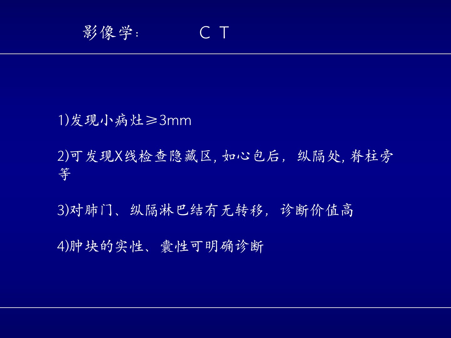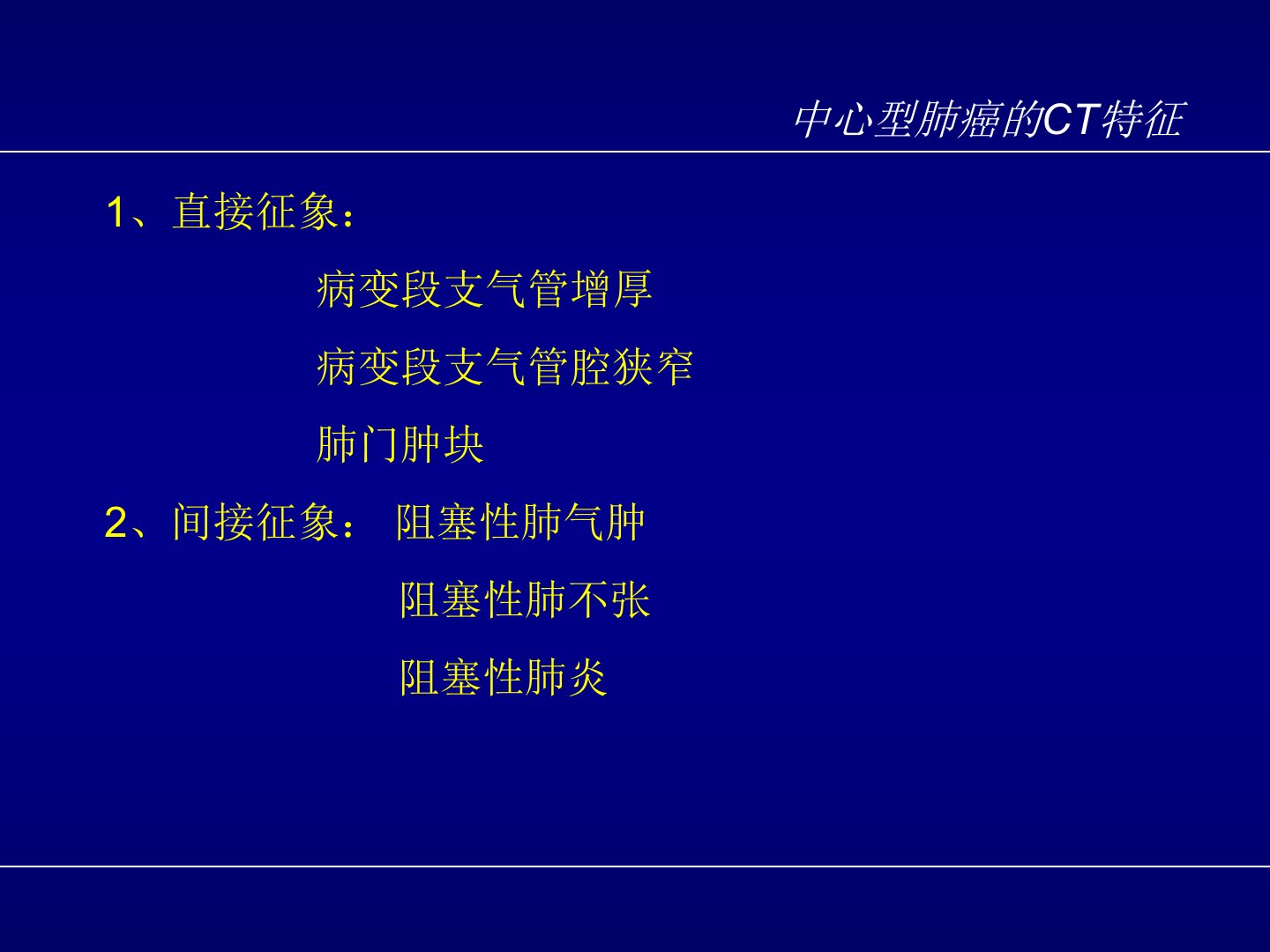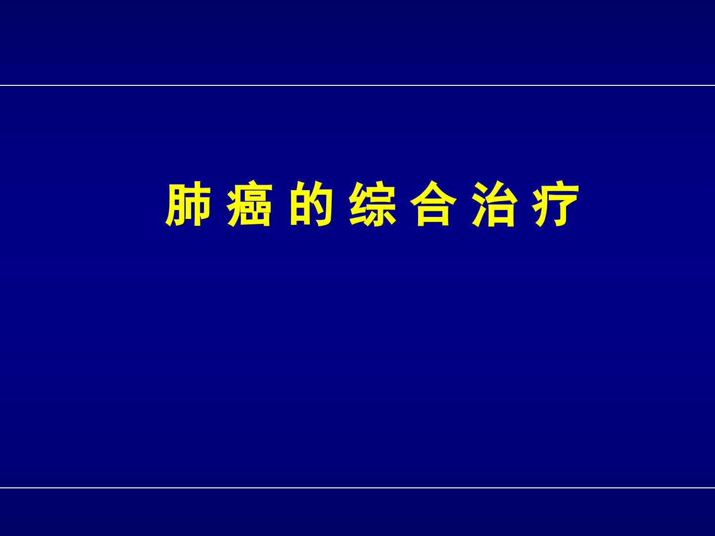 肺癌的综合治疗1)发现小病灶≥3mm2)可发现X线检查隐藏区,如心包后,纵隔处,脊柱旁等3)对肺门、纵隔淋巴结有无转移,诊断价值高4)肿块的实性、囊性可明确诊断影像学:CT中心型肺癌的CT特征1、直接征象:病变段支气管增厚病变段支气管腔狭窄肺门肿块2、间接征象:阻塞性肺气肿阻塞性肺不张阻塞性肺炎周围型肺癌CT特点毛刺征血管集束征:血管与肿块相连兔耳征:即胸膜牵拉征小泡征或空泡征分叶征:分叶基底部作一连线,分叶顶点到连线的距离与连线的长度之比,若大于1/3称为大分叶,小于1/3者为小分叶,若有多个分叶则以大分叶为其分叶特征空洞征或坏死征棘突征:病灶边缘出现细尖角状突起,肿瘤向周围生长所致毛玻璃征...