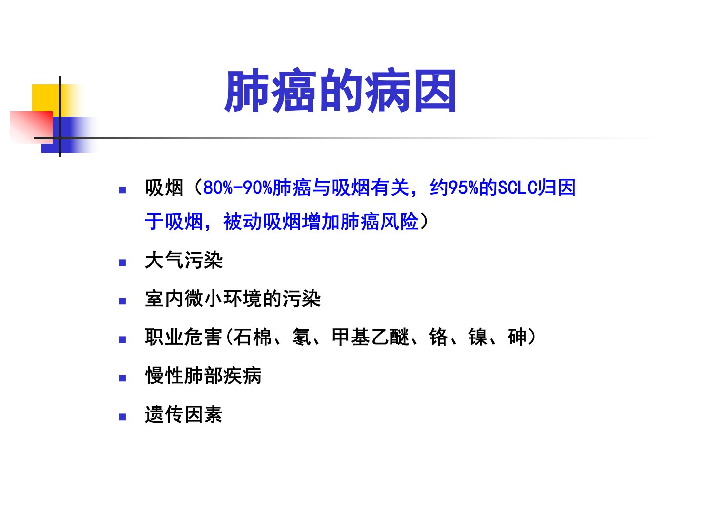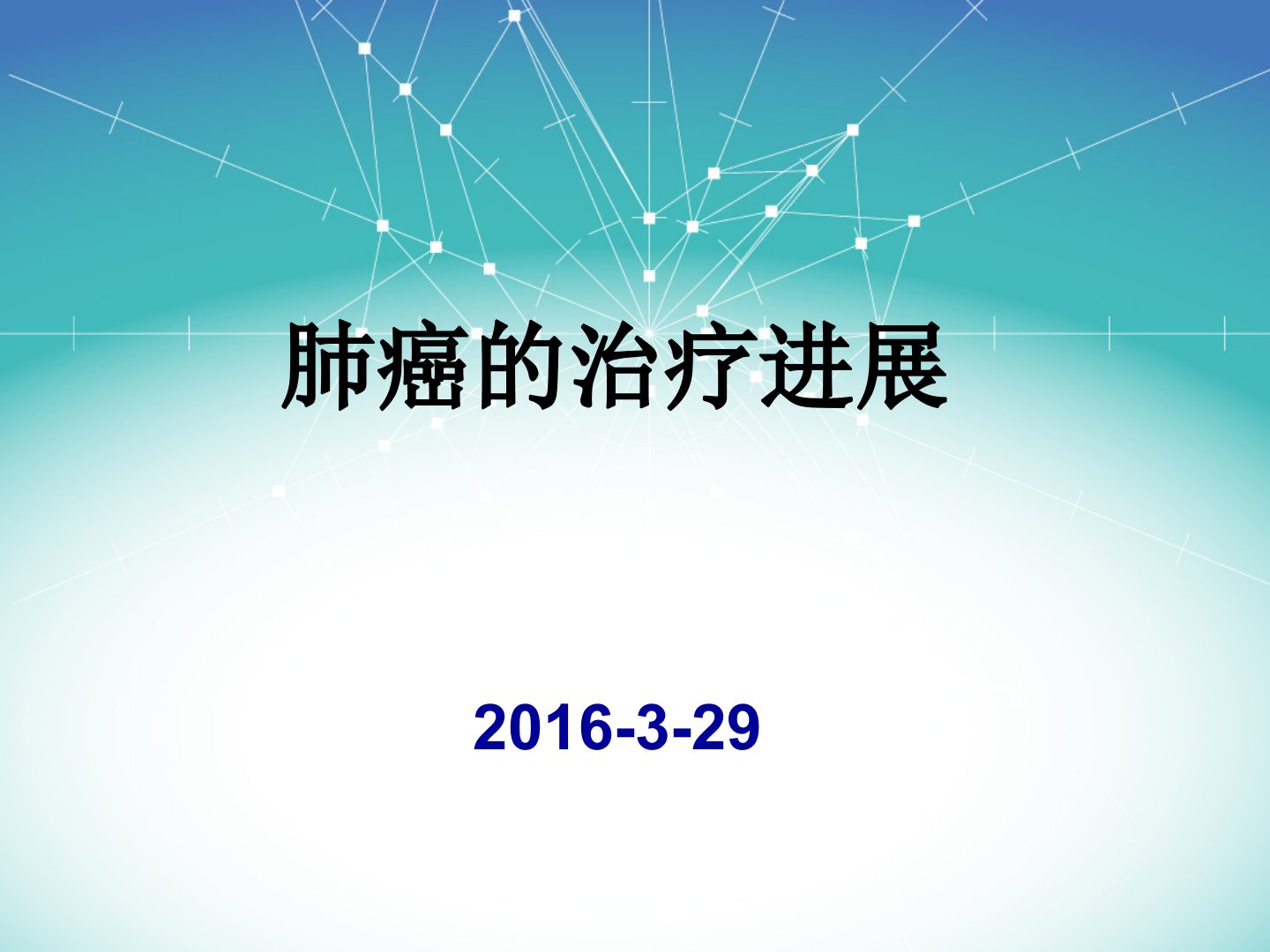 肺癌的治疗进展2016-3-29肺癌的病因吸烟(80%-90%肺癌与吸烟有关,约95%的SCLC归因于吸烟,被动吸烟增加肺癌风险)大气污染室内微小环境的污染职业危害(石棉、氡、甲基乙醚、铬、镍、砷)慢性肺部疾病遗传因素分类一、解剖学分类中央型肺癌:发生在段支气管至主支气管的癌肿,约占3/4,以鳞癌和小细胞癌多见.周围型肺癌:发生在段支气管以下的癌肿,约占1/4,以腺癌多见.二、病理学分类:小细胞肺癌:(15-20%)非小细胞肺癌:(80-85%)鳞癌腺癌大细胞癌腺鳞癌其它肺癌各病理类型特点403025154035351515咳嗽呼吸困难胸痛咯血体重减轻全身虚弱缺乏食欲发热贫血发生频率(%)NS...