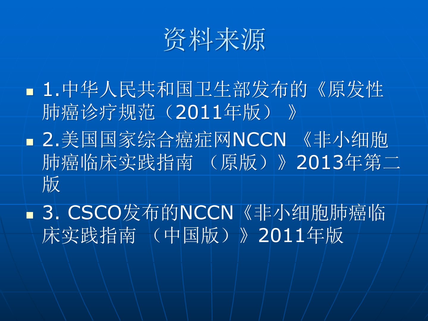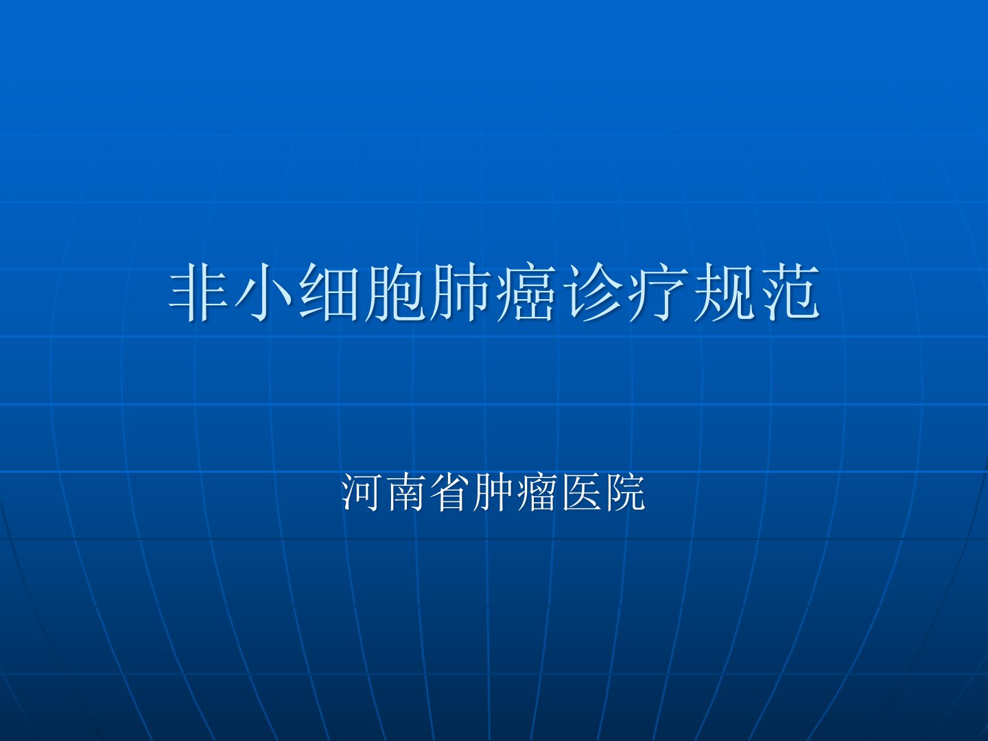 非小细胞肺癌诊疗规范河南省肿瘤医院 资料来源1.中华人民共和国卫生部发布的《原发性肺癌诊疗规范(2011年版)》2.美国国家综合癌症网NCCN《非小细胞肺癌临床实践指南(原版)》2013年第二版3.CSCO发布的NCCN《非小细胞肺癌临床实践指南(中国版)》2011年版提纲1.流行病学概述2.诊断技术与应用3.分期4.治疗流行病学概述肺癌是我国最常见的恶性肿瘤之一。2010年卫生统计年鉴显示,2005年,肺癌死亡率占我国恶性肿瘤死亡率的第1位。美国肿瘤流行病情况Cancerstatistics,2013CA:ACancerJournalforCliniciansVolume63,Issue1...