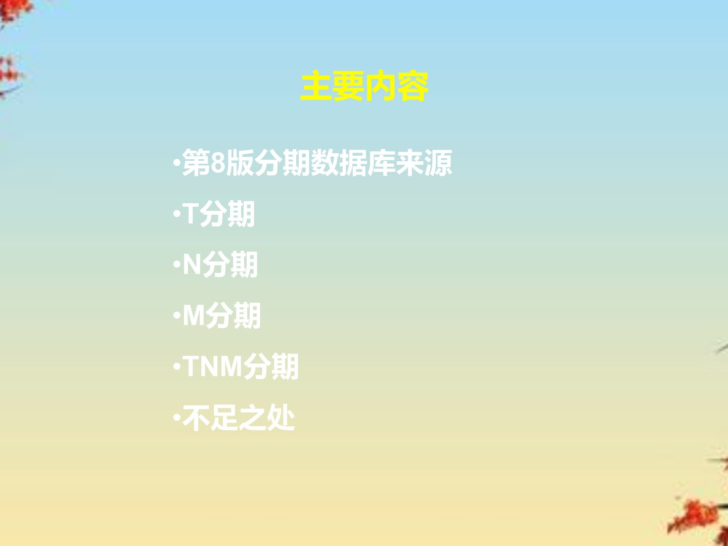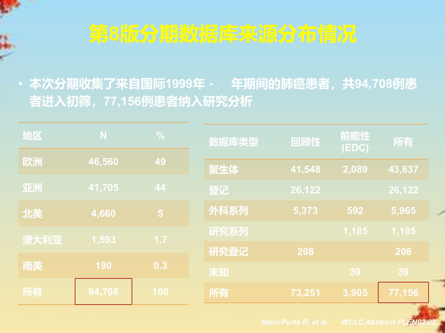 肺癌新分期及解读主要内容第8版分期数据库来源T分期N分期M分期TNM分期不足之处第8版分期数据库来源分布情况本次分期收集了来自国际1999年-年期间的肺癌患者,共94,708例患者进入初筛,77,156例患者纳入研究分析Rami-PortaR,etal.WCLCAbstractPLEN02.02.第7版和第8版M分期对比Rami-PortaR,etal.肿瘤大小对分期更加重要所有研究群体中,累及主支气管且距离隆突≥2cm与其他因素T2预后一致,生存差异无统计学意义;(所有病例进行COXPH回归分析)(所有病例进行COXPH回归分析)lllC:T3-4N3M0GoldstrawP,etal.N2...