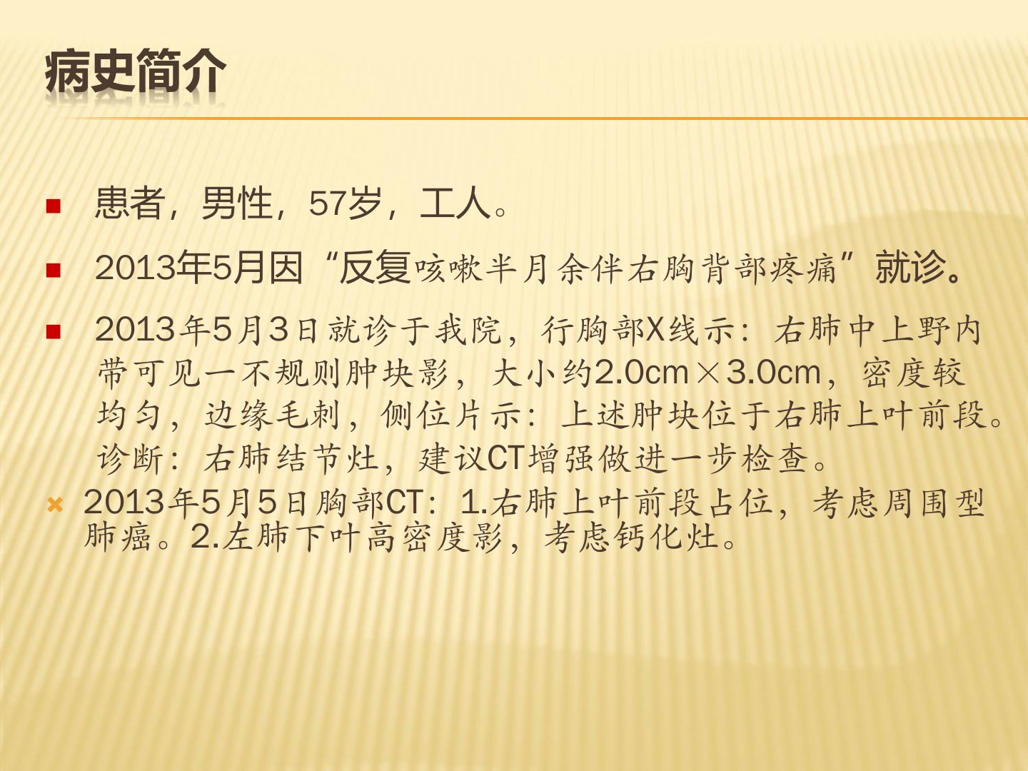 患者男性57岁工人因“反复咳嗽半月余伴右胸背部疼痛”就诊。胸部X线及CT检查示右肺上叶前段占位考虑周围型肺癌左肺下叶钙化灶。患者无高血压、冠心病、糖尿病(口服二甲双胍控制可)等病史吸烟30余年。入院常规检查未见异常肿瘤标志物升高。入院诊断为右肺占位(肺癌?)。因患者拒绝手术故行穿刺活检明确病变性质并行消融治疗。术后病理确诊为肺腺癌(cT2aN0M0IB期)。患者术后出现少量气胸和间断发热予中药对症处理后症状缓解。四周后复查强化CT扫描显示治疗区域略增大但无血管强化肿瘤标志物有所下降。鉴于患者临床分期IB期且有高危因素建议术后辅助化疗。化疗四周期后复查肿瘤缩小形成瘢痕肿瘤标志物进一步下降。追访患者一般情况稳定病情稳定。微波消融治疗具有消融时间短、稳定性好、副作用少等优点。讨论环节关注了患者CEA未降至正常是否需局部追加治疗的问题。