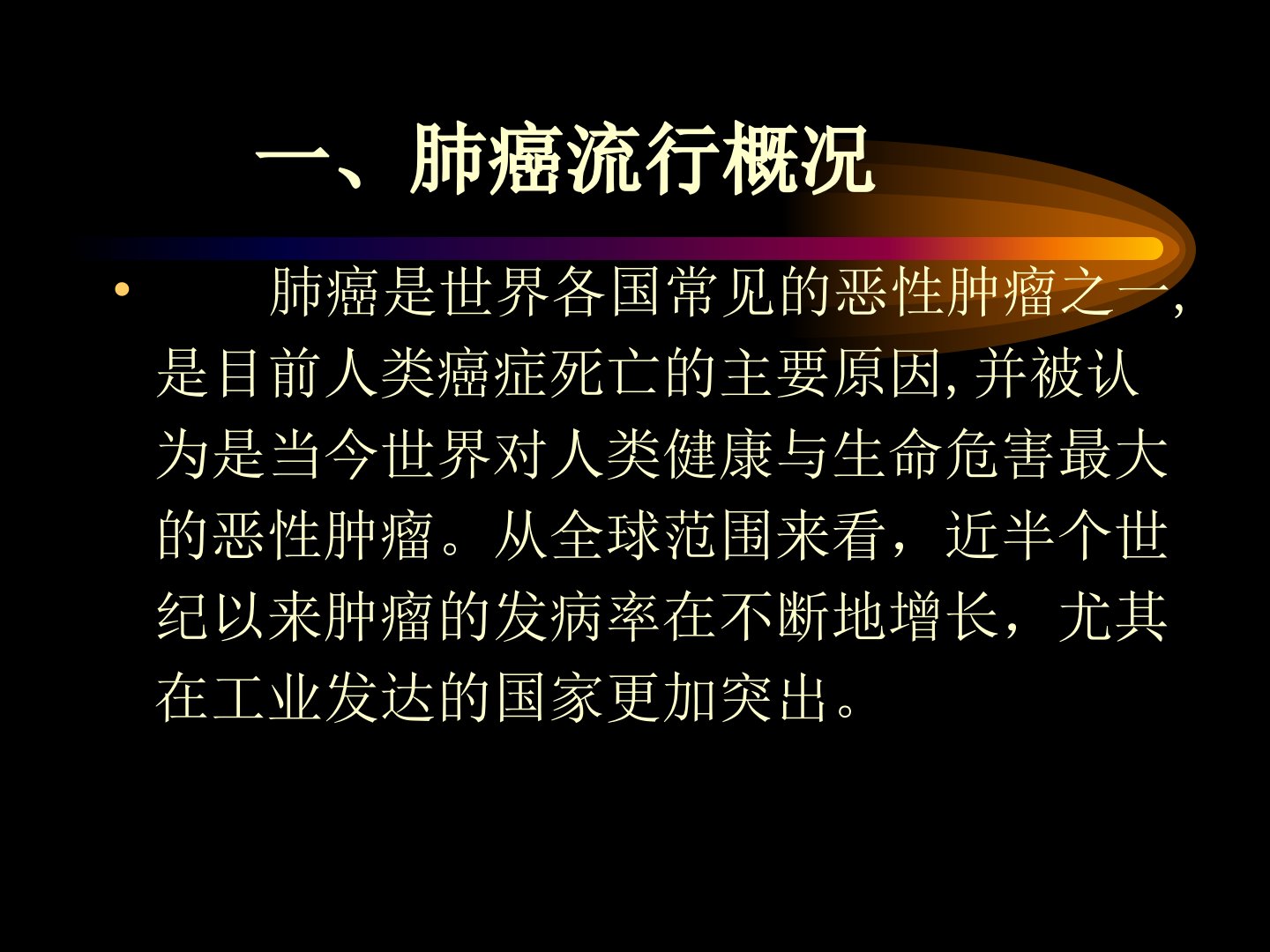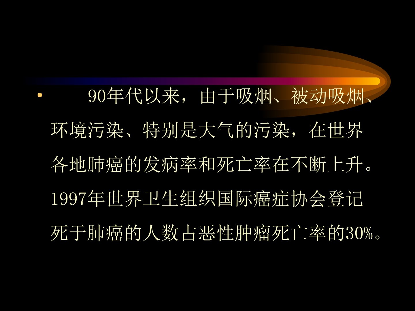 肺癌外科治疗的新进展一、肺癌流行概况肺癌是世界各国常见的恶性肿瘤之一,是目前人类癌症死亡的主要原因,并被认为是当今世界对人类健康与生命危害最大的恶性肿瘤。从全球范围来看,近半个世纪以来肿瘤的发病率在不断地增长,尤其在工业发达的国家更加突出。90年代以来,由于吸烟、被动吸烟、环境污染、特别是大气的污染,在世界各地肺癌的发病率和死亡率在不断上升。1997年世界卫生组织国际癌症协会登记死于肺癌的人数占恶性肿瘤死亡率的30%。美国1990年肺癌的发病数为15.4.万人,死亡14.6万人。英国肺癌男性发病为62.4/10万,女性为22。8/10万;加拿大男性发病为65.4/10万,女性28.0/10万。...