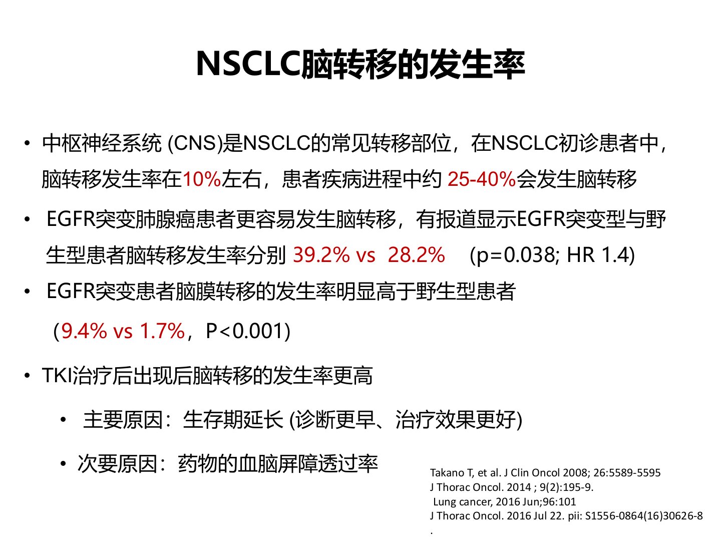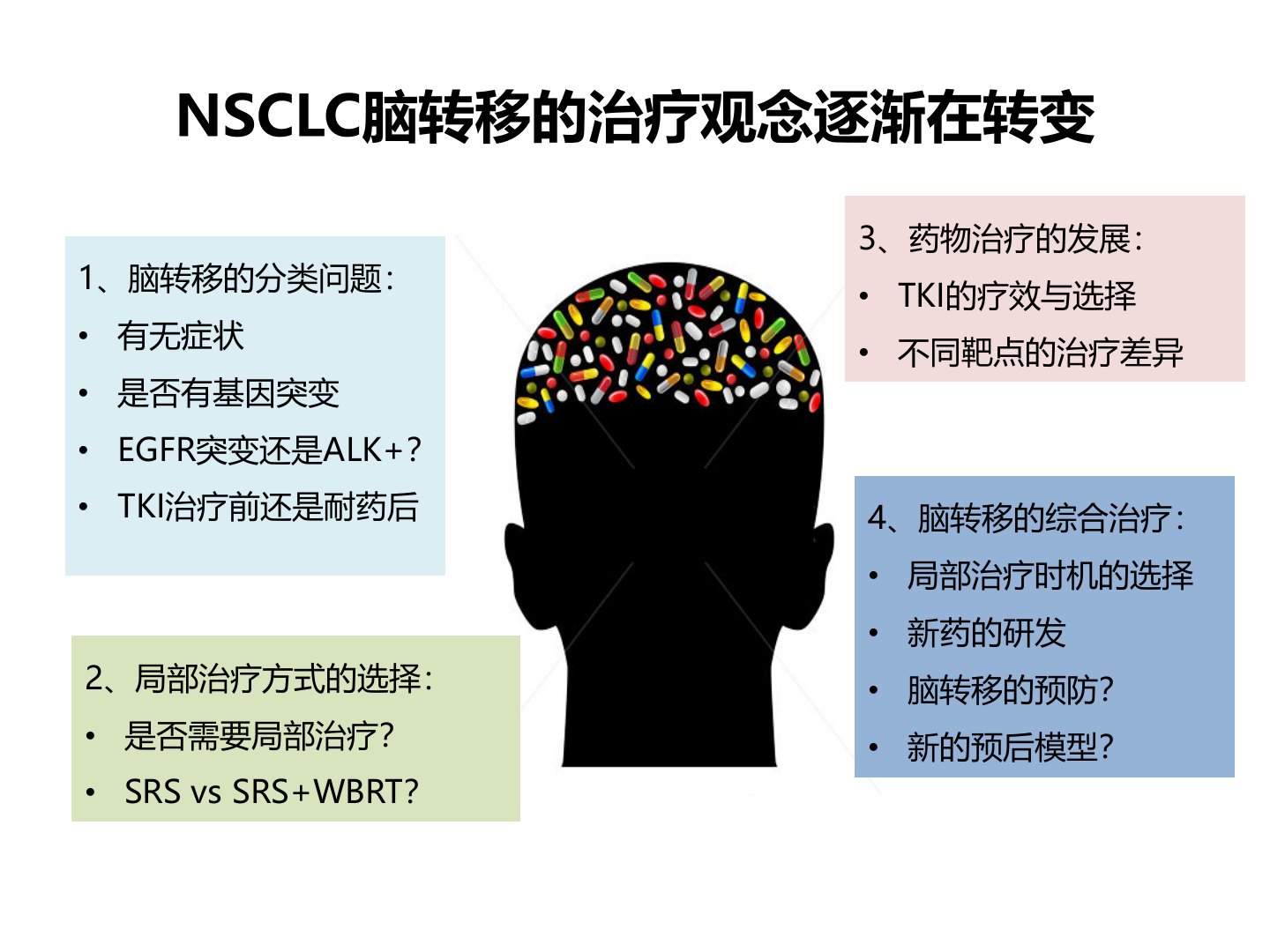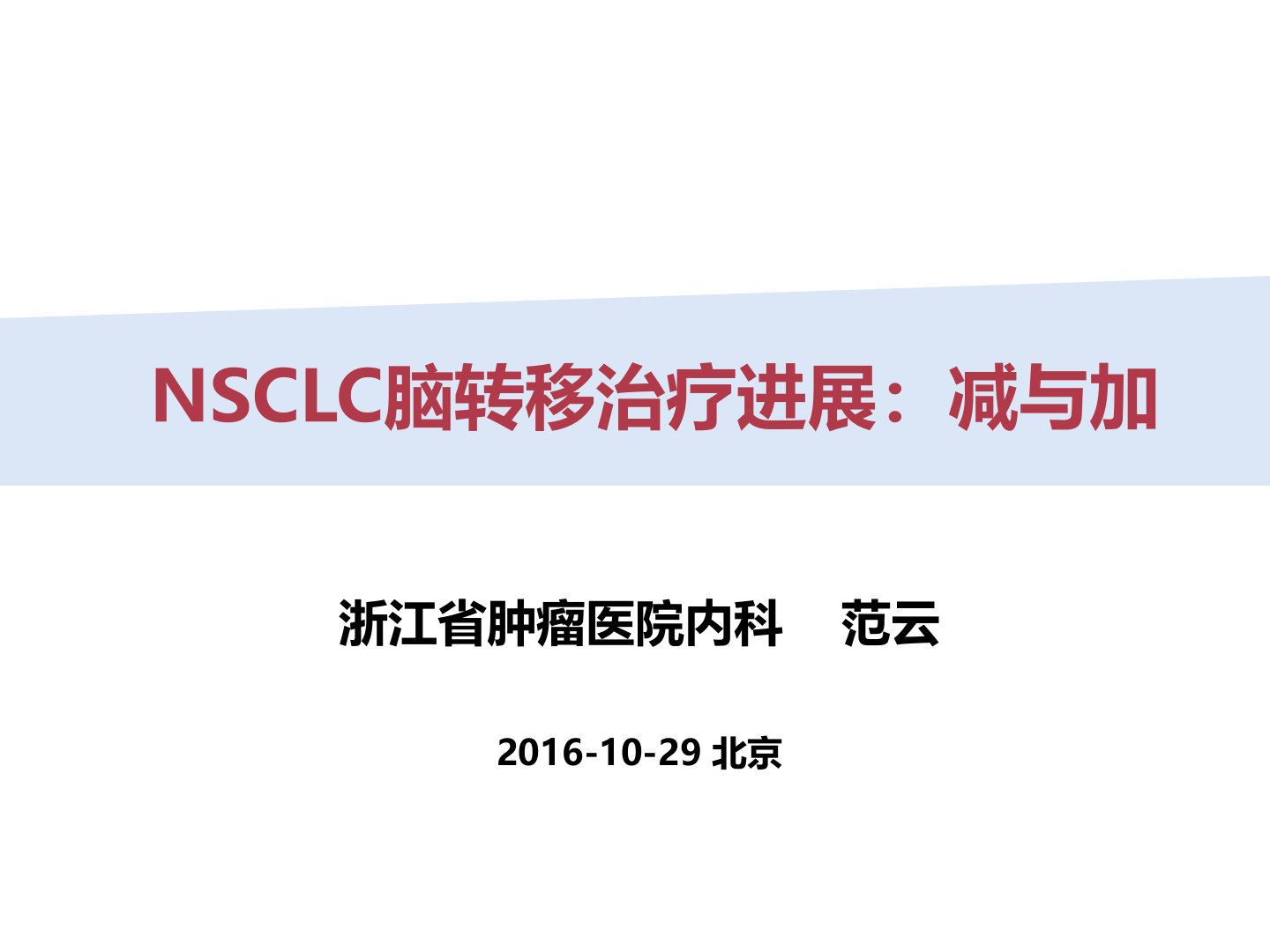 NSCLC脑转移治疗进展:减与加浙江省肿瘤医院内科范云于2016年10月29日在北京分享了NSCLC脑转移治疗进展。脑转移是NSCLC的常见转移部位初诊患者中发生率约10疾病进程中约2540会发生脑转移EGFR突变肺腺癌患者更易发生。在治疗方面观念逐渐转变涉及脑转移分类、局部治疗方式选择、药物治疗发展及综合治疗等问题。局部治疗方式中SRS与WBRT的对比研究显示SRSWBRT虽提高颅内病灶局部控制率但未改善总生存且导致患者认知功能下降。对于脑转移患者SRS单独应用可能是一种可行的治疗策略。同时手术后的研究显示SRS提高局控率但未改善OS。化疗方面脑转移瘤化疗整体疗效差有效性取决于肿瘤本身对化疗的敏感程度。在靶向治疗方面有驱动基因的脑转移患者若无神经系统症状可考虑靶向药物治疗。目前埃克替尼、奥希替尼、AZD3759等新药展现出良好潜力BLOOM等研究正在评估其安全性和疗效。此外Pembrolizumab在治疗NSCLC和黑色素瘤脑转移方面也显示出活性。