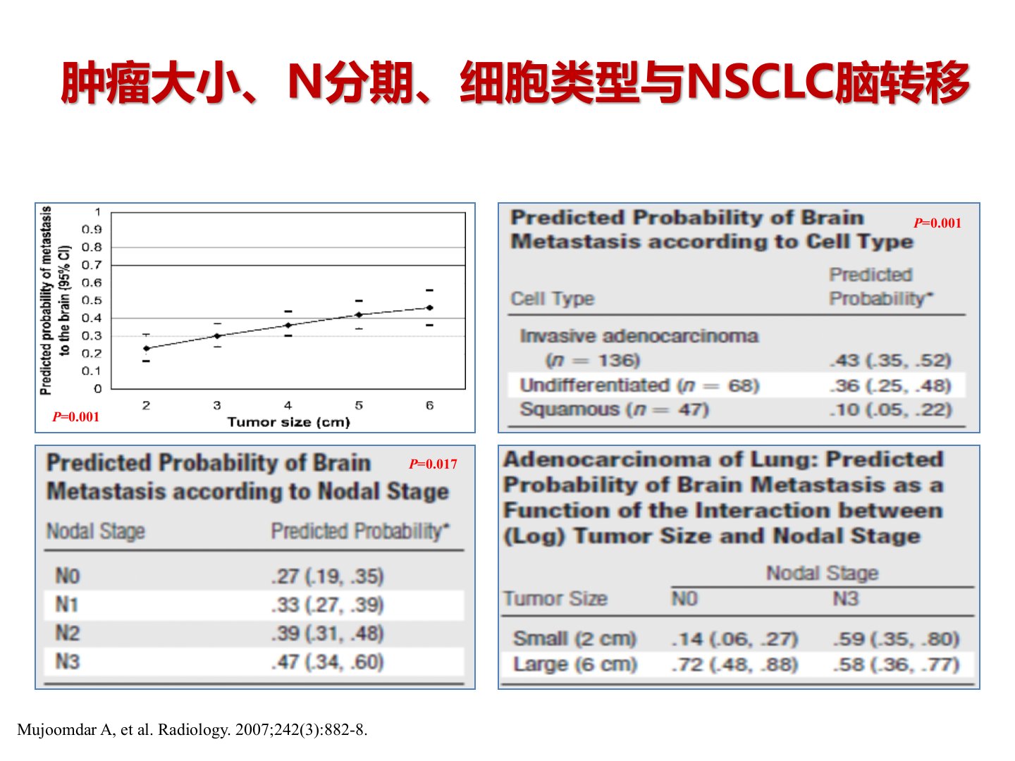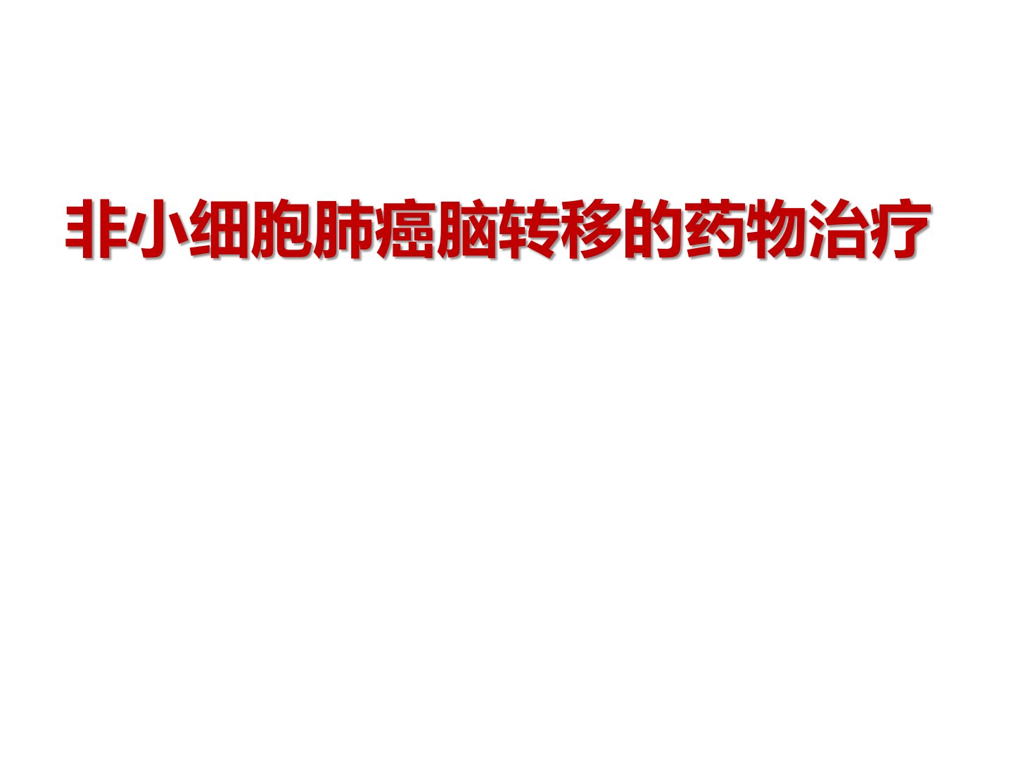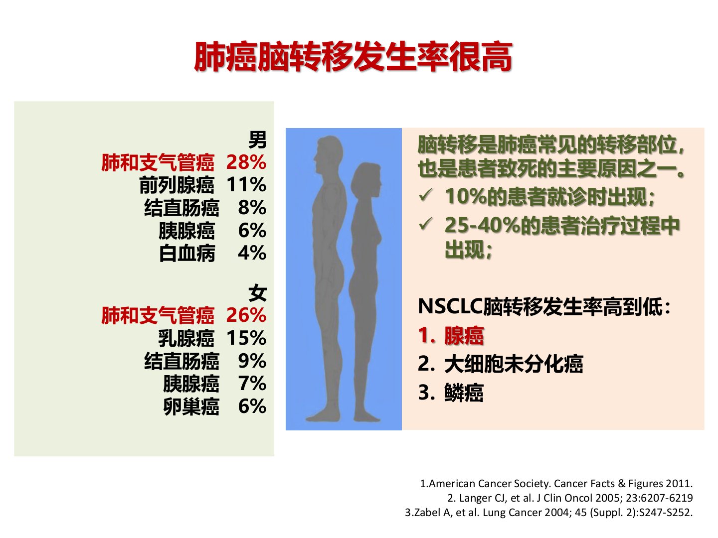 非小细胞肺癌脑转移的药物治疗肺癌脑转移发生率很高脑转移是肺癌常见的转移部位,也是患者致死的主要原因之一。10%的患者就诊时出现;25-40%的患者治疗过程中出现;NSCLC脑转移发生率高到低:腺癌大细胞未分化癌鳞癌男肺和支气管癌28%前列腺癌11%结直肠癌8%胰腺癌6%白血病4%女肺和支气管癌26%乳腺癌15%结直肠癌9%胰腺癌7%卵巢癌6%1.AmericanCancerSociety.CancerFacts&Figures2011.2.LangerCJ,etal.JClinOncol2005;23:6207-62193.ZabelA,etal.LungCancer2004;45(Suppl...